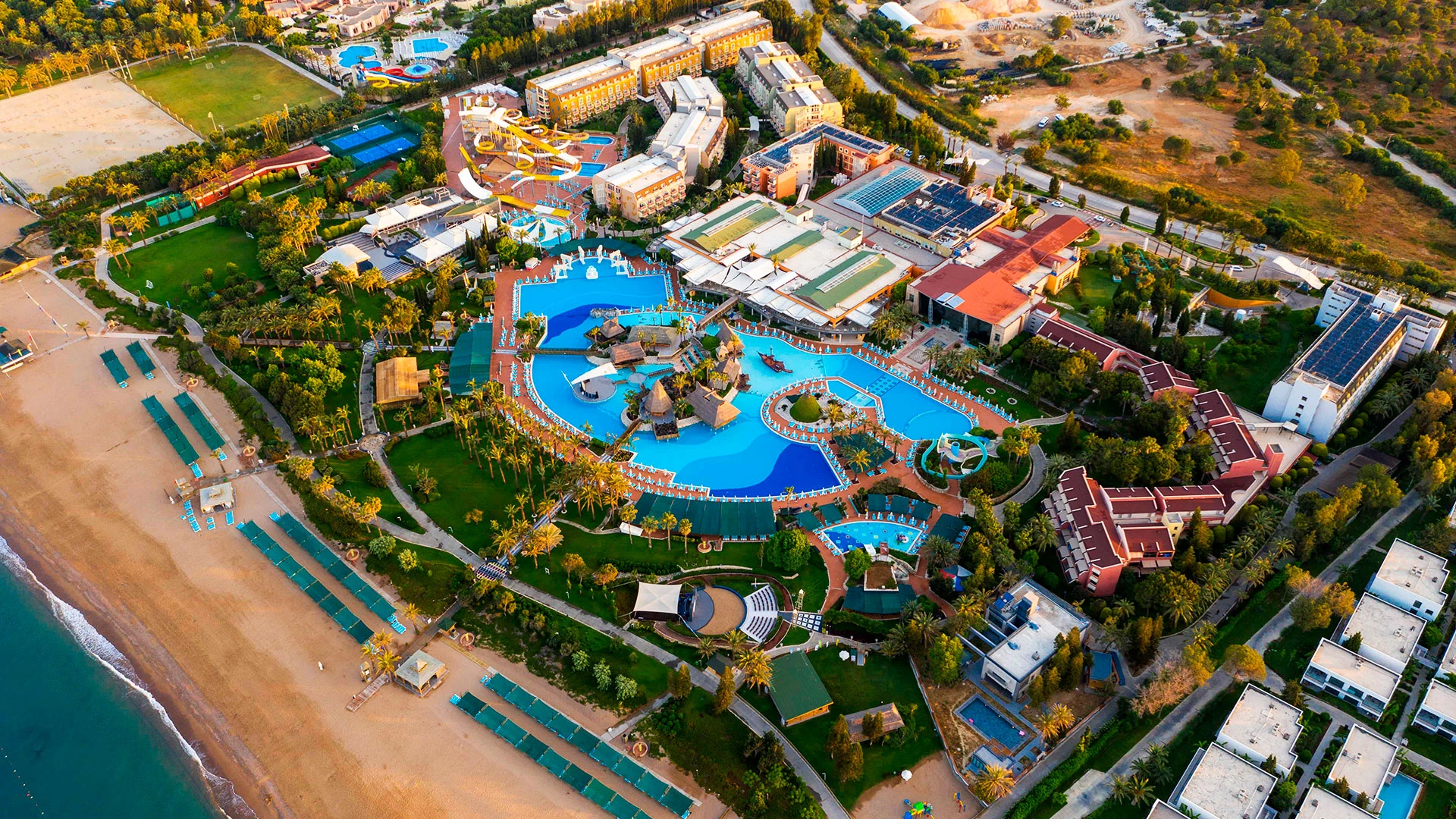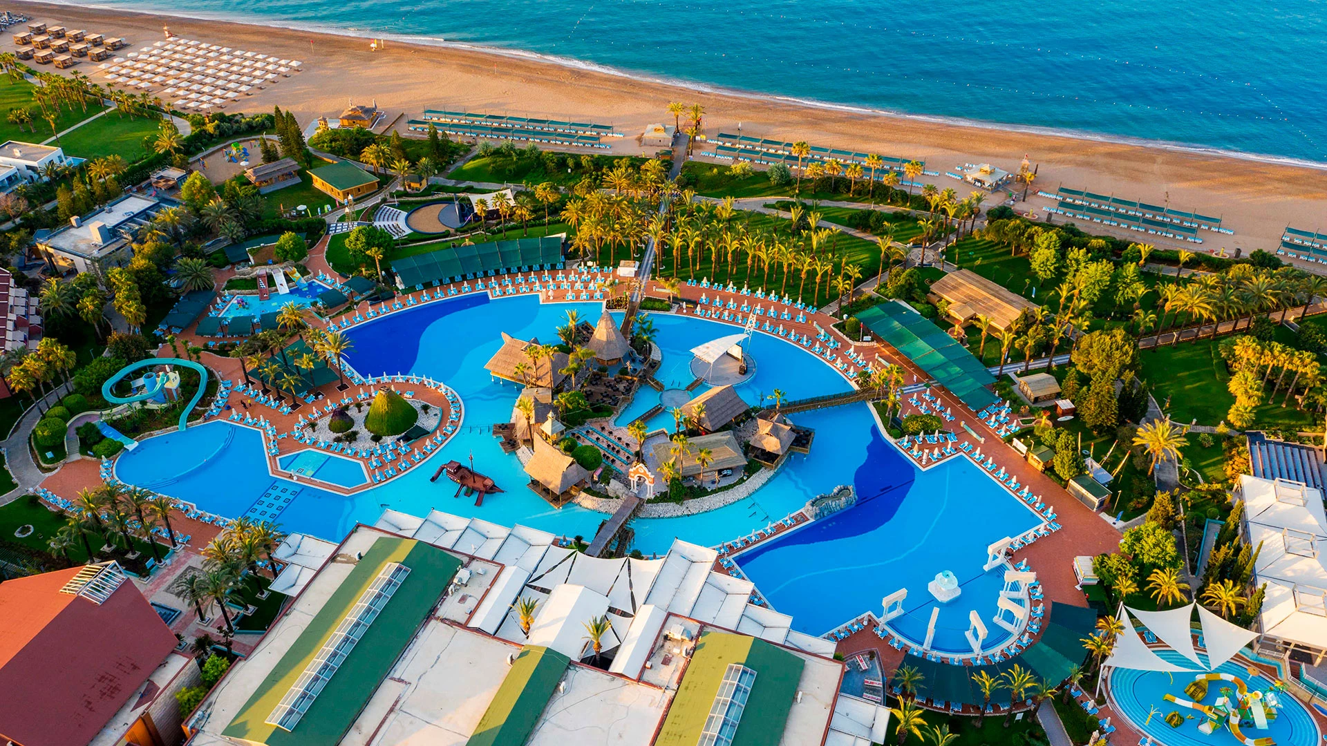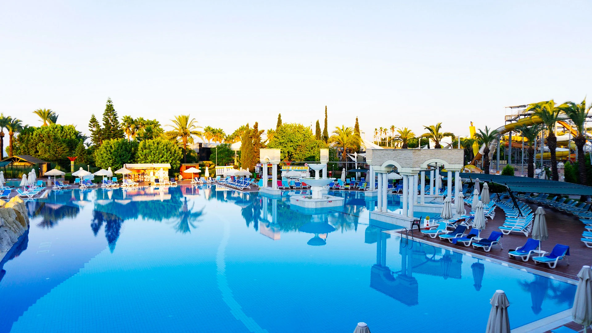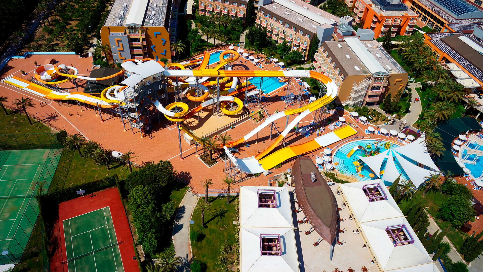 Комплексът разполага с огромна зона с басейни, включително впечатляващ аквапарк с множество водни пързалки, както и закрит басейн. Гостите могат да се насладят на собствен плаж, просторни тераси за слънчеви бани и разнообразни дневни и вечерни анимационни програми. За най-малките е предвиден детски клуб с множество занимания.