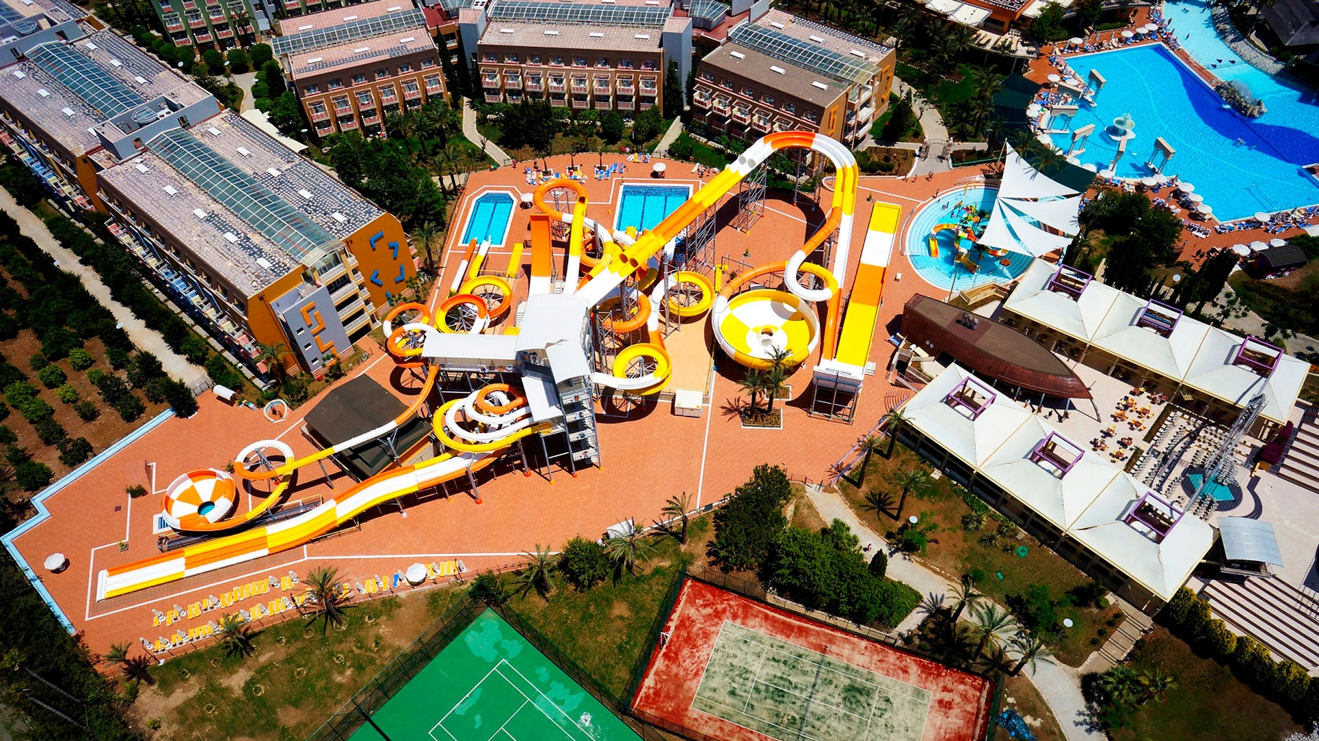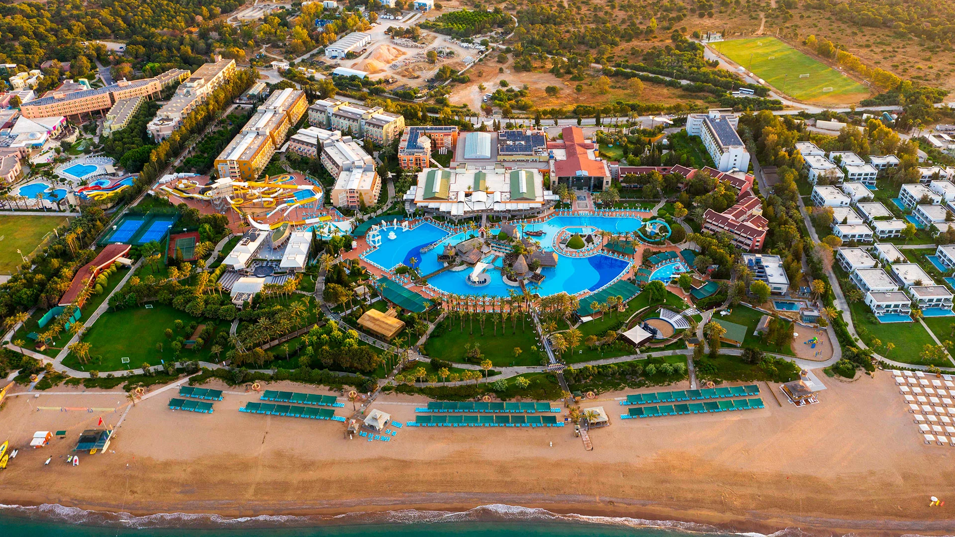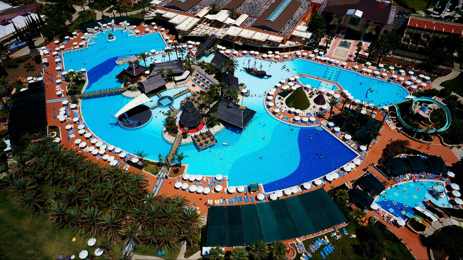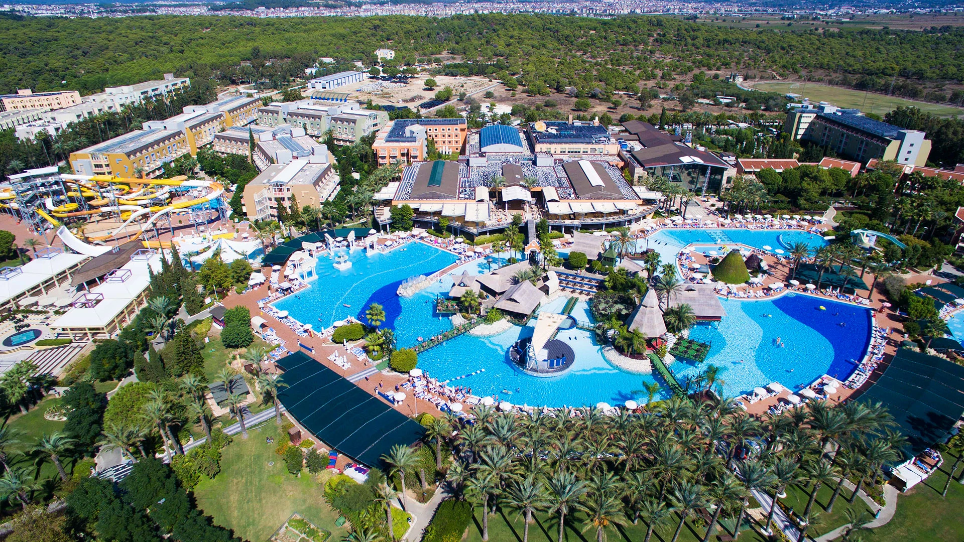Комплексът разполага с огромна зона с басейни, включително впечатляващ аквапарк с множество водни пързалки, както и закрит басейн. Гостите могат да се насладят на собствен плаж, просторни тераси за слънчеви бани и разнообразни дневни и вечерни анимационни програми. За най-малките е предвиден детски клуб с множество занимания.