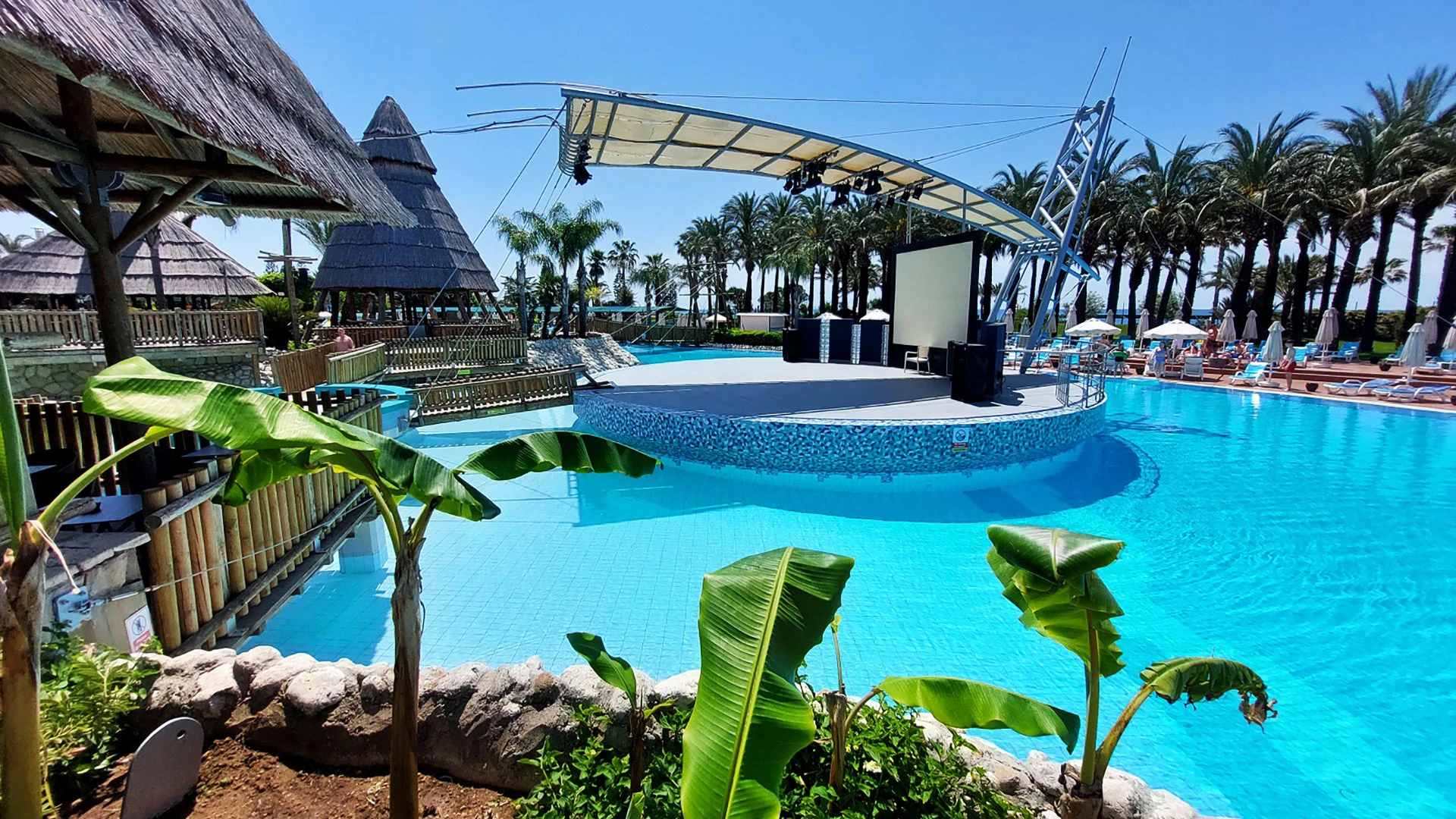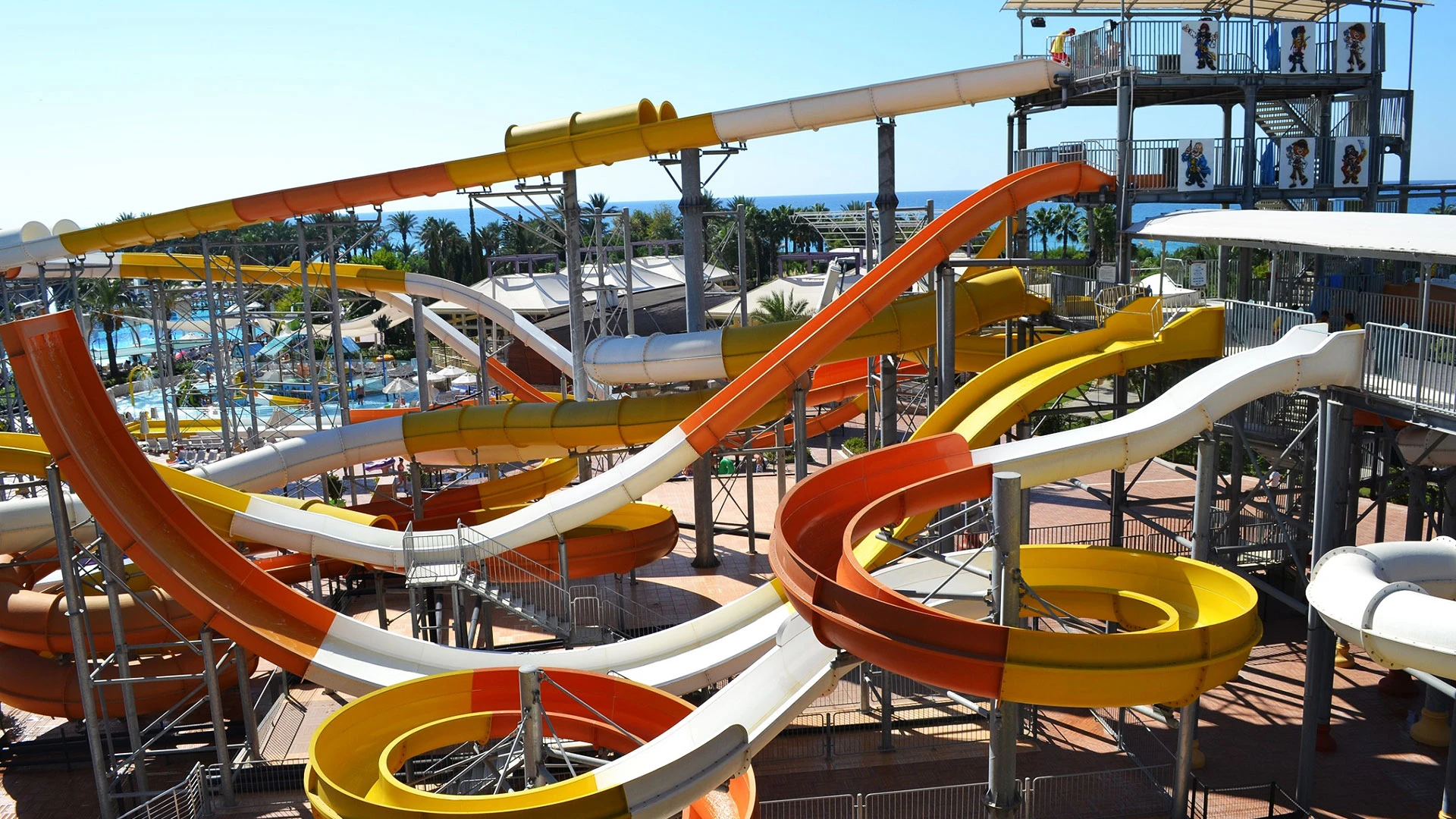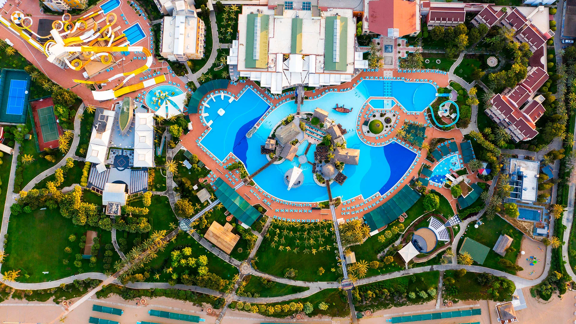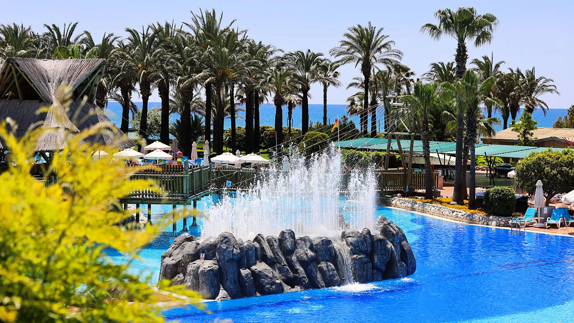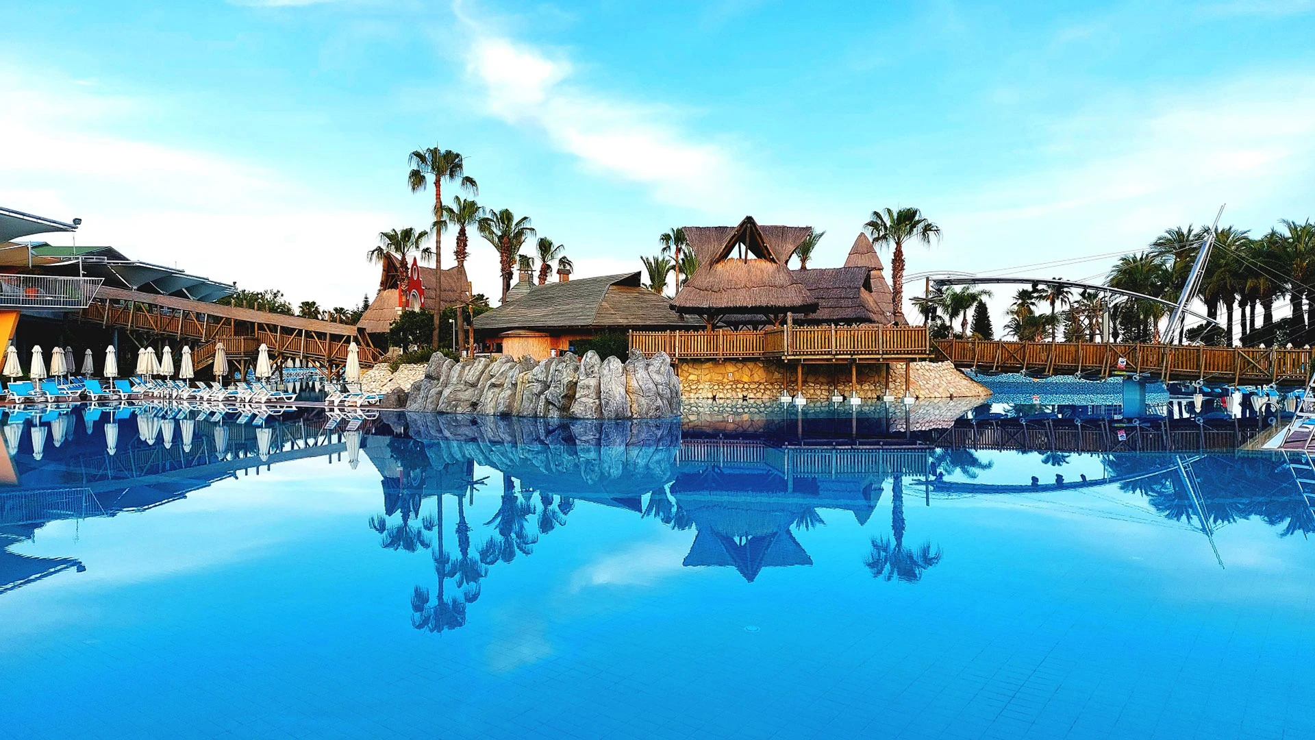 Комплексът разполага с огромна зона с басейни, включително впечатляващ аквапарк с множество водни пързалки, както и закрит басейн. Гостите могат да се насладят на собствен плаж, просторни тераси за слънчеви бани и разнообразни дневни и вечерни анимационни програми. За най-малките е предвиден детски клуб с множество занимания.
