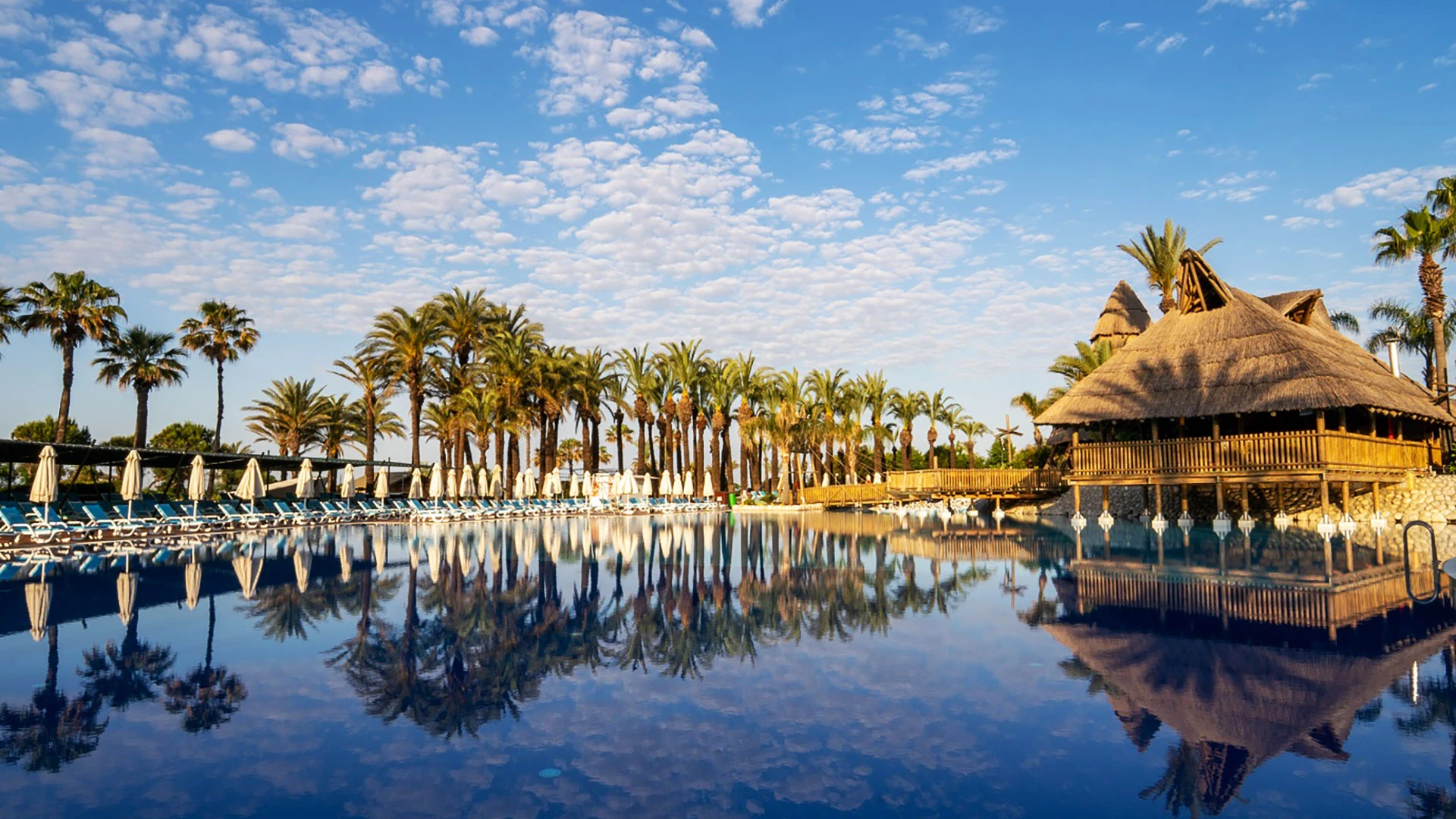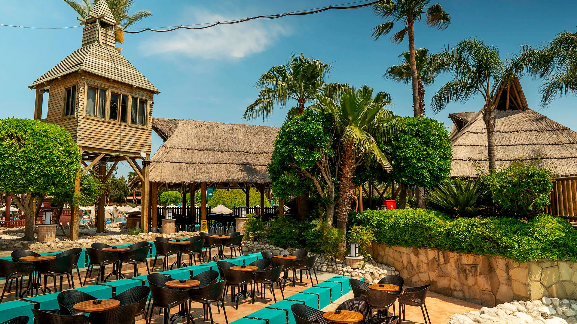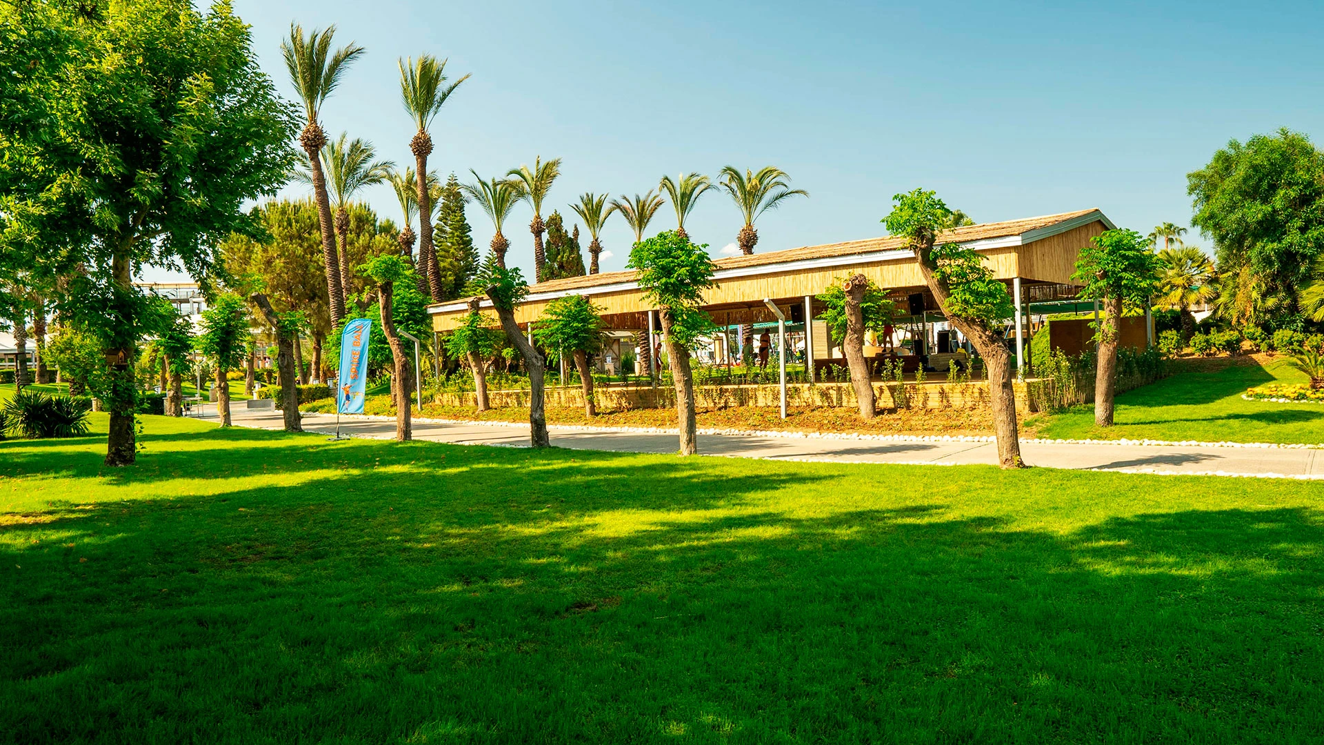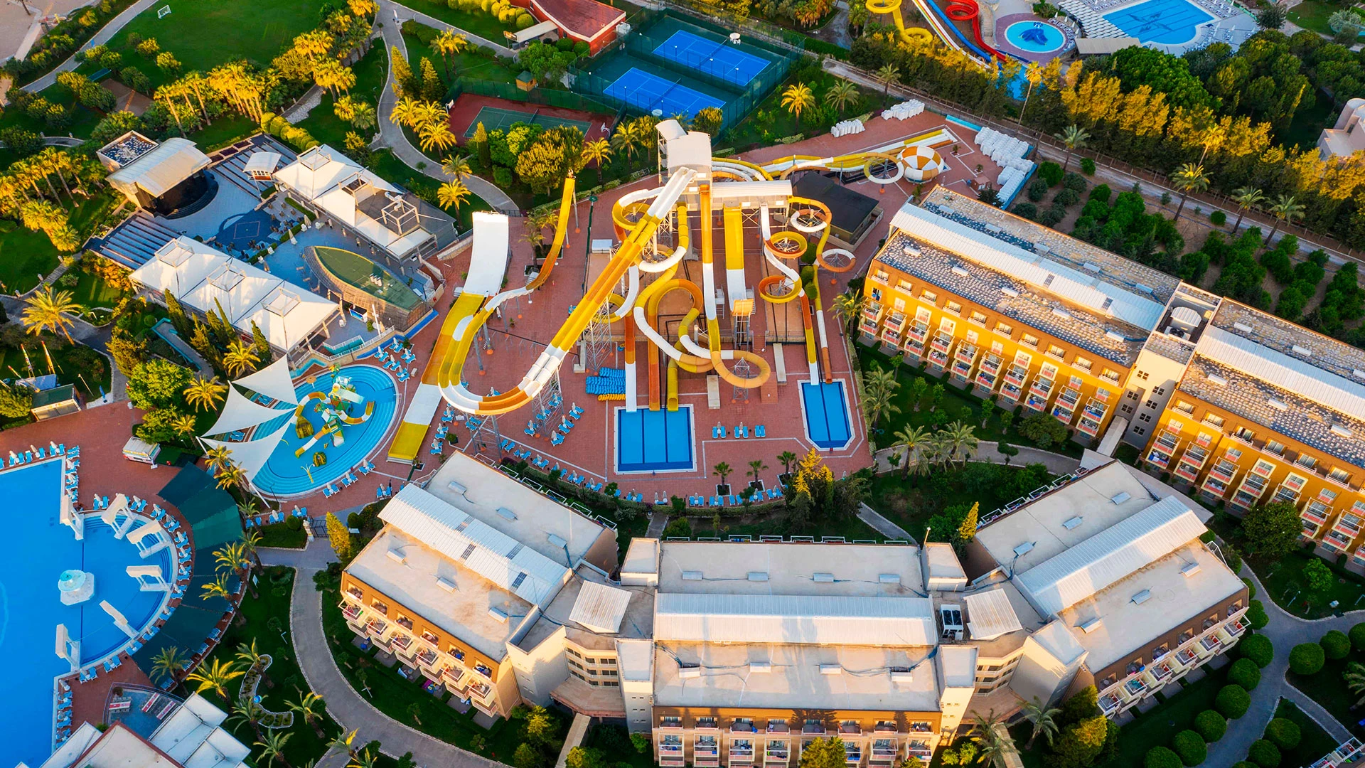 Комплексът разполага с огромна зона с басейни, включително впечатляващ аквапарк с множество водни пързалки, както и закрит басейн. Гостите могат да се насладят на собствен плаж, просторни тераси за слънчеви бани и разнообразни дневни и вечерни анимационни програми. За най-малките е предвиден детски клуб с множество занимания.