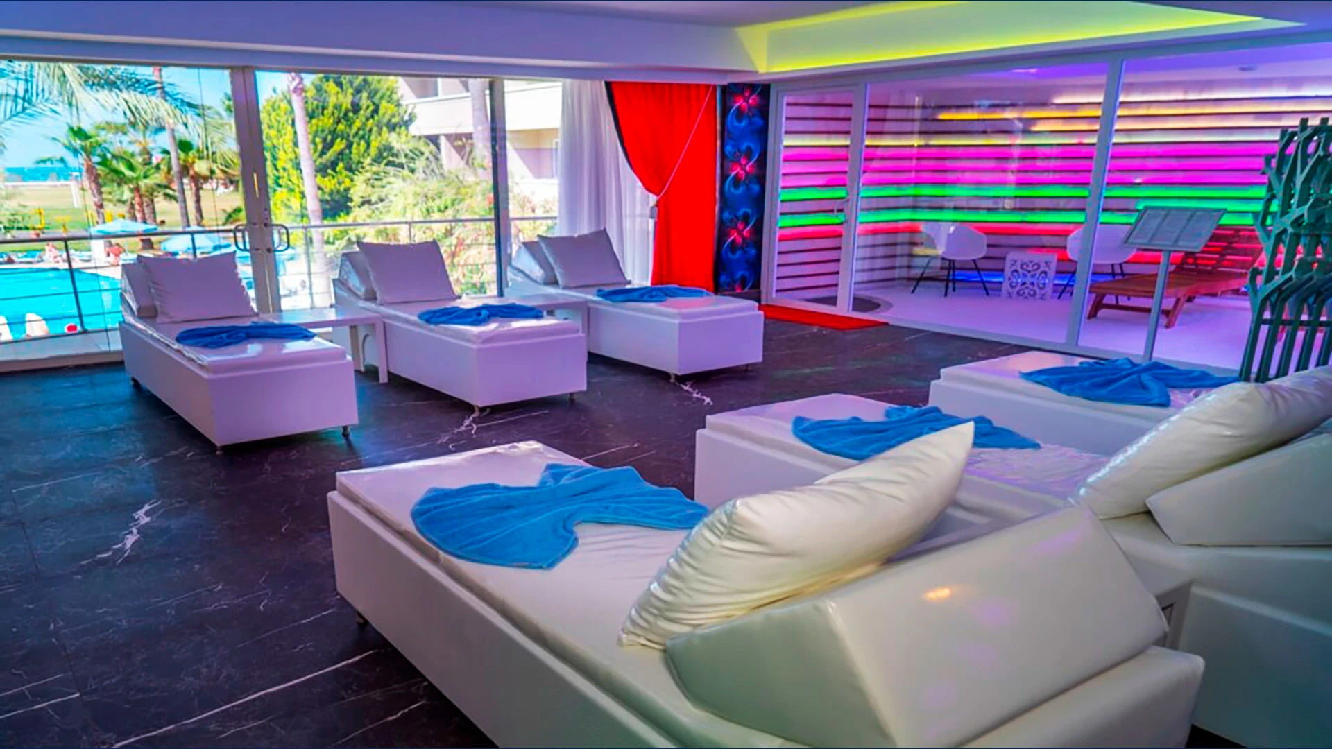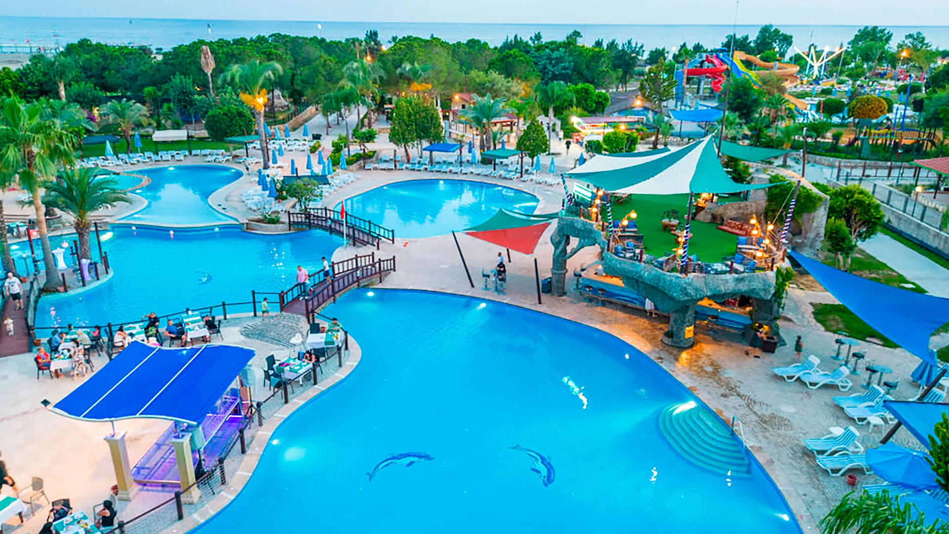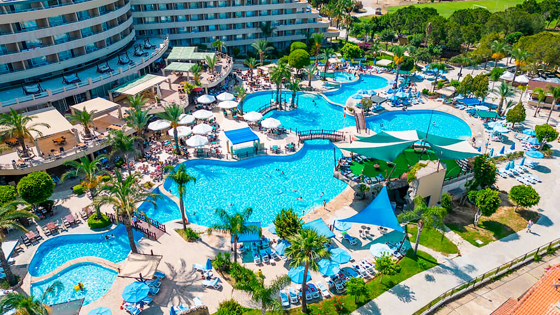 - Басейни: няколко открити басейна + поне един закрит басейн, плюс детски басейн.