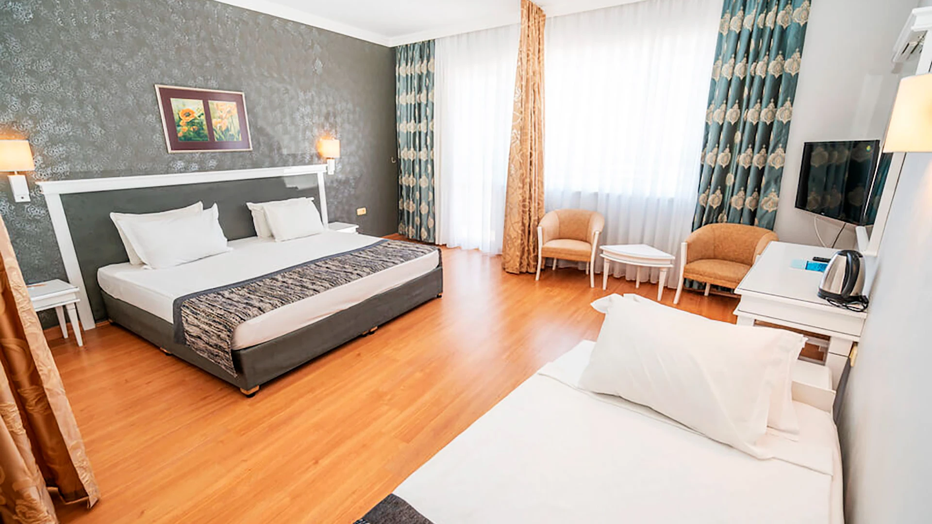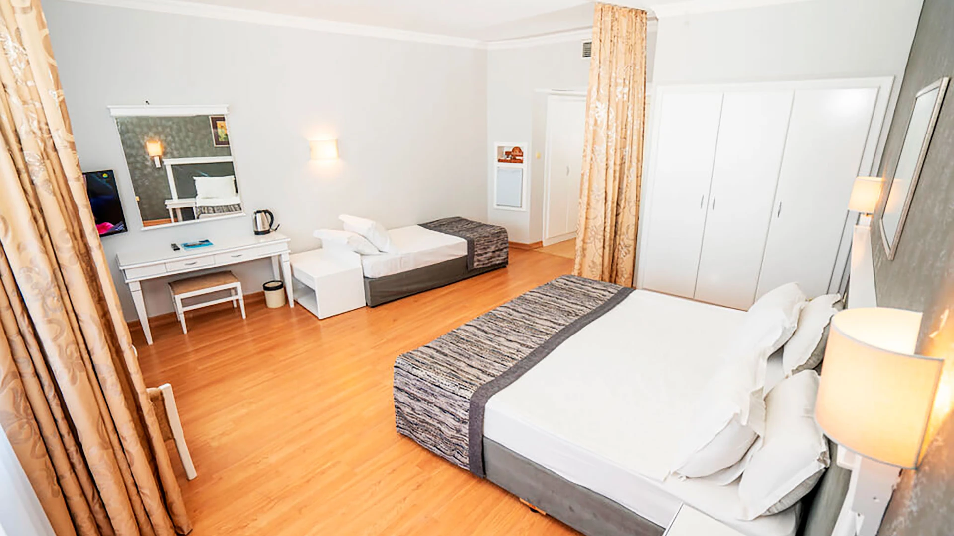 - Видове стаи: стандартни, големи (“Large Room”), семейни (“Family Room”) — обикновено с 2 легла или двойно + единично/разтегателен, подходящи за семейства