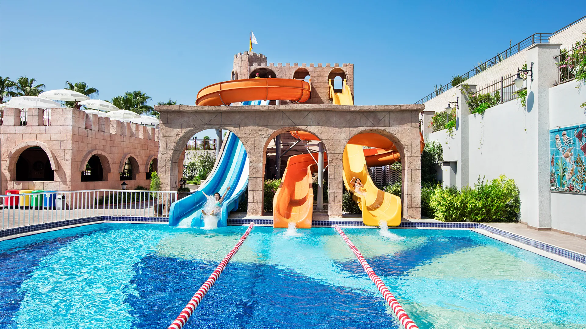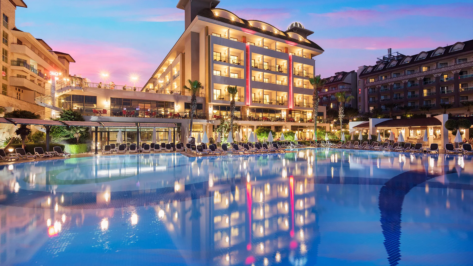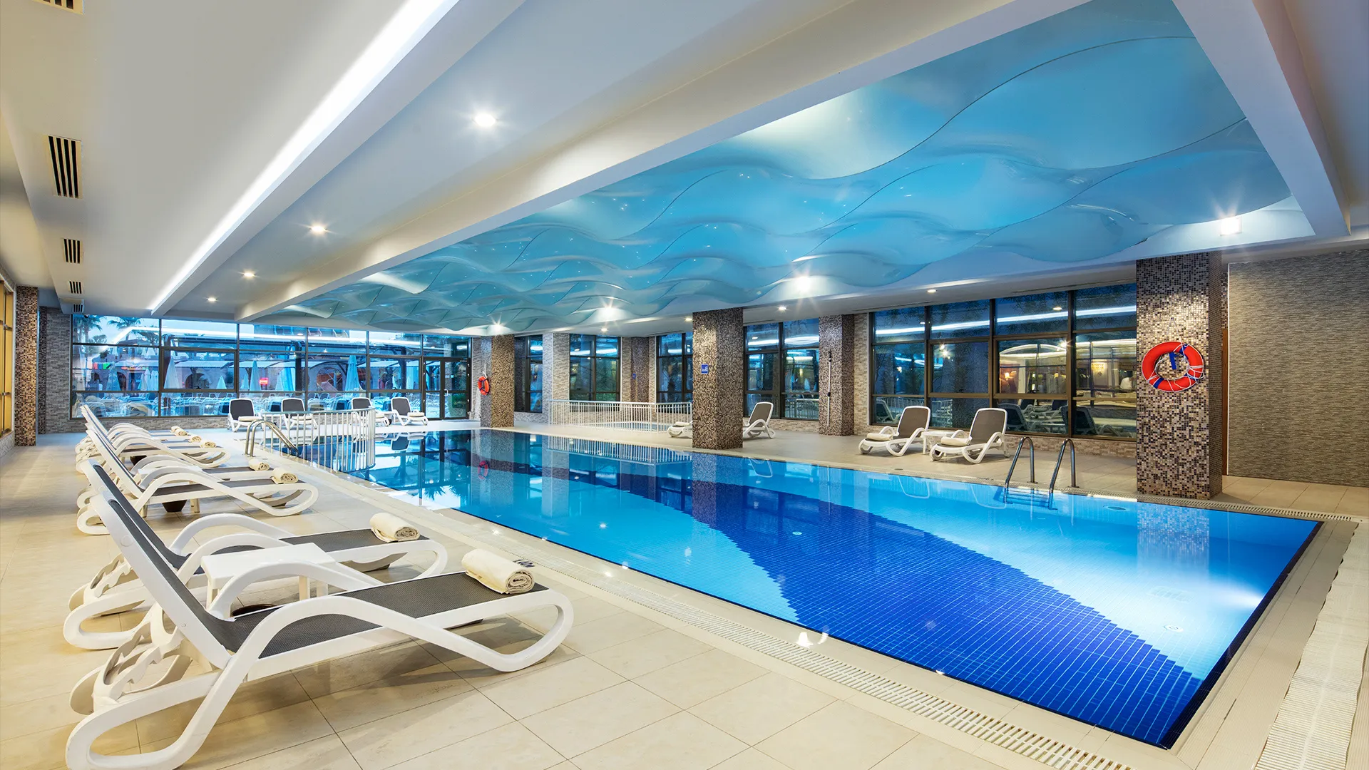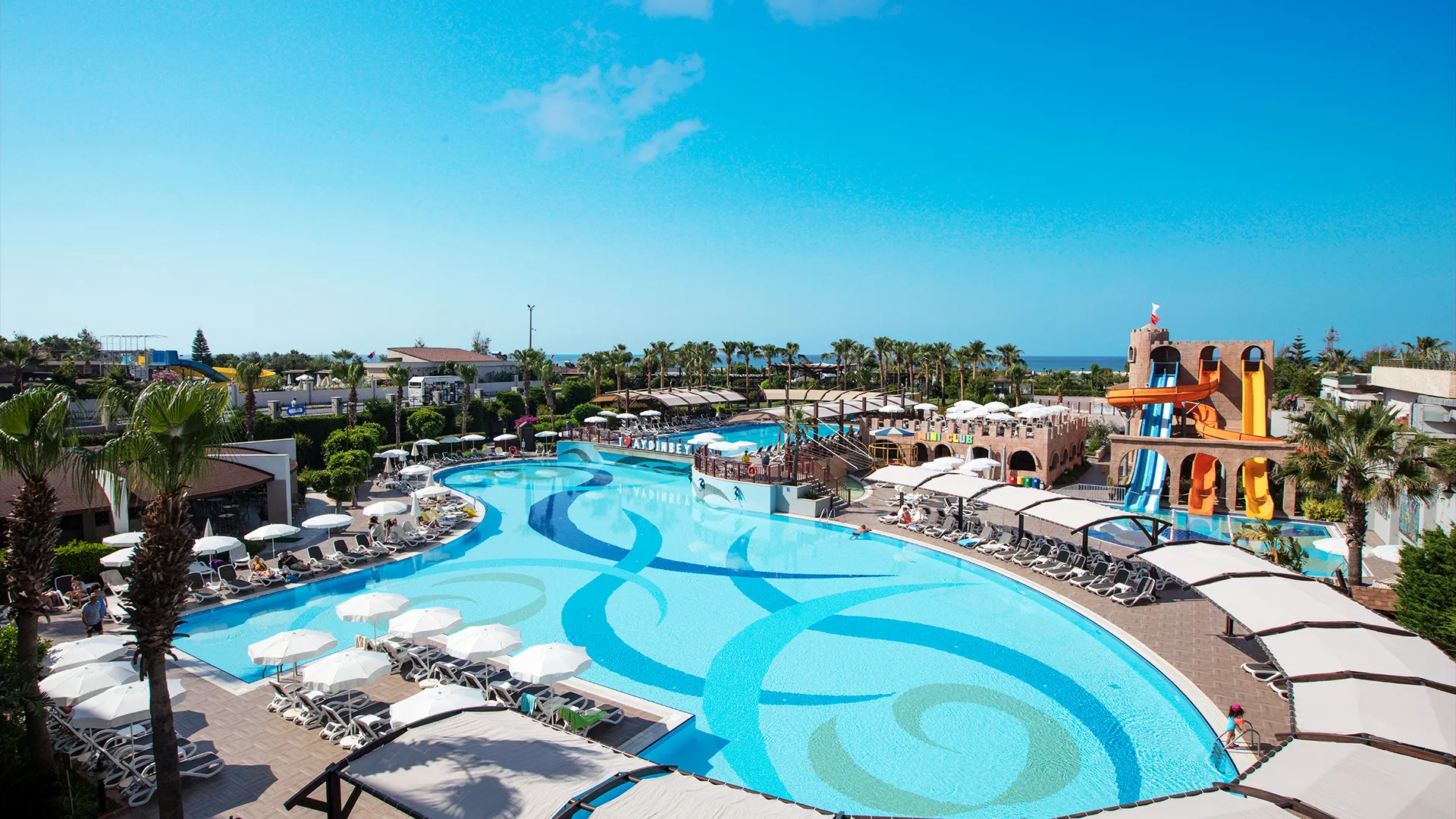 Хотелът разполага с обширен комплекс от басейни, включително открити и закрити, като гостите могат да се насладят на слънчевите лъчи и освежаващите водни процедури. Собственият плаж на хотела е идеално място за релаксация и забавление на брега на морето.