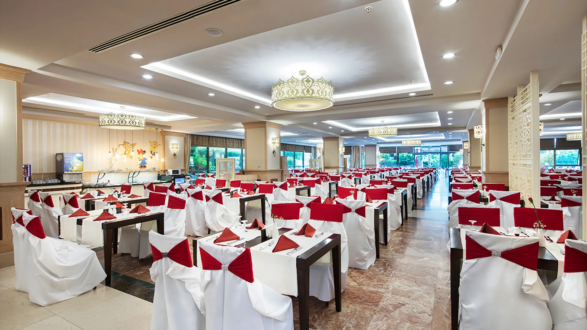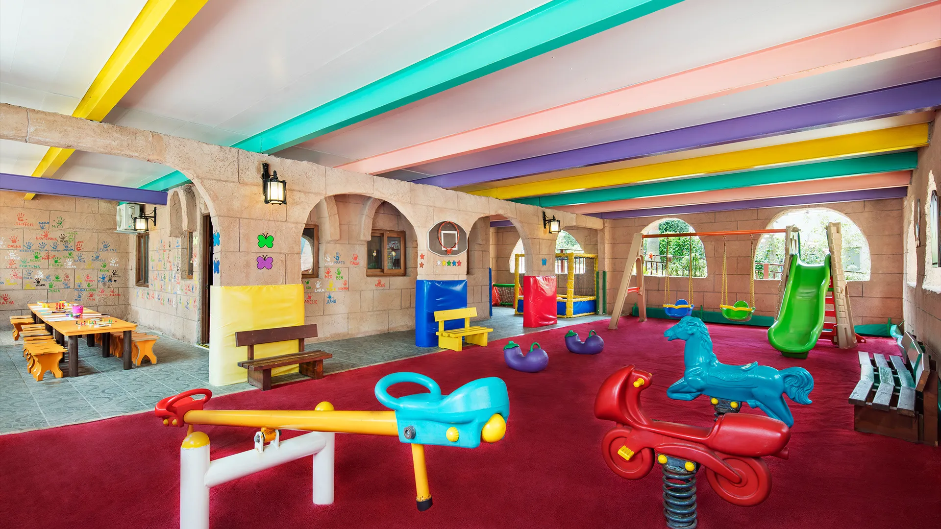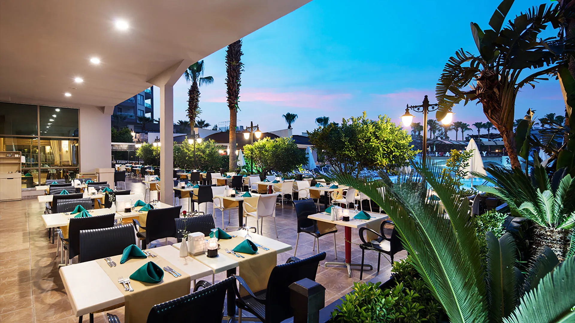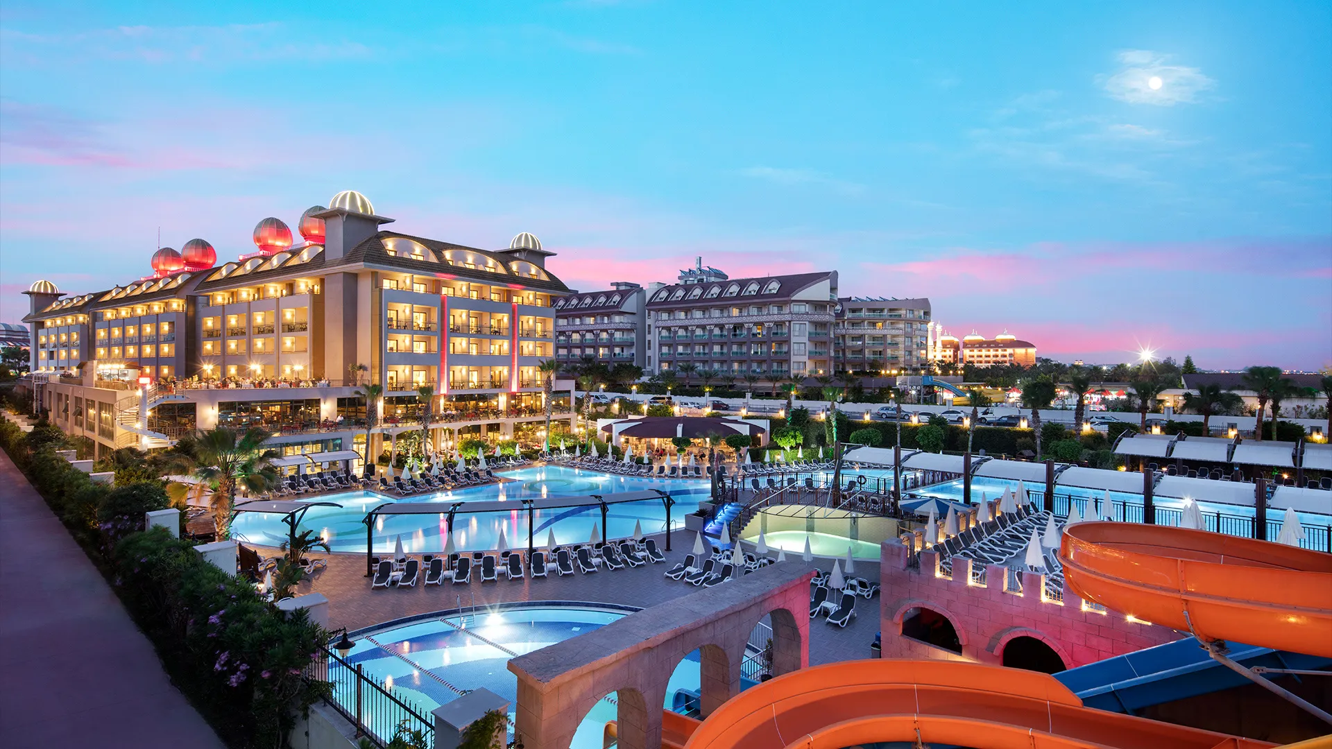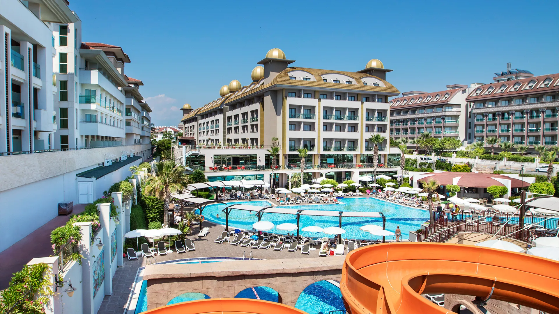 Хотелът разполага с обширен комплекс от басейни, включително открити и закрити, като гостите могат да се насладят на слънчевите лъчи и освежаващите водни процедури. Собственият плаж на хотела е идеално място за релаксация и забавление на брега на морето.