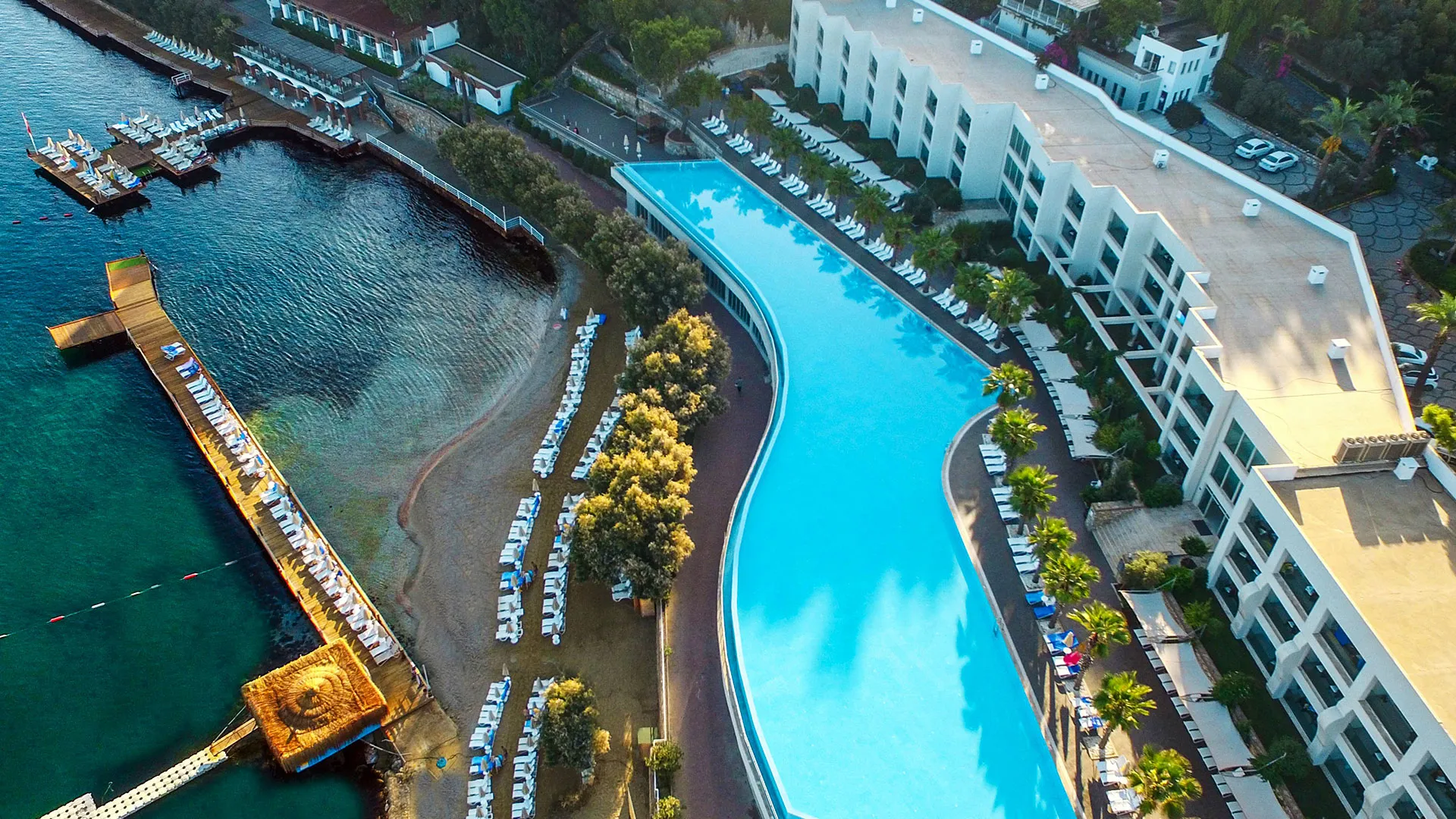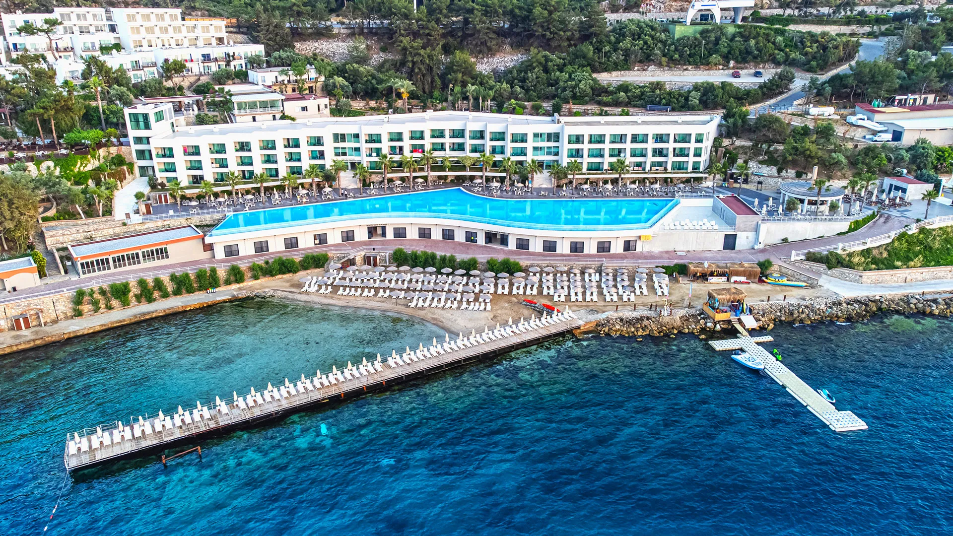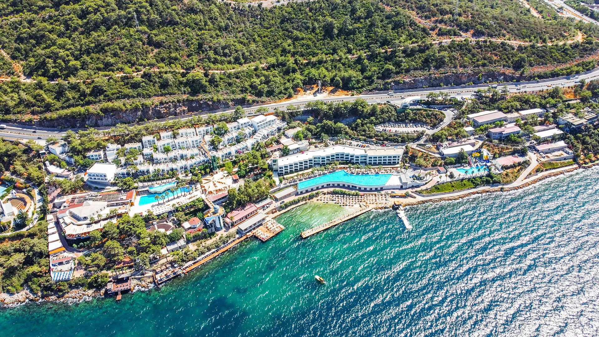 Комплексът разполага с пет басейна, включително басейн с водни пързалки, тенис кортове, спа център с разнообразни процедури, и зона за водни спортове. Хотелът предлага множество дневни и вечерни забавления, които включват спортни активности, анимации и музикални изпълнения на живо. За тези, които искат да се потопят в културния живот на региона, хотелът организира и екскурзии до Бодрум, който е на 10 км разстояние и може лесно да се достигне за около 15 минути с автомобил.