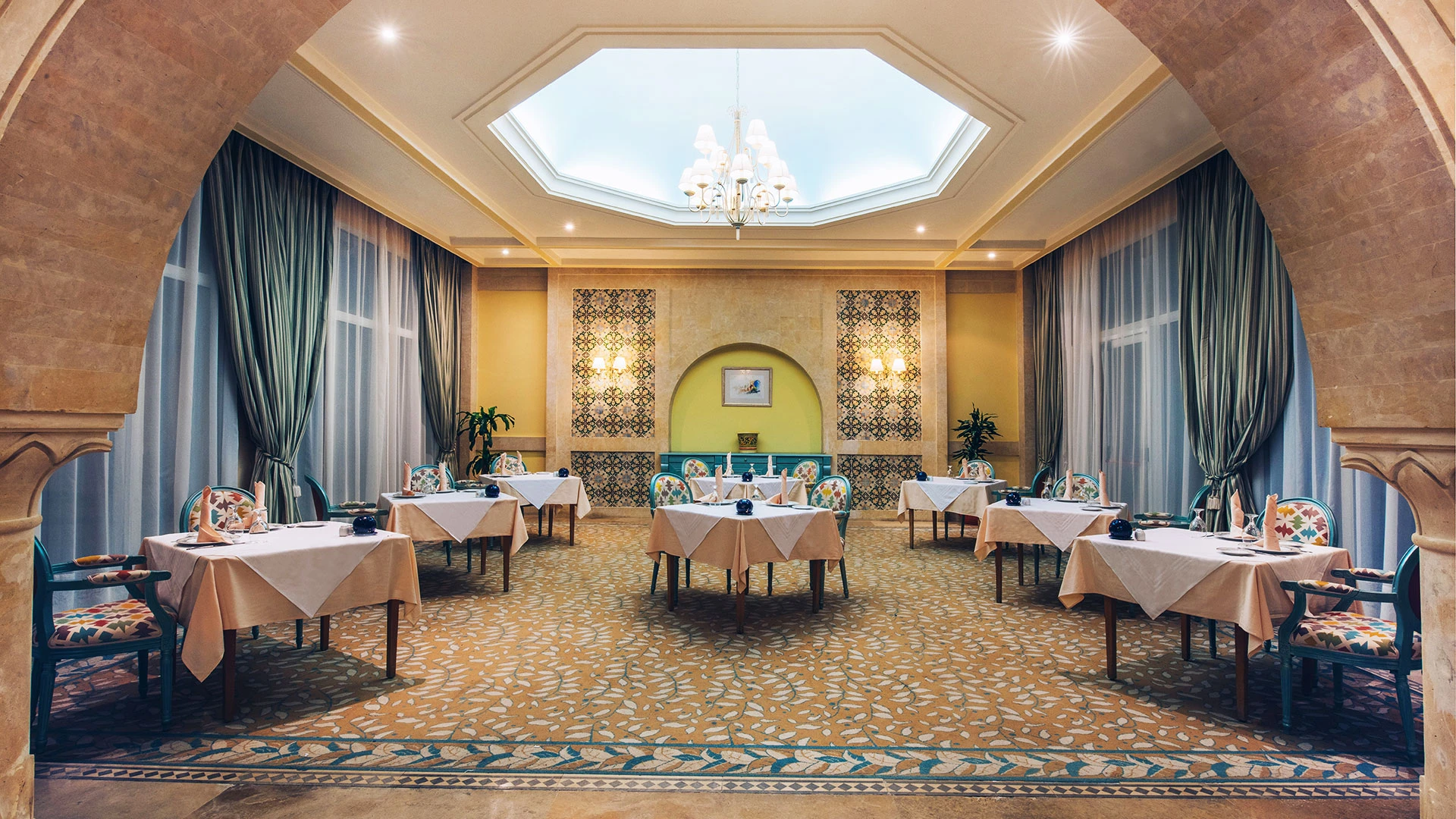 - В ресторанта туристите могат да опитат най-доброто от тунизийската и международна кухня. Вкусни сладкиши, гриловани меса и специални ястия се приготвят направо пред тях.