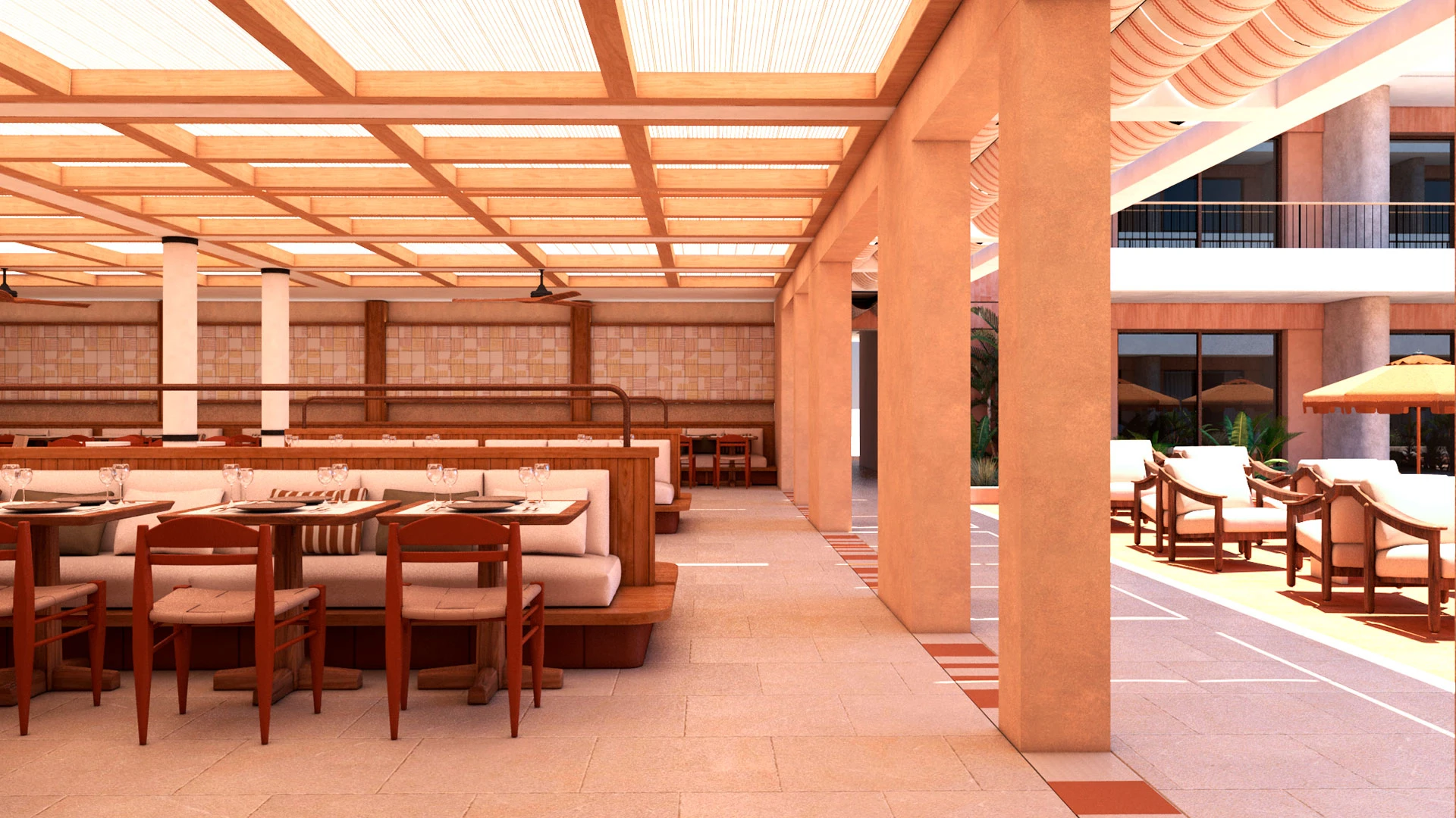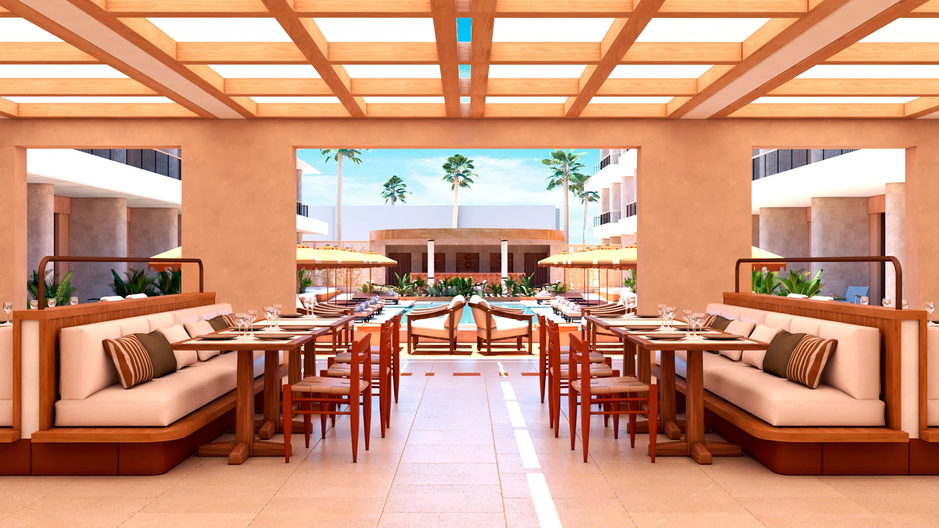 Открит басейн: Басейн с шезлонги и чадъри, предоставящ комфорт и релакс.