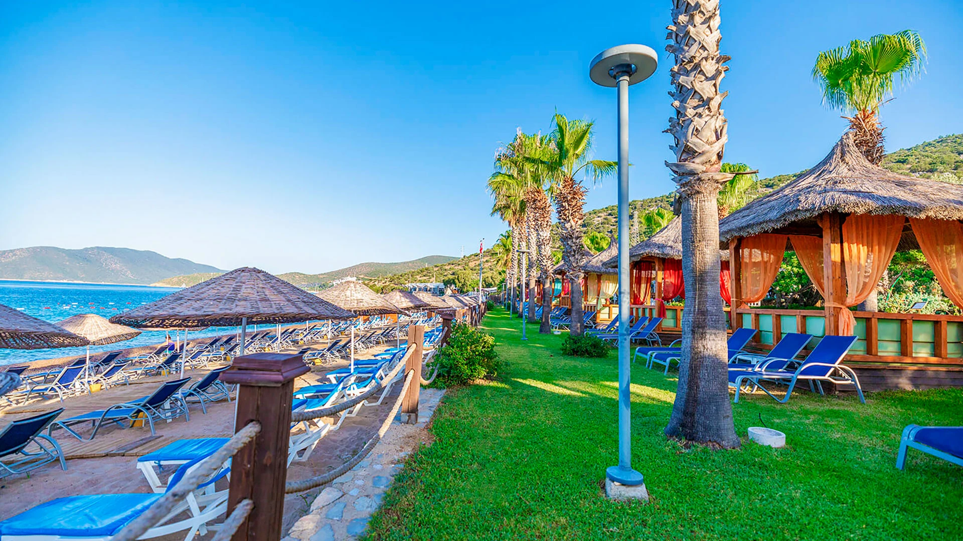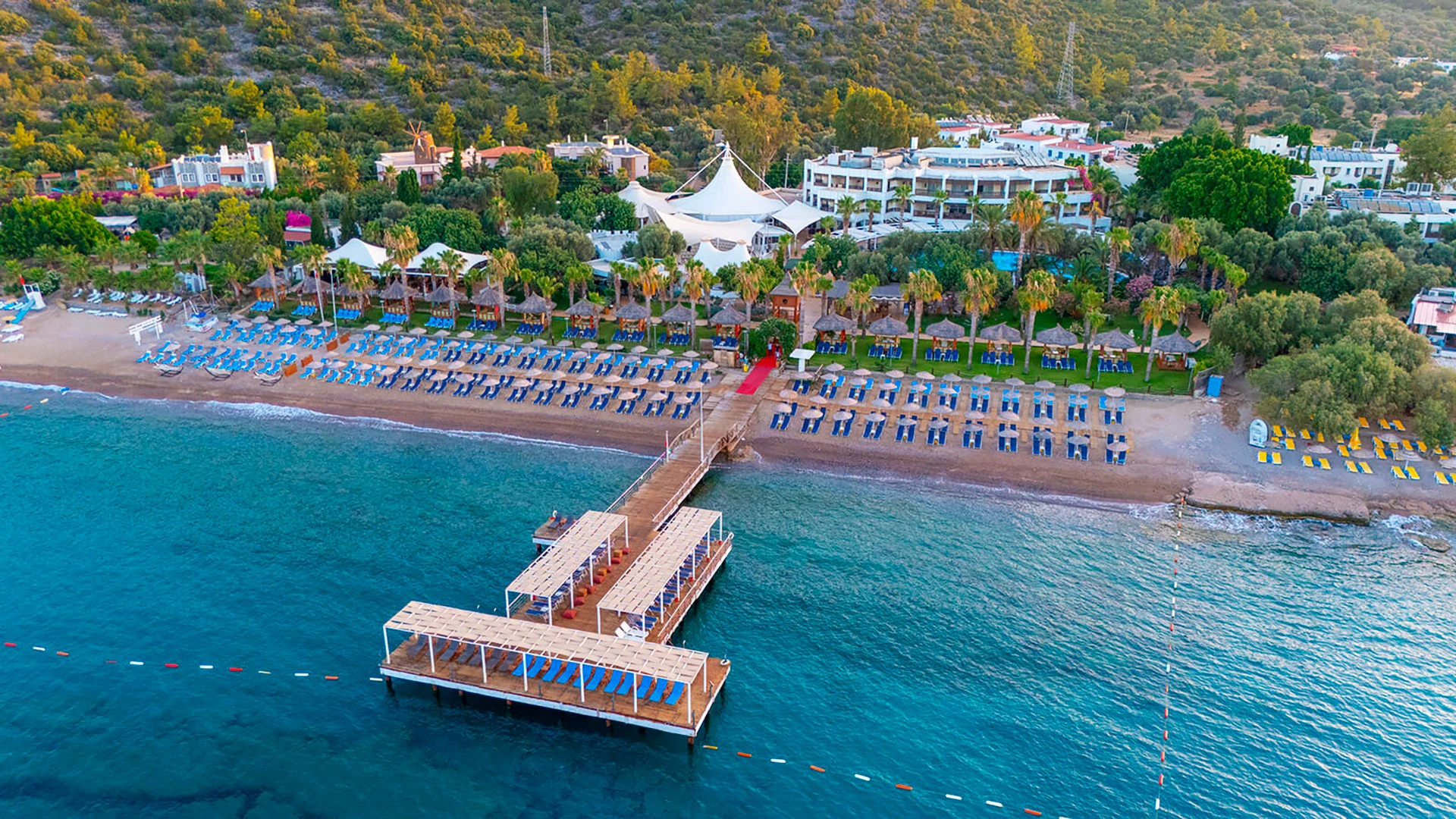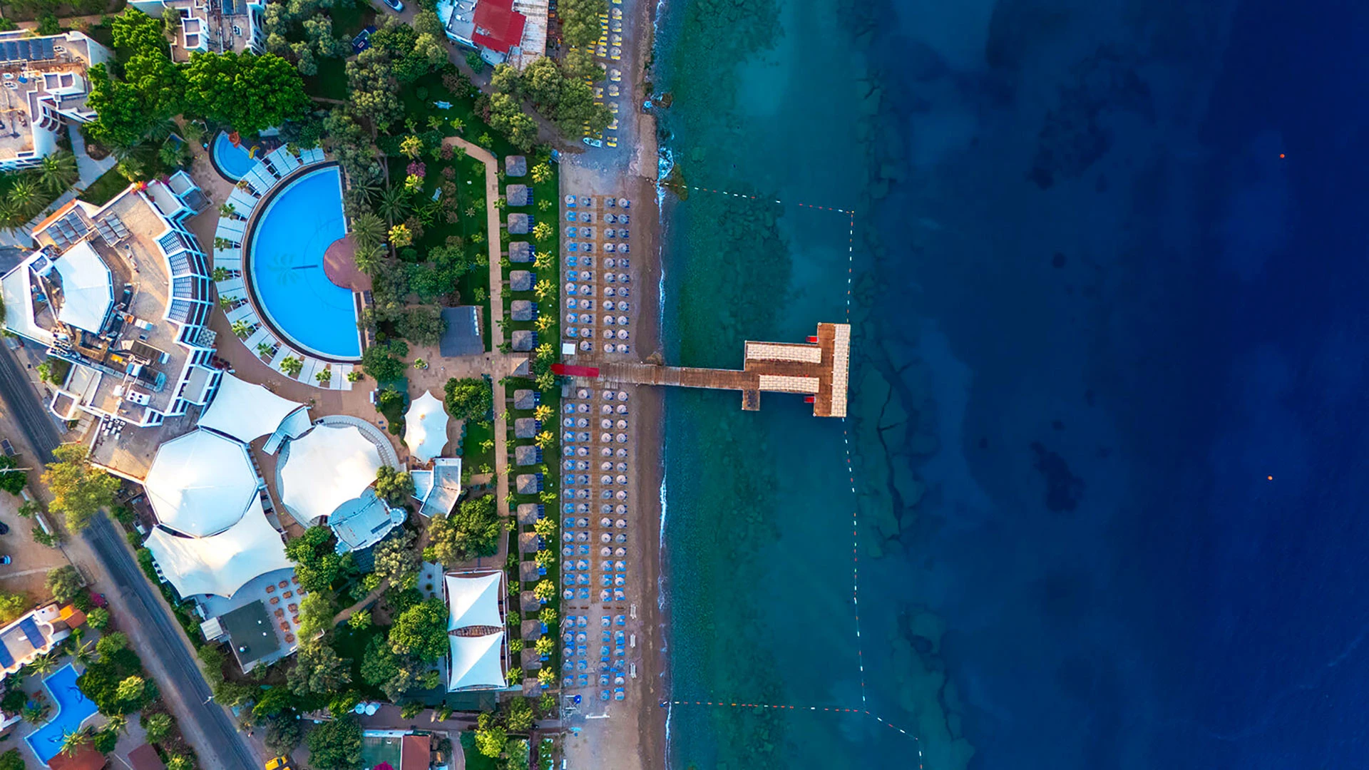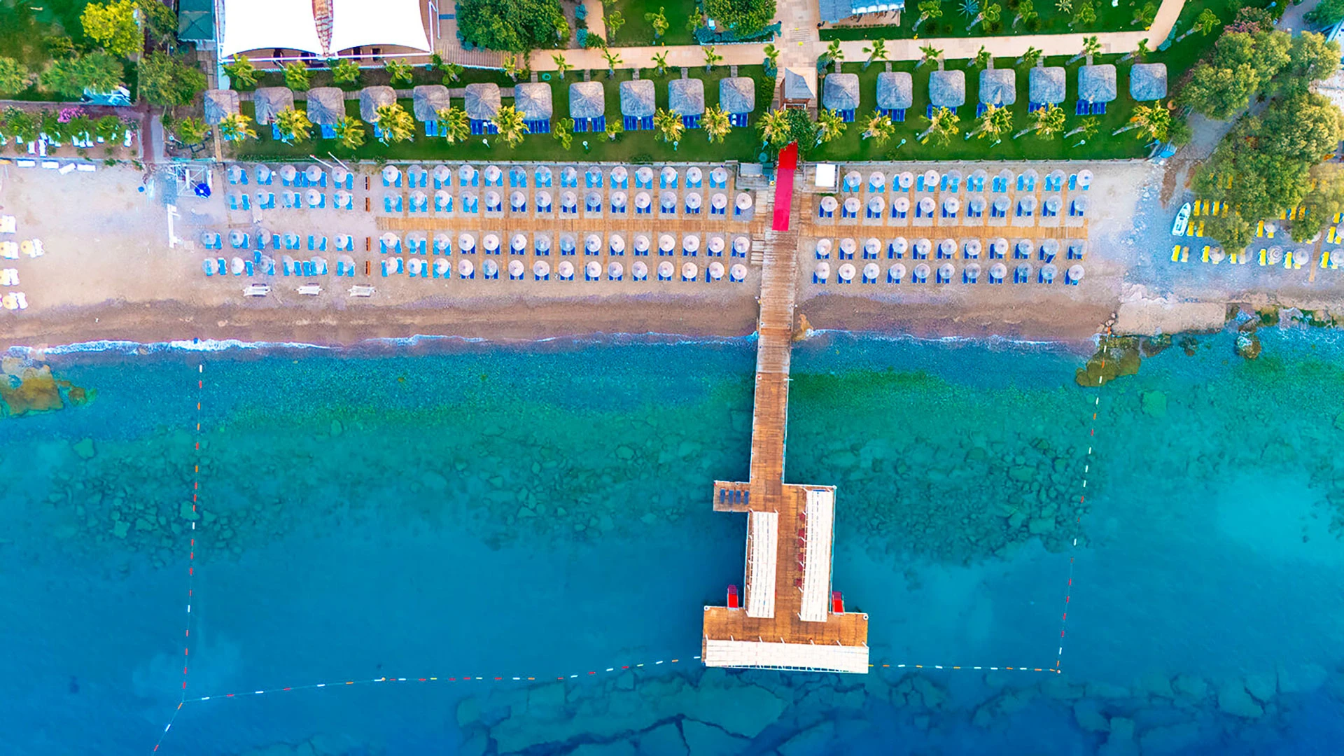 Комплексът разполага с няколко басейна, включително голям открит басейн, детски басейн и водни пързалки. Частният пясъчен плаж предлага шезлонги и чадъри за максимален комфорт. Гостите могат да се насладят на разнообразни водни спортове като каяк и водни ски.