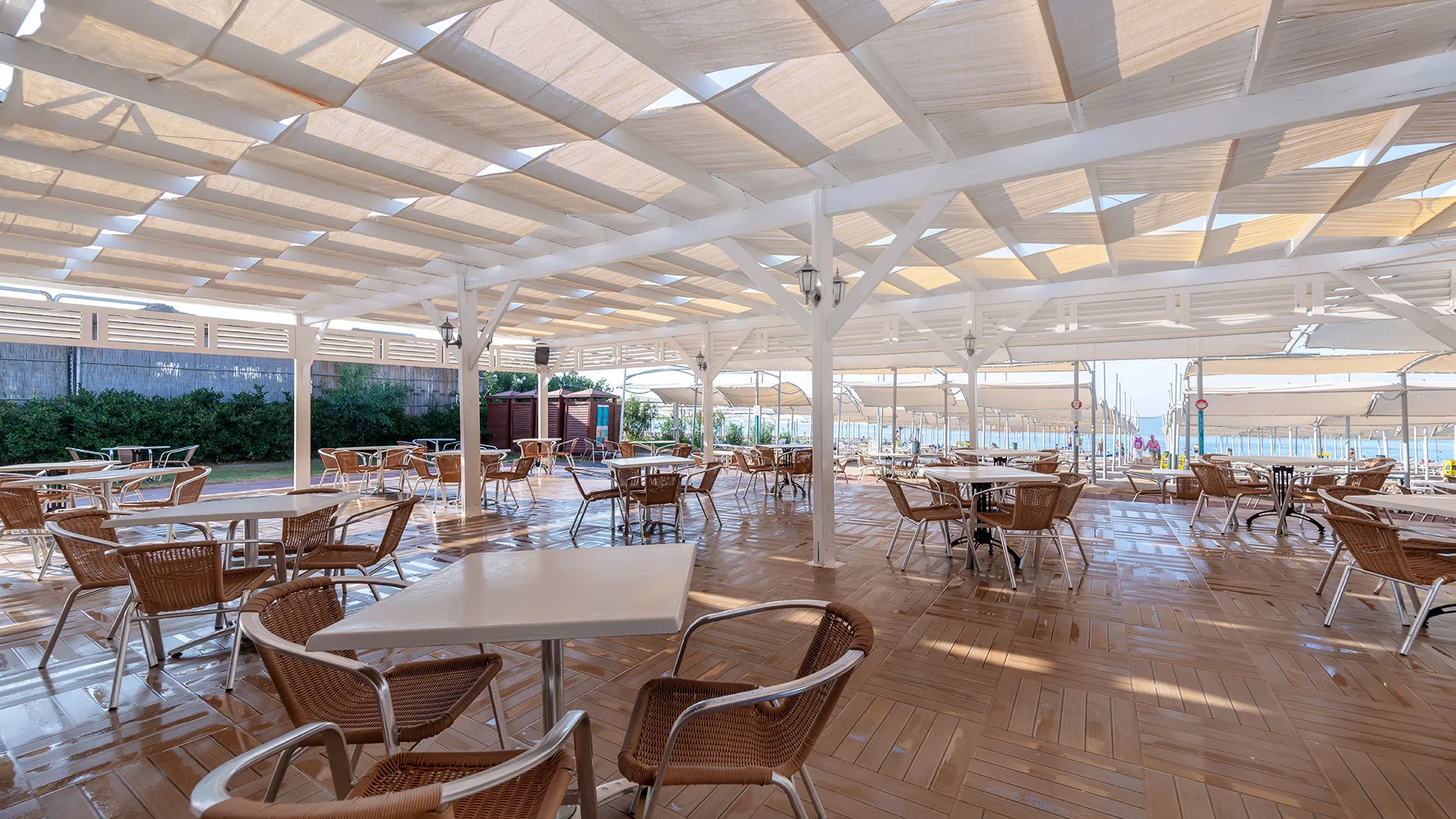 Плажът на хотела е със смес от пясък и камъчета и се намира на кратко разстояние от хотела. Шезлонги, матраци, чадъри и плажни кърпи са на разположение на гостите безплатно. На плажа има също павилион, който е срещу заплащане, и плажен бар.