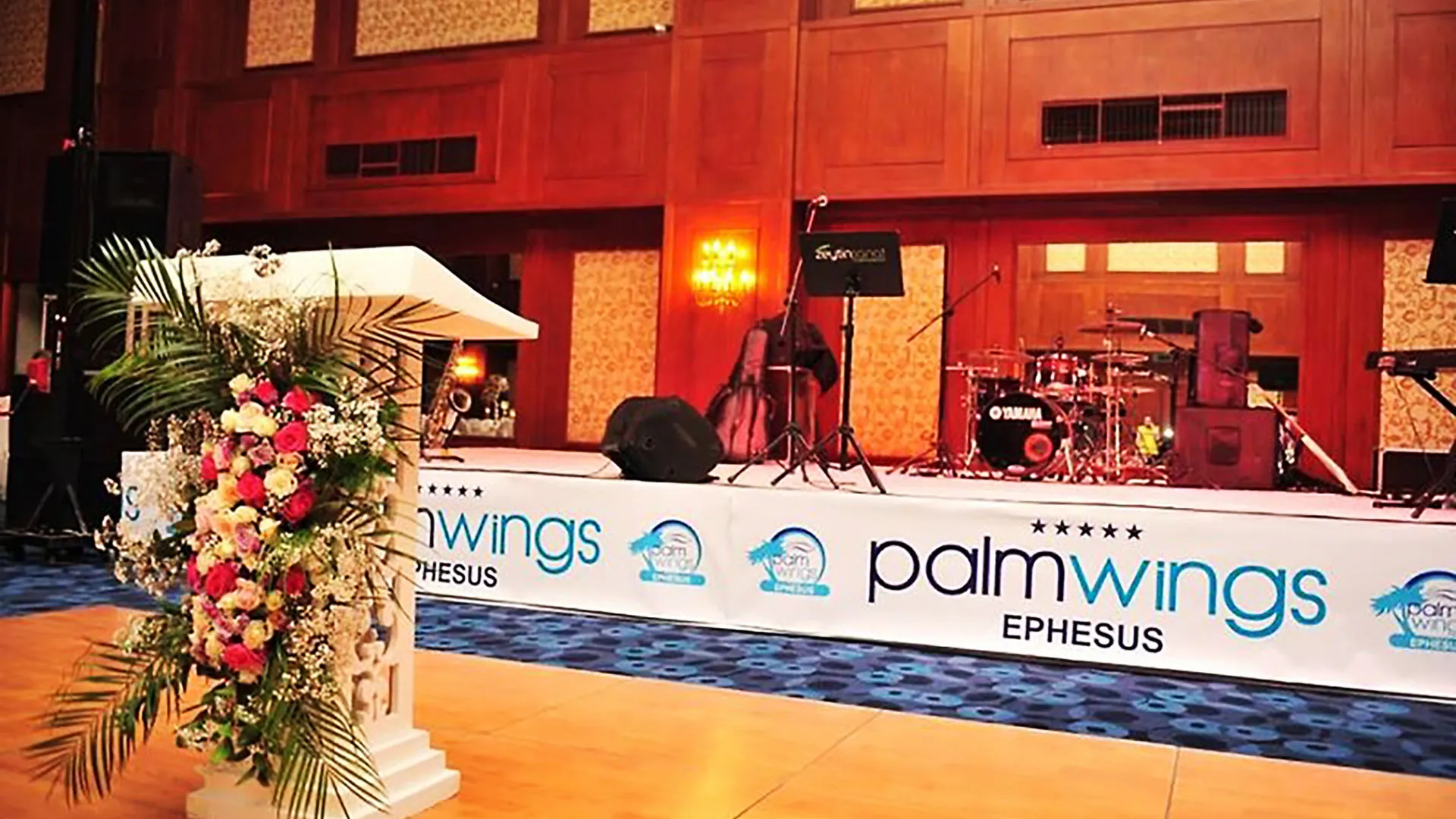 Построен през 1998 година и подлаган на последно реновиране през 2018 година, Palm Wings Kusadasi разполага с обширен комплекс от 54 000 квадратни метра, предлагащ различни типове настаняване. Например, единствената 11-етажна сграда на хотела предлага модерни едностайни стандартни стаи с частичен или пълен изглед към морето, докато четирите 4-етажни сгради в "Garden" зоната предлагат просторни фамилни стаи с хол и спалня за по-голяма уединеност и комфорт.