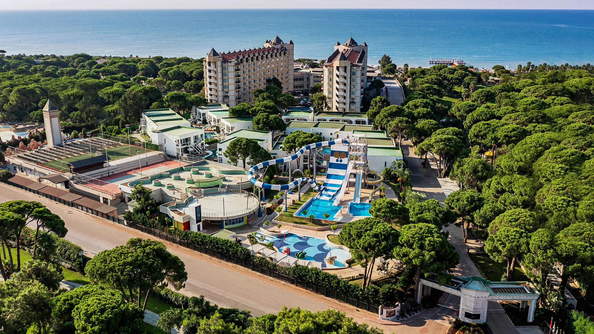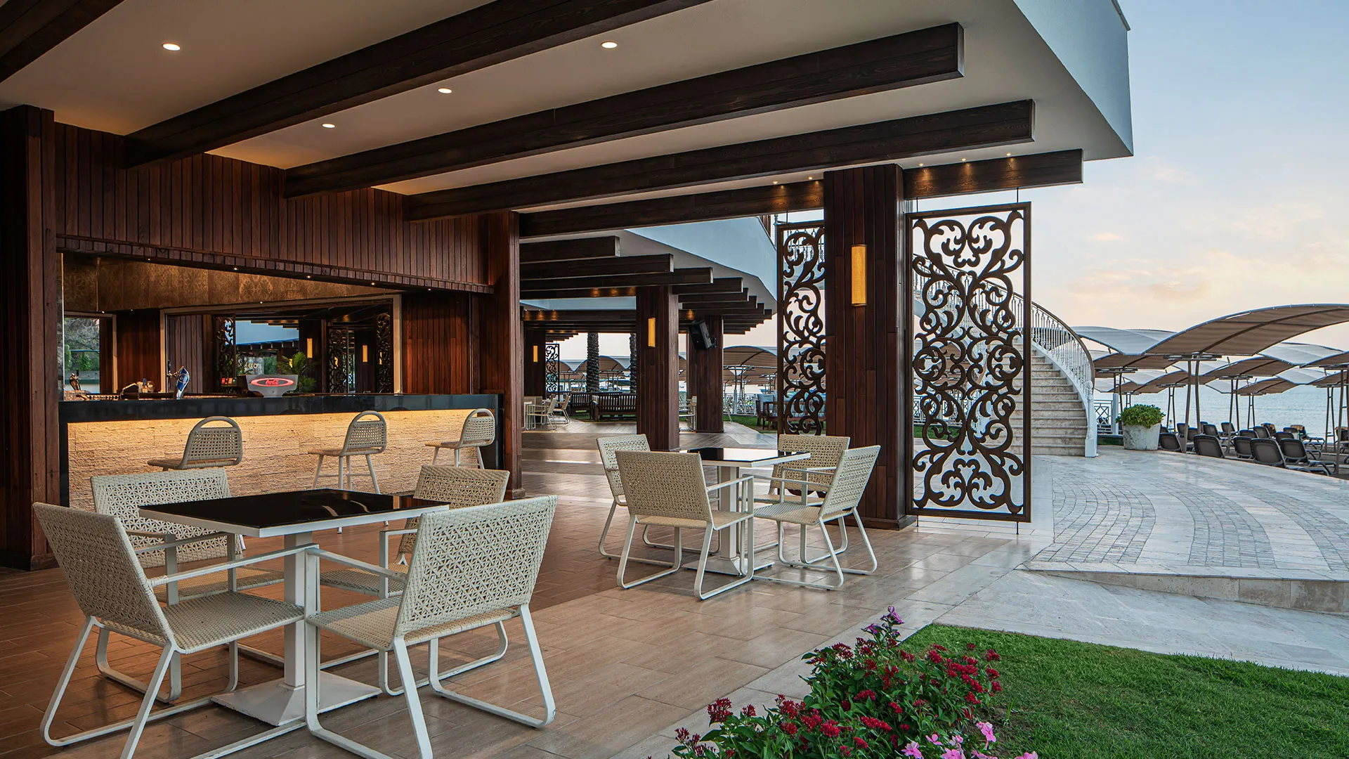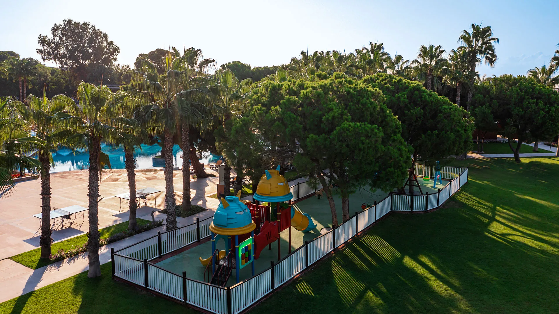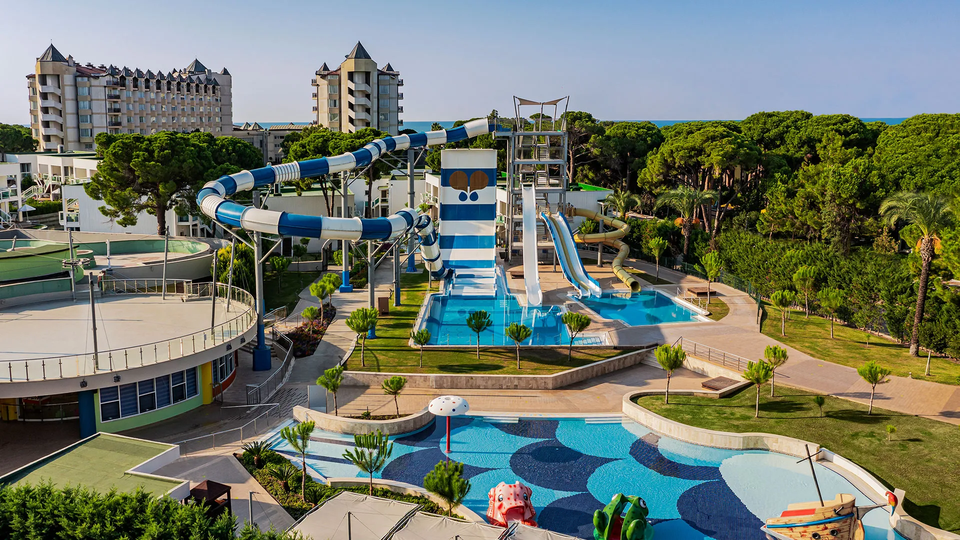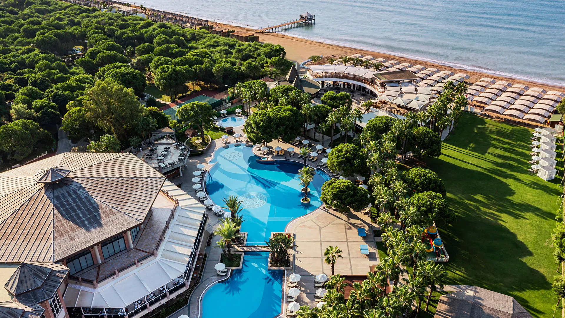Хотелът разполага с обширна територия, оформена с внимание към детайла, която включва чудесни зелени площи, открити басейни и прекрасни плажни зони. Гостите могат да се насладят на множество удобства и забавления, включително спа център със сауна, турска баня и масажи, фитнес зала, тенисни кортове, водни спортове и детски клуб.