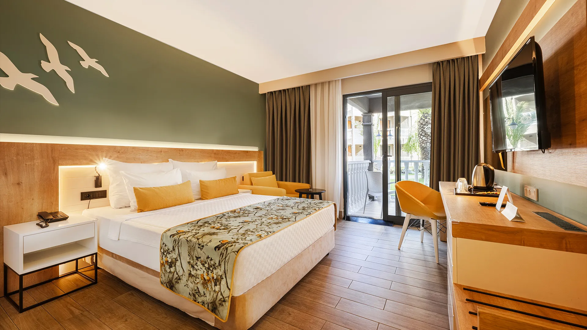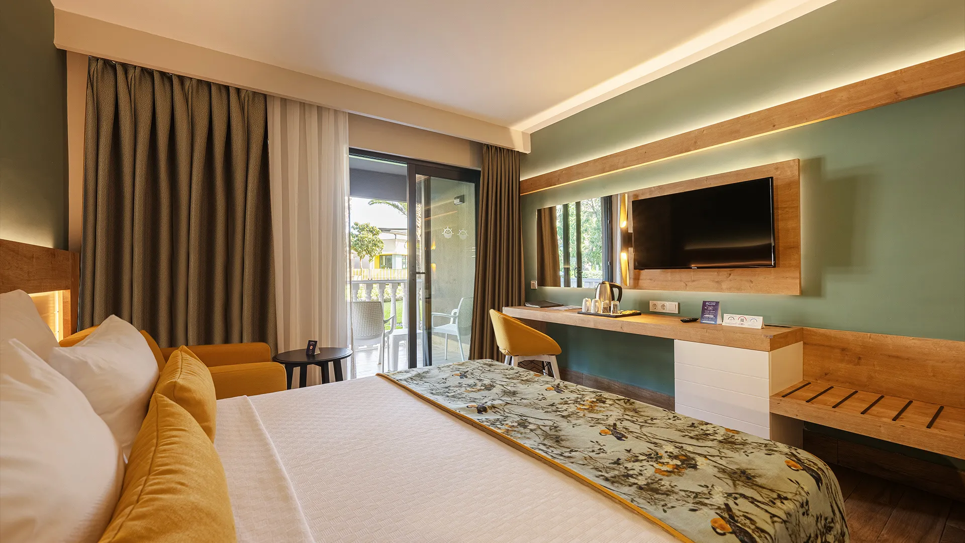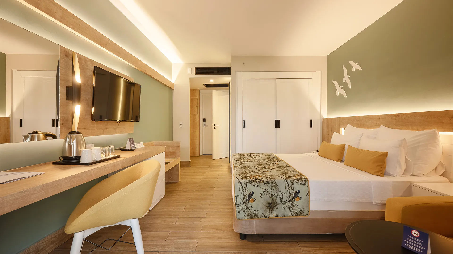 Всички стаи са климатизирани и оборудвани със сателитна телевизия и минибар. Балконът, обзаведен с два стола, предоставя удобно място за отдих и наслаждаване на изгледа. В банята има душ, сешоар и предоставени безплатни тоалетни принадлежности. Гостите могат да избират между стаи с изглед към градината или морето, в зависимост от предпочитанията си.