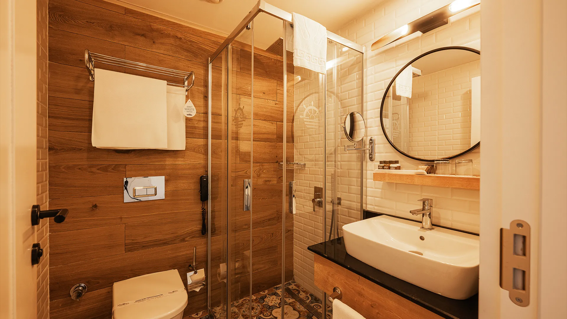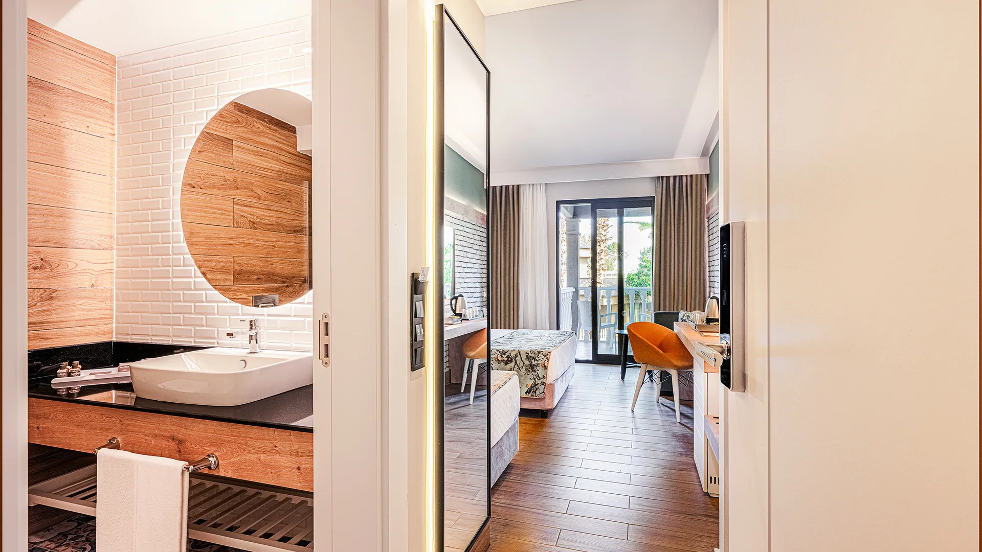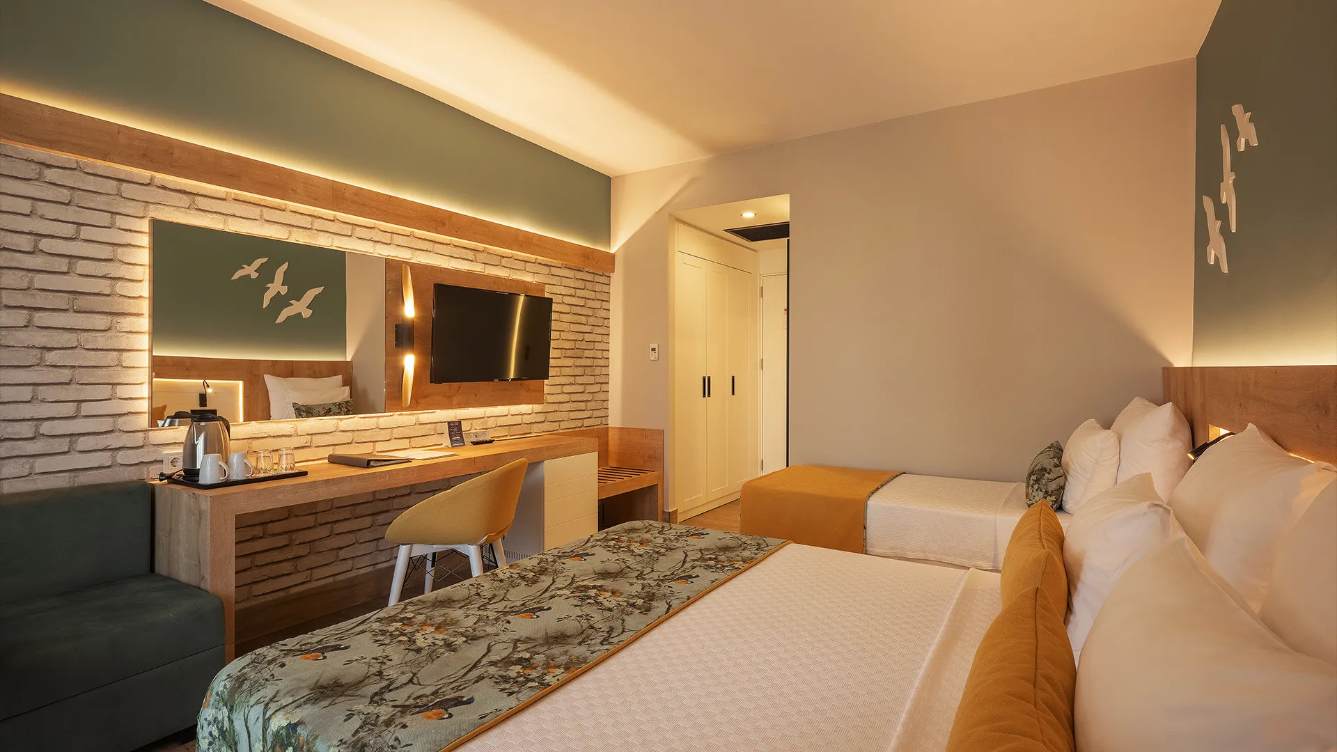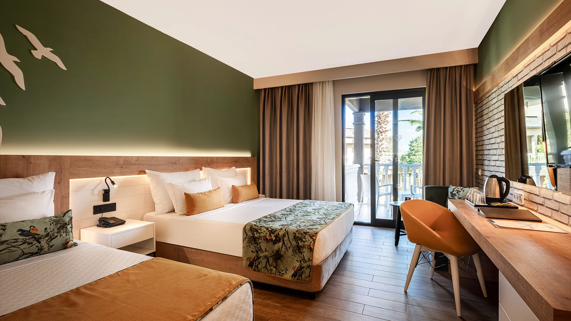 Всички стаи са климатизирани и оборудвани със сателитна телевизия и минибар. Балконът, обзаведен с два стола, предоставя удобно място за отдих и наслаждаване на изгледа. В банята има душ, сешоар и предоставени безплатни тоалетни принадлежности. Гостите могат да избират между стаи с изглед към градината или морето, в зависимост от предпочитанията си.