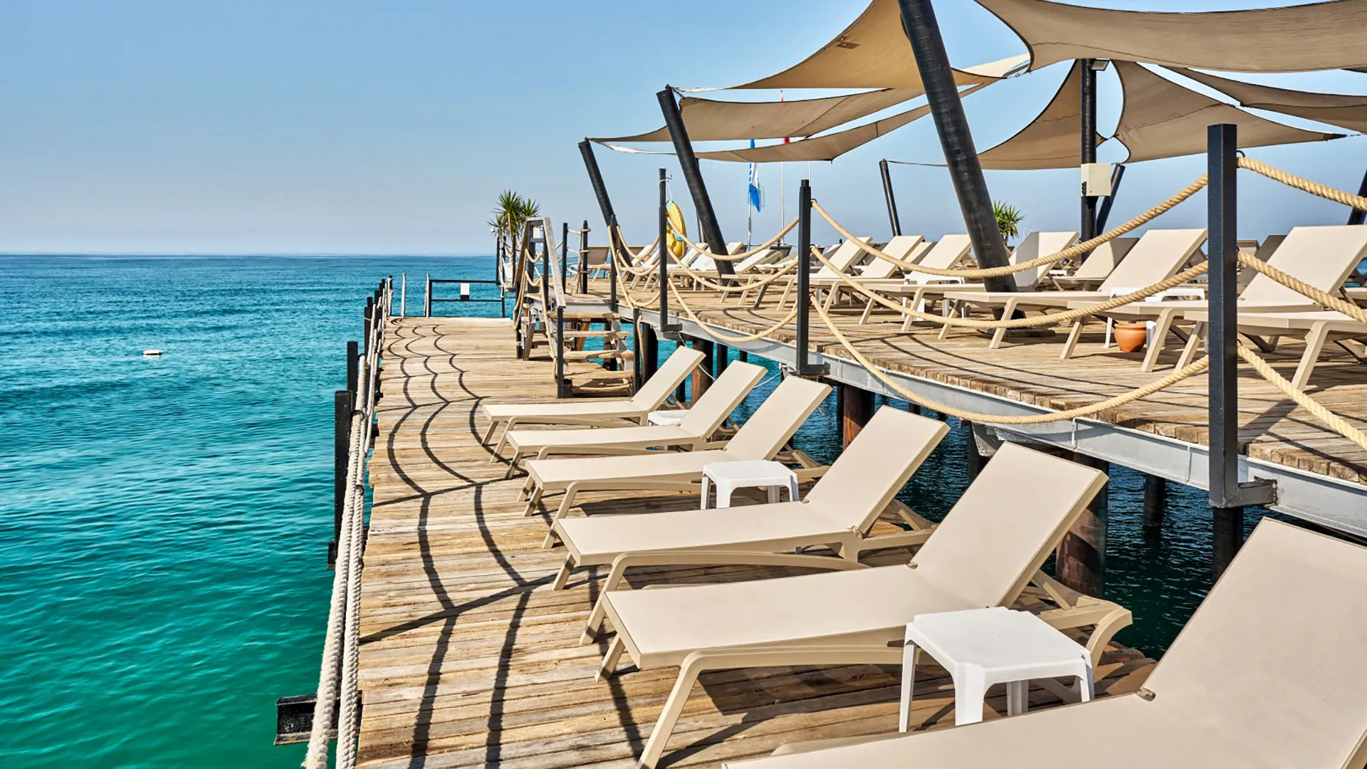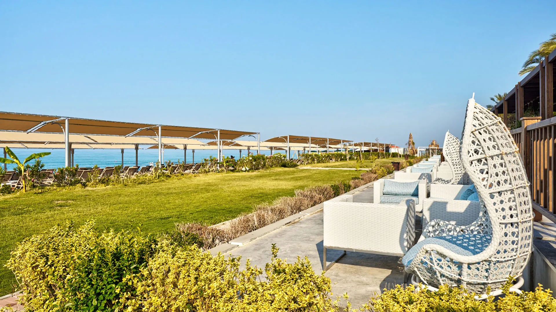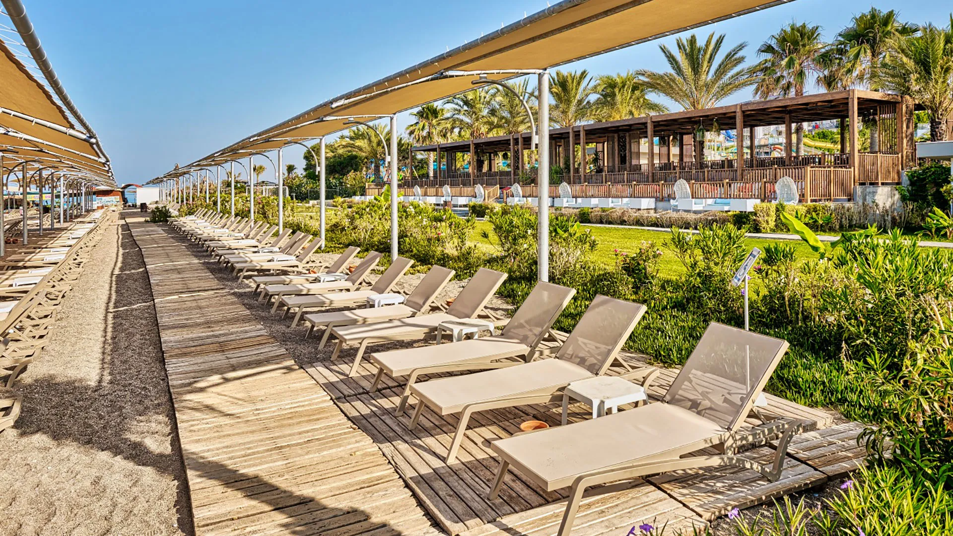 Плажът на хотела е със смес от пясък и камъчета и се намира на кратко разстояние от хотела. Шезлонги, матраци, чадъри и плажни кърпи са на разположение на гостите безплатно. На плажа има също павилион, който е срещу заплащане, и плажен бар.