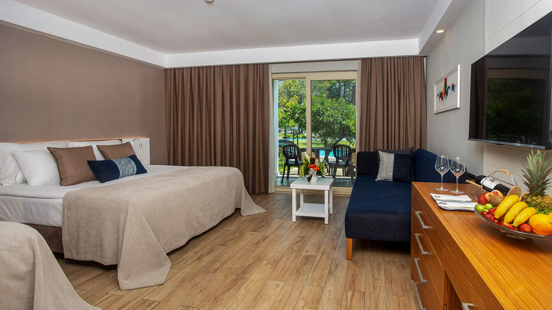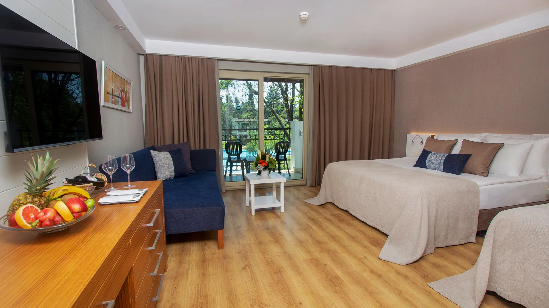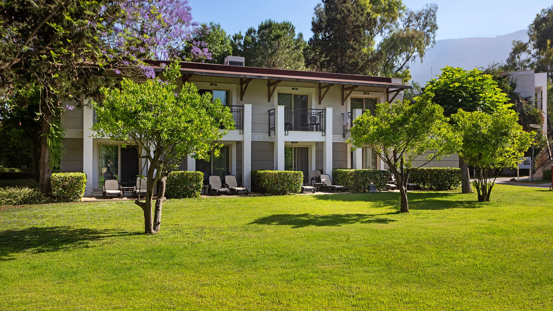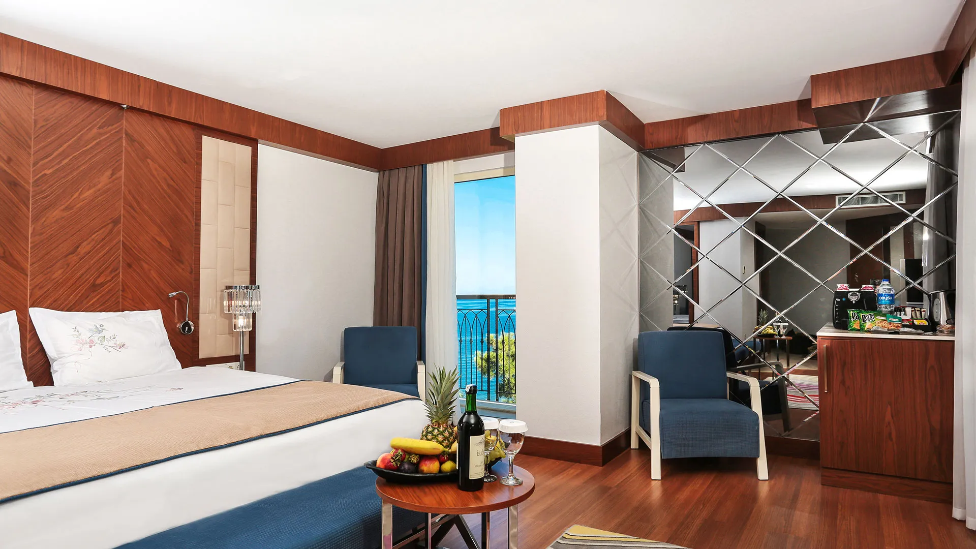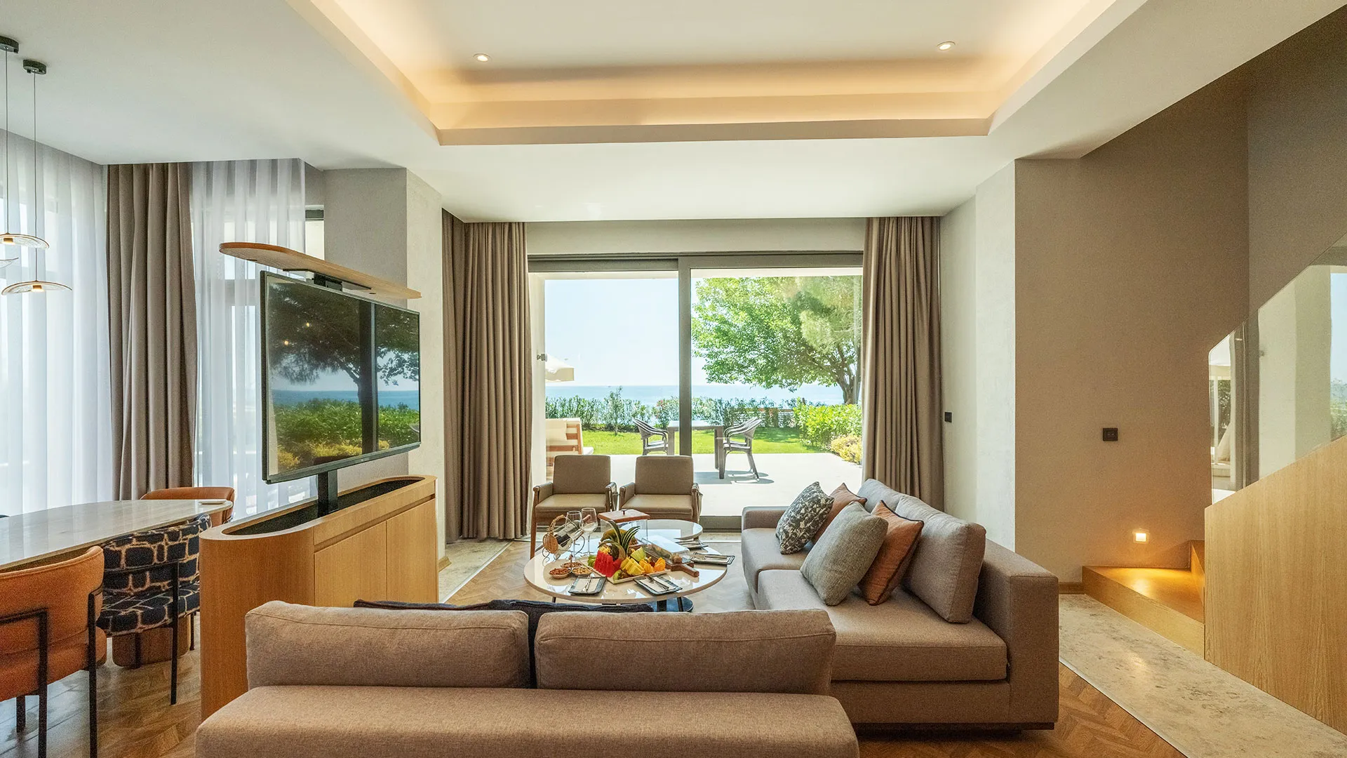 Хотелът разполага с изискани стаи и суити, обзаведени с висок клас на комфорт и елегантност. Всяка стая предлага уютна обстановка, модерни удобства и невероятна гледка към морето или градините на хотела.