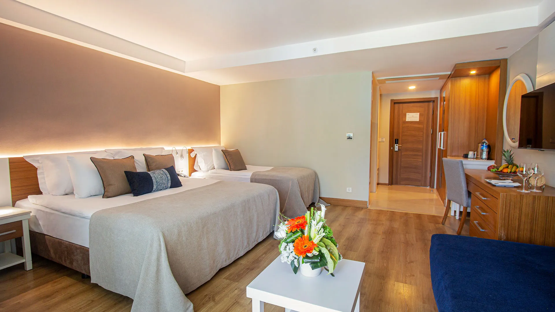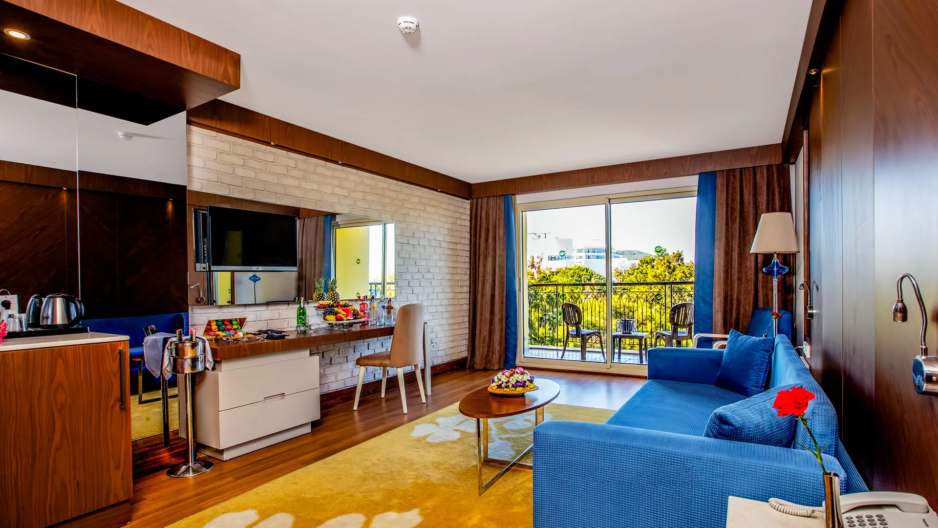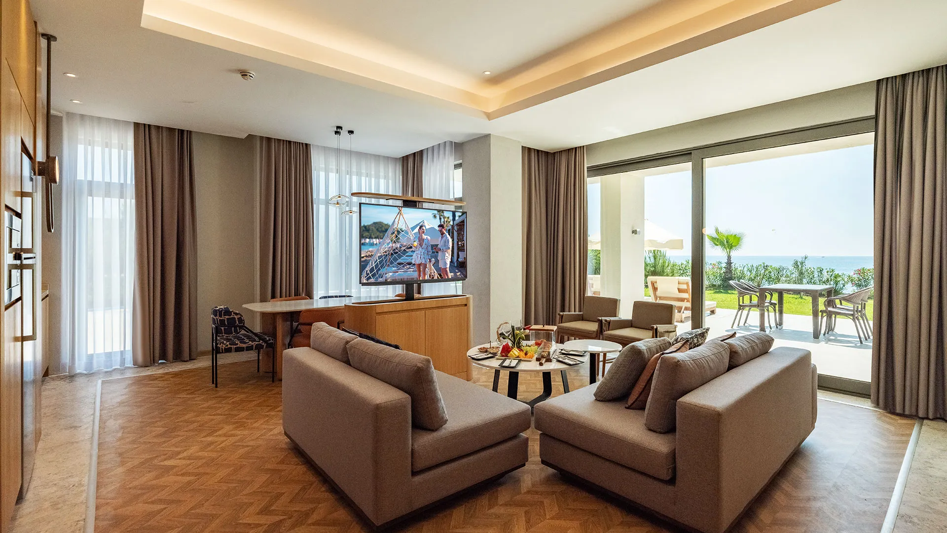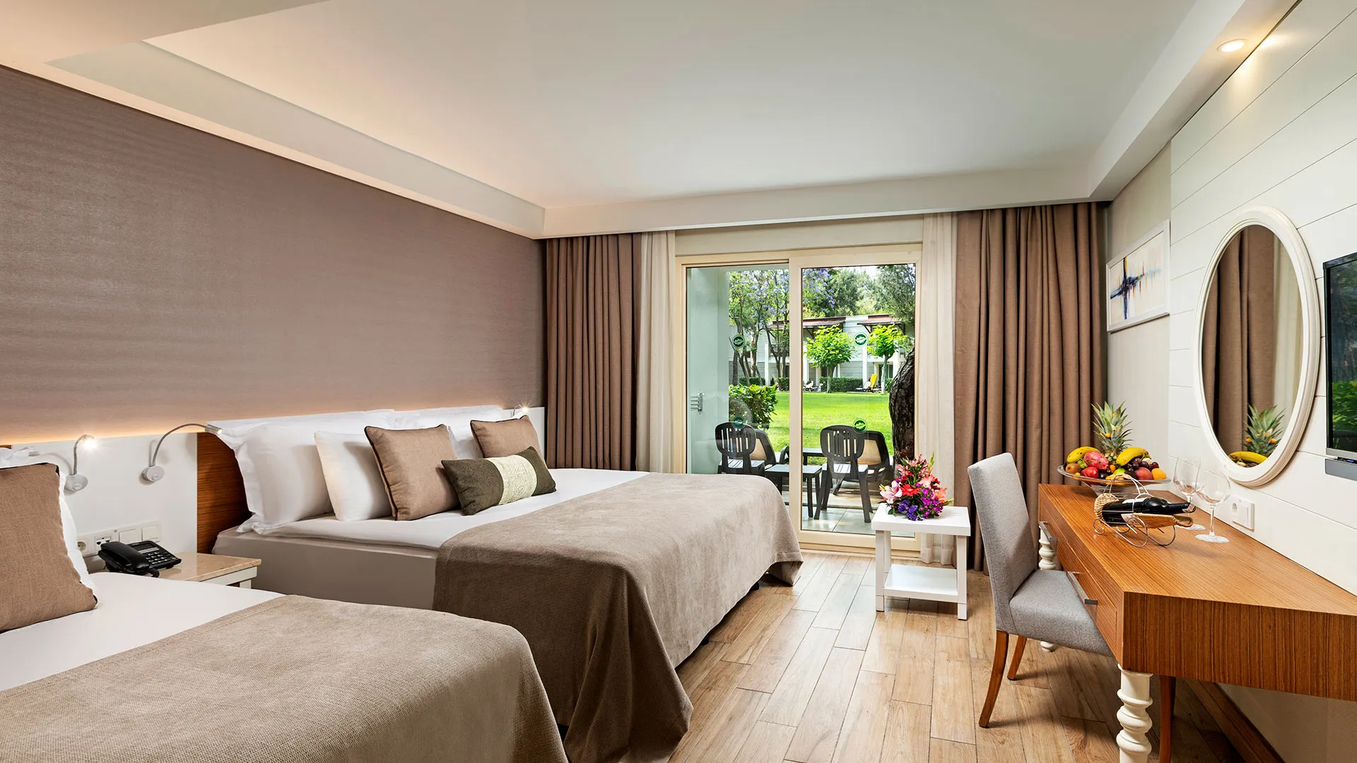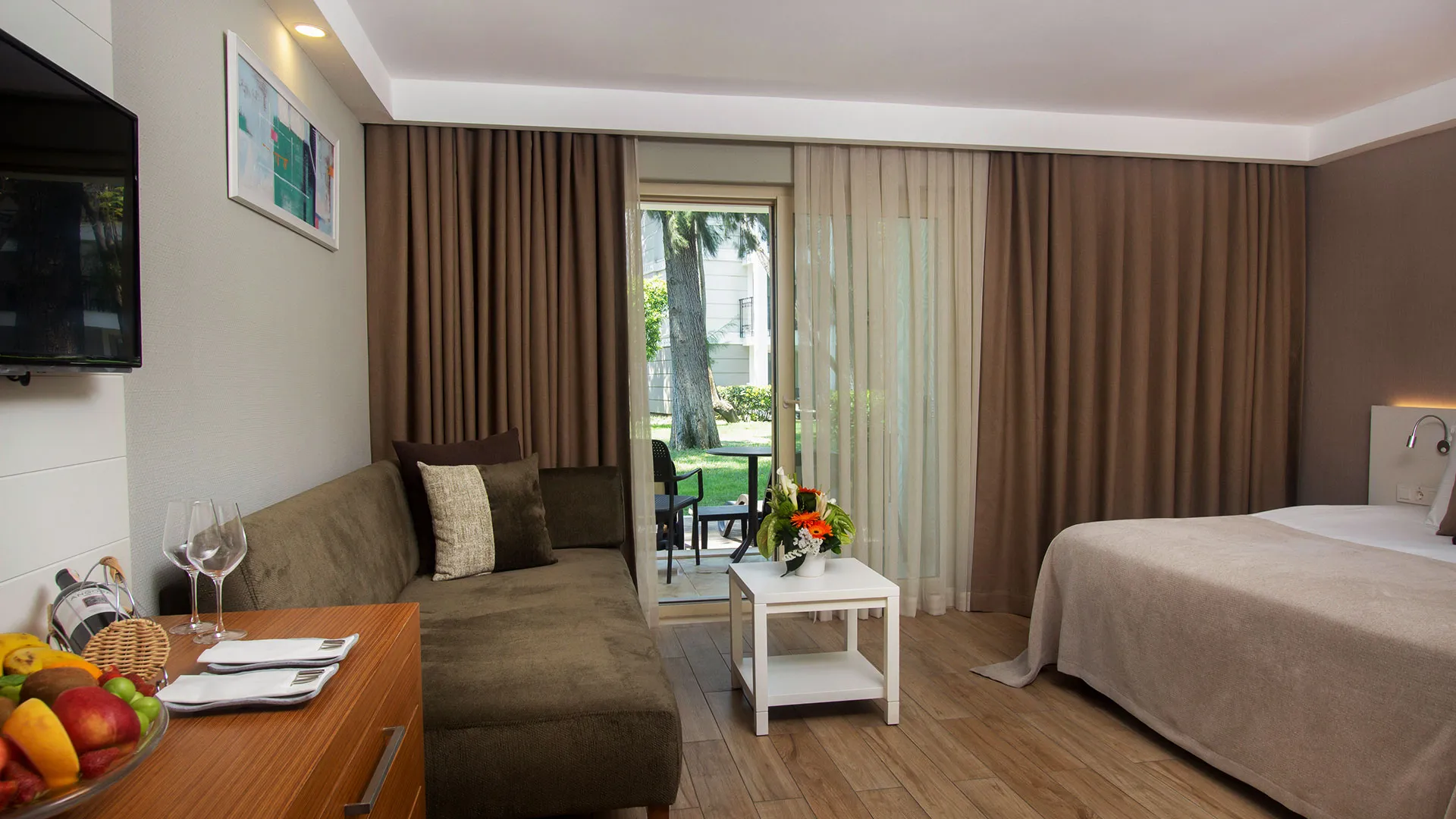 Хотелът разполага с изискани стаи и суити, обзаведени с висок клас на комфорт и елегантност. Всяка стая предлага уютна обстановка, модерни удобства и невероятна гледка към морето или градините на хотела.