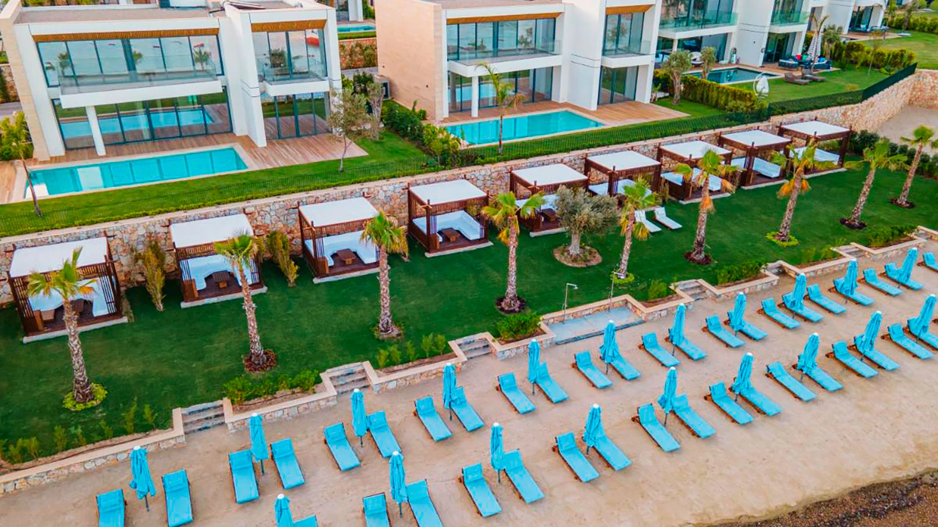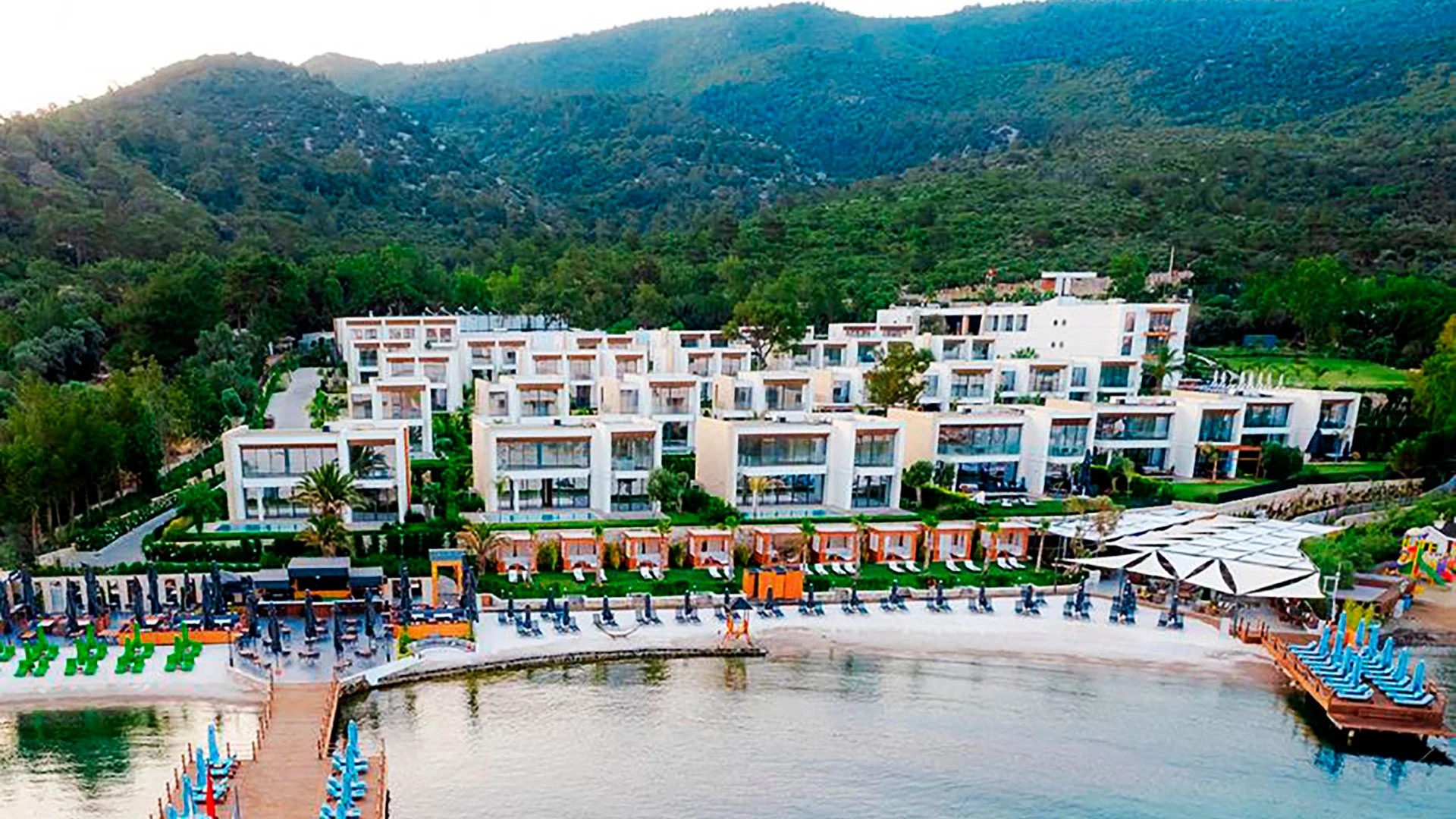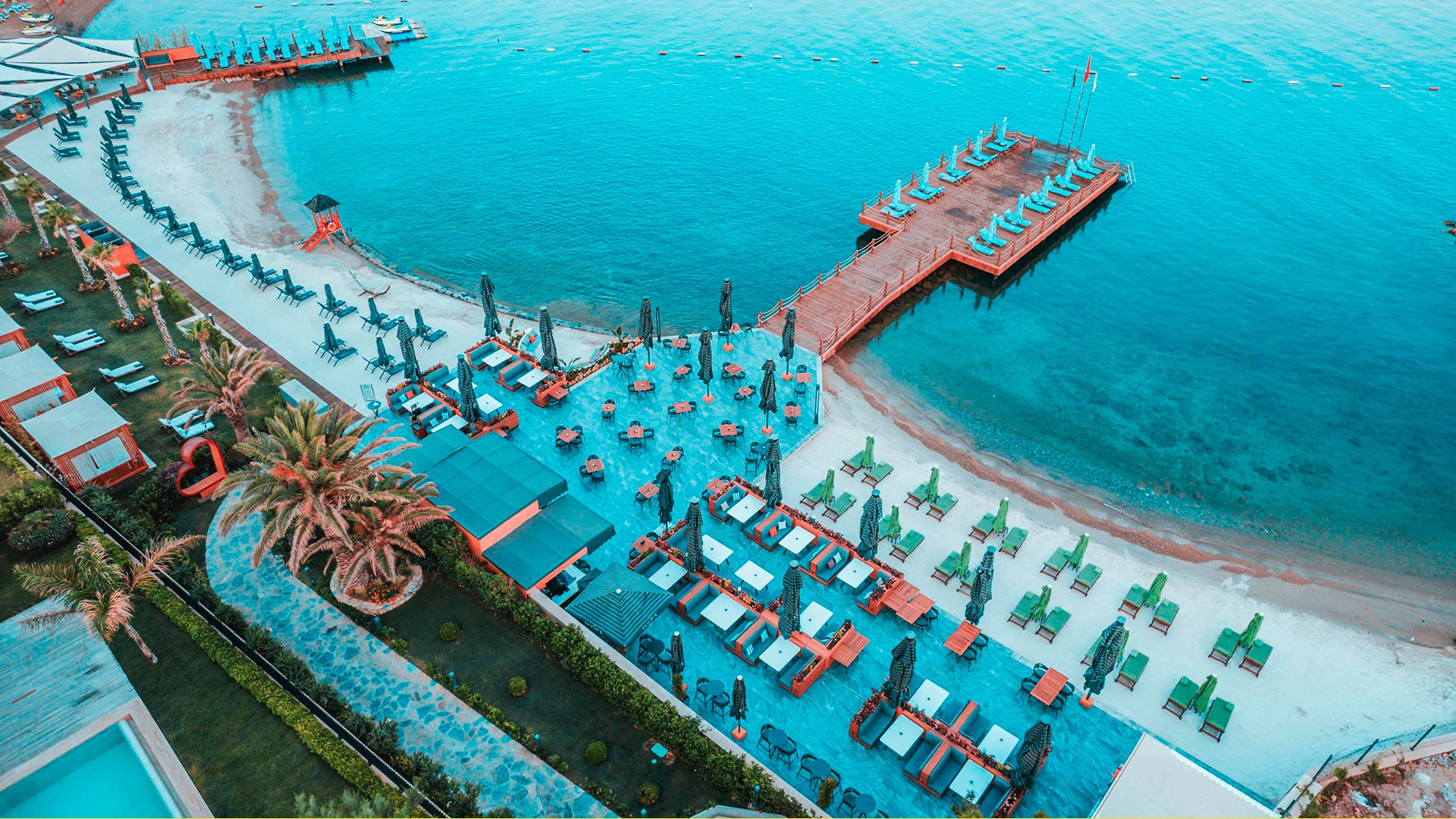 Комплексът разполага с няколко басейна – голям открит басейн, детски басейн и вътрешен басейн за по-хладните дни. Частният плаж с фин пясък предлага идеални условия за слънчеви бани и релакс, а гостите могат да се възползват от разнообразие от водни спортове като джетове, уиндсърфинг и каяк.