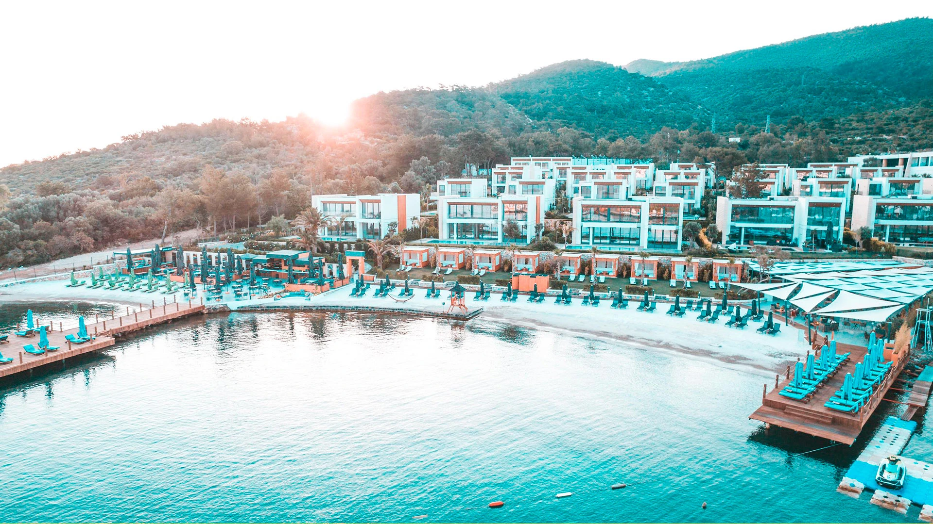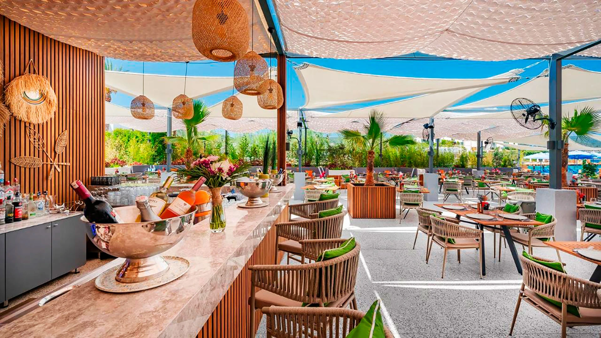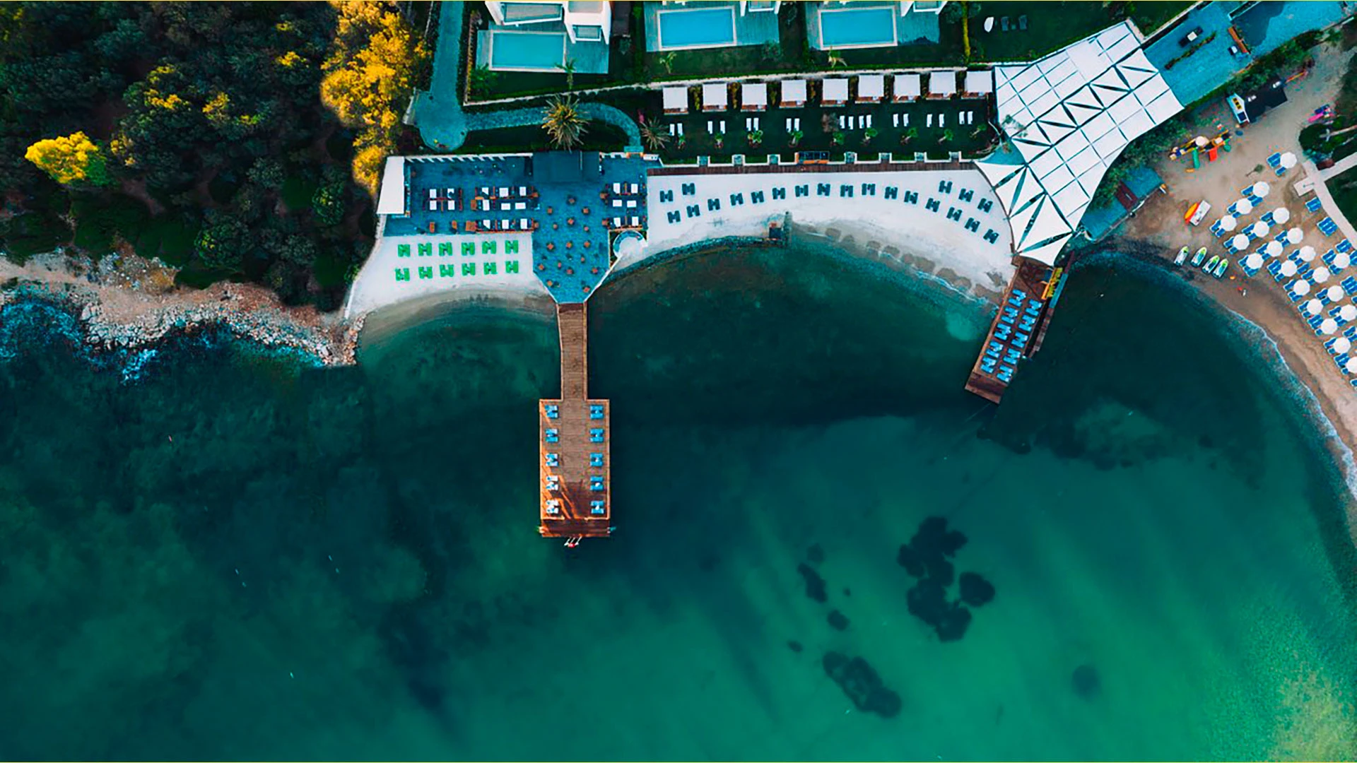 Комплексът разполага с няколко басейна – голям открит басейн, детски басейн и вътрешен басейн за по-хладните дни. Частният плаж с фин пясък предлага идеални условия за слънчеви бани и релакс, а гостите могат да се възползват от разнообразие от водни спортове като джетове, уиндсърфинг и каяк.
