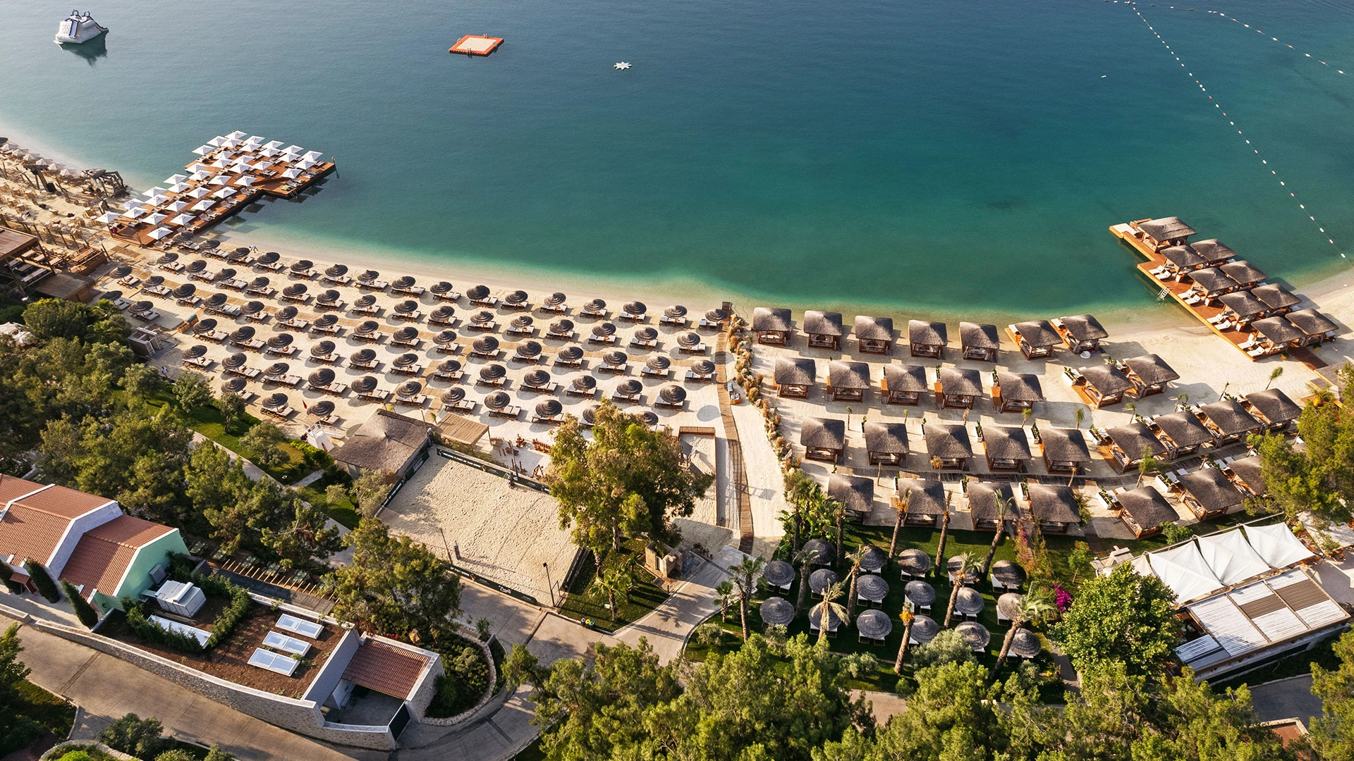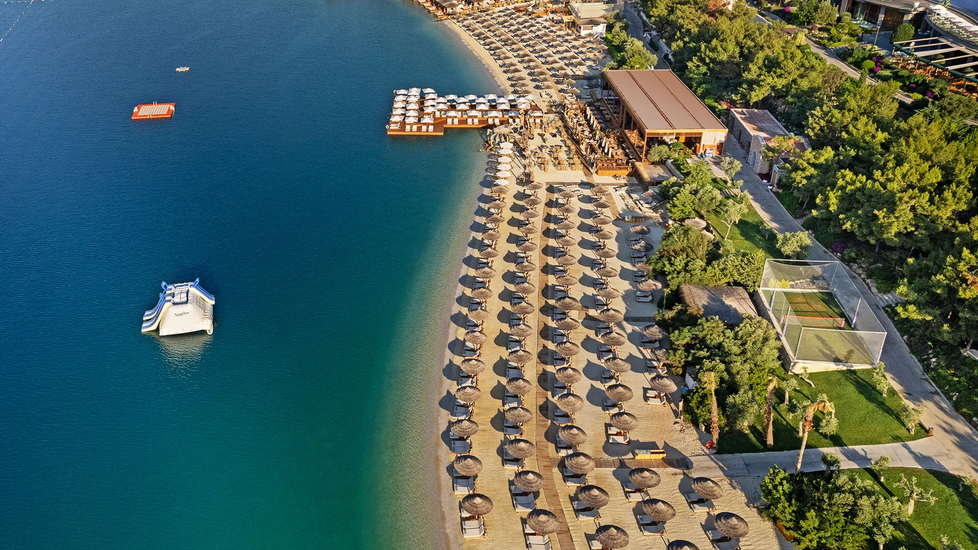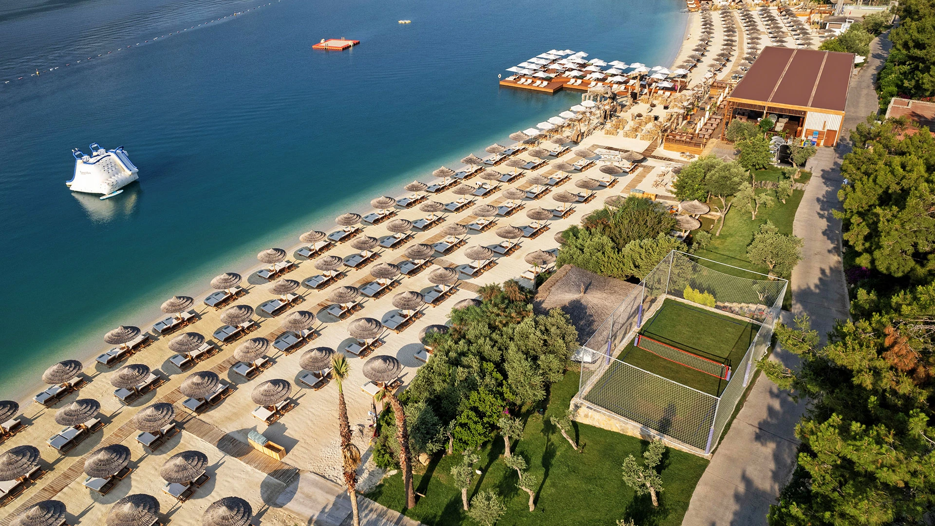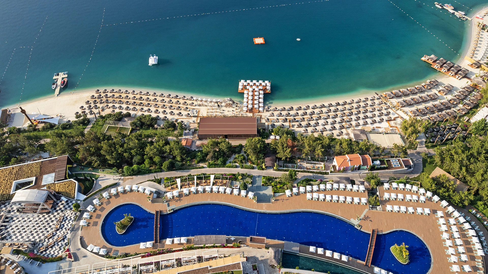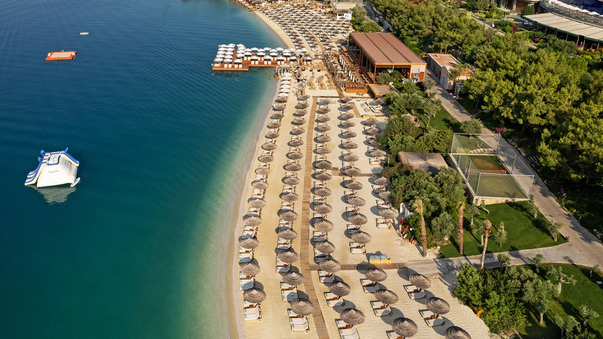 Комплексът разполага със собствен частен плаж, открит басейн и просторни зони за релакс, където гостите могат да се насладят на спокойствие и морски гледки. На разположение са ресторанти с изискана кухня и барове с разнообразие от напитки, създаващи перфектна атмосфера за отдих.
