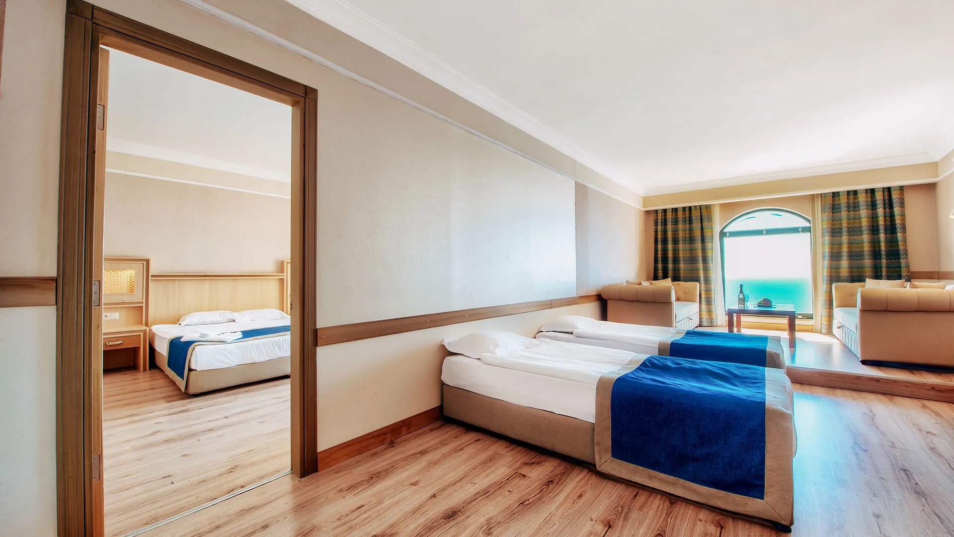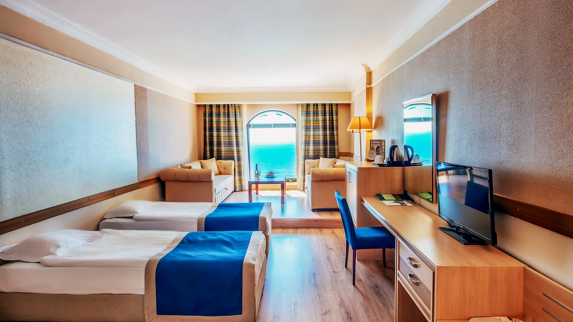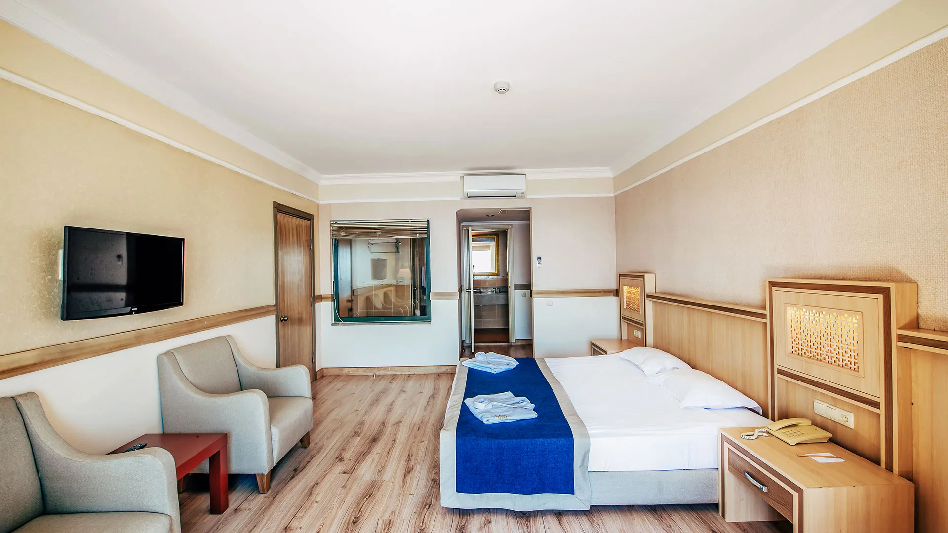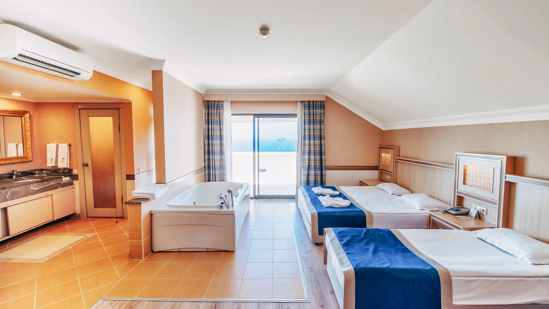 Стаите са просторни, модерно обзаведени, всички с балкон и гледка към морето или планината. Някои категории включват отделен салон и вана със СПА функции. Всяка стая разполага със сателитна телевизия, минибар, климатик и безплатен Wi‑Fi.