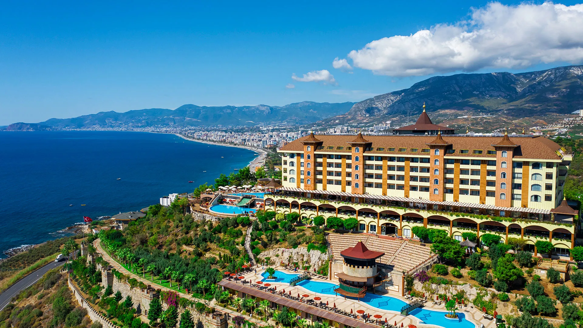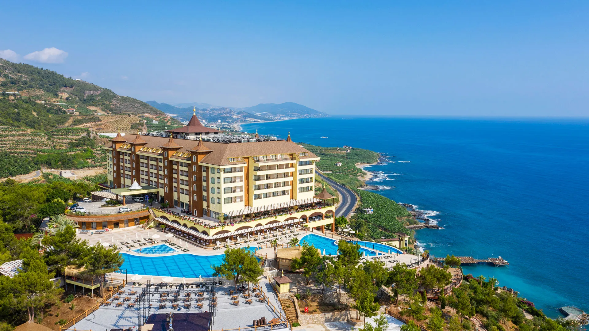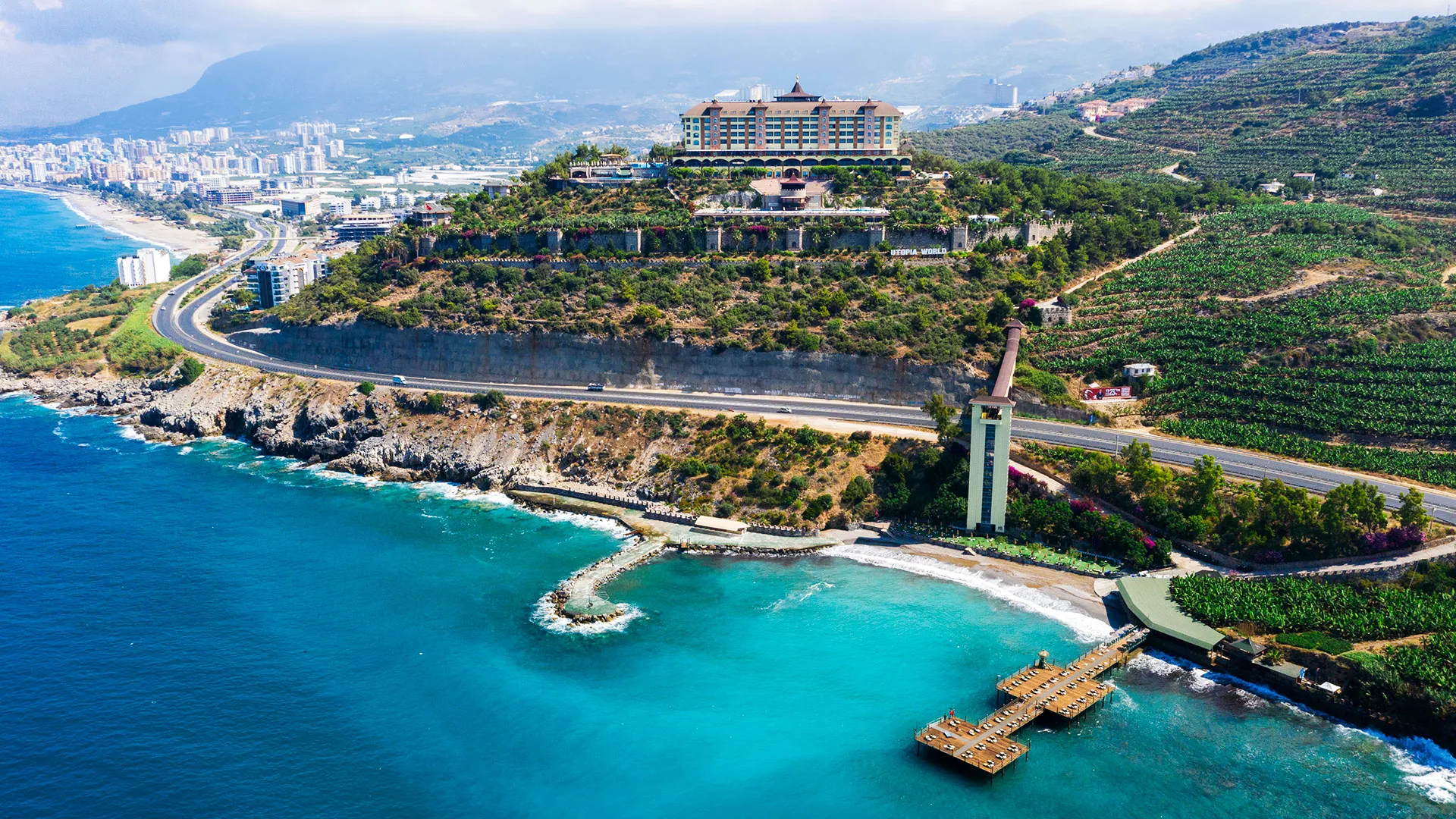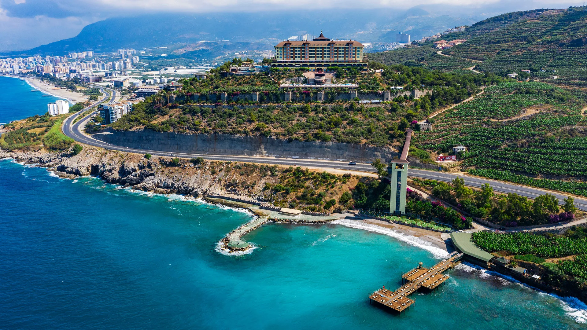 Хотел Utopia World се намира в квартал Къргъджак близо до Алания, провинция Анталия, Турция. Комплексът е разположен върху скалист участък с гледка към Средиземно море и разполага със собствен плаж с „Син флаг“. До центъра на Алания са около 15–17 км; до летище Газипаша са приблизително 21 км.