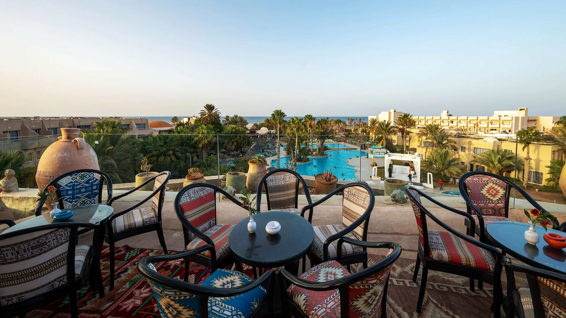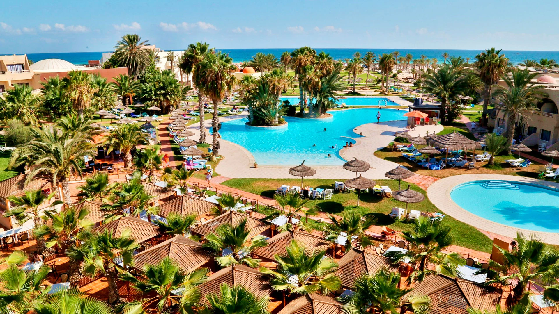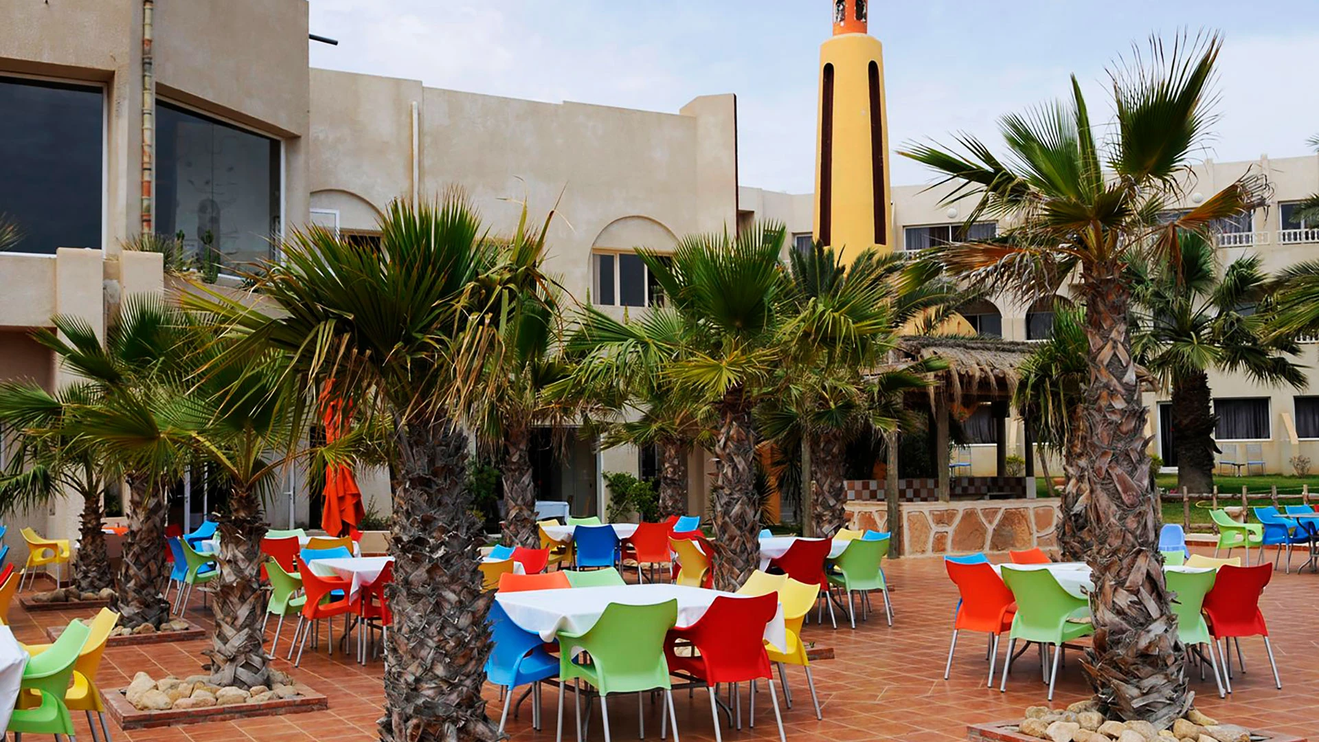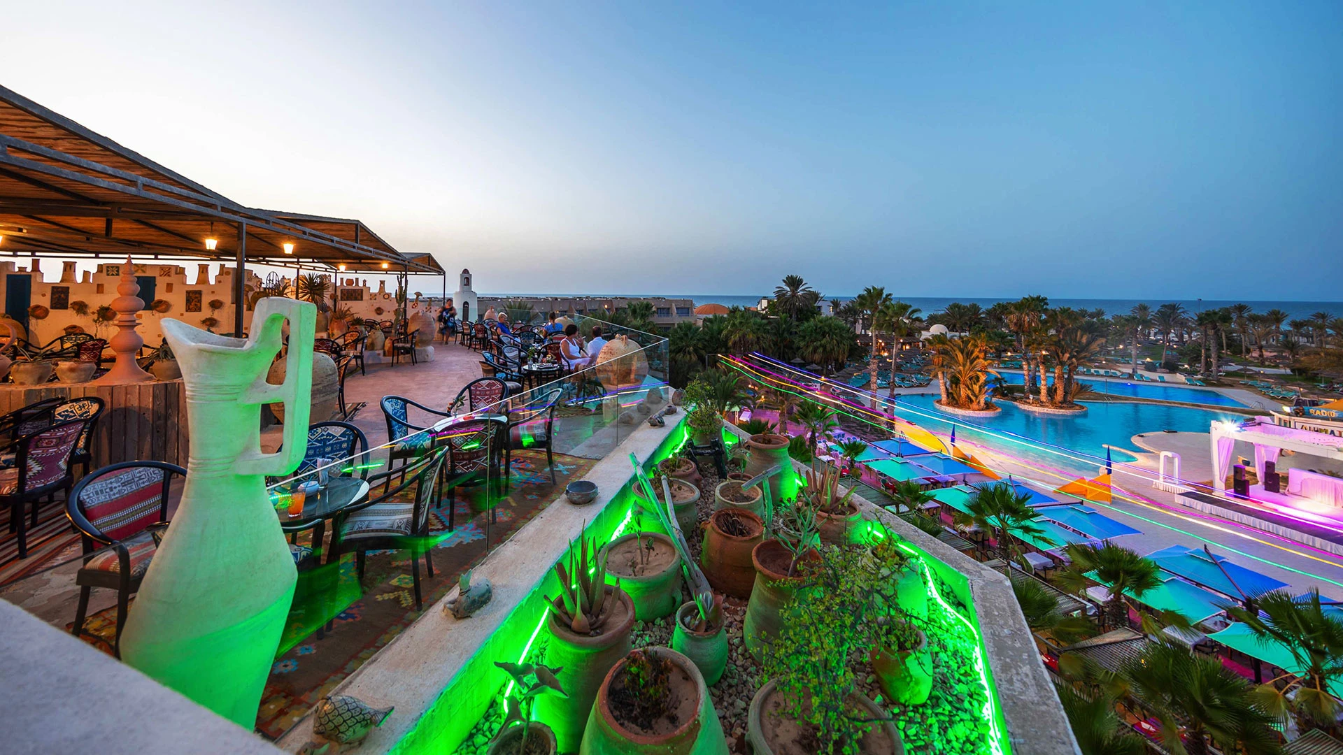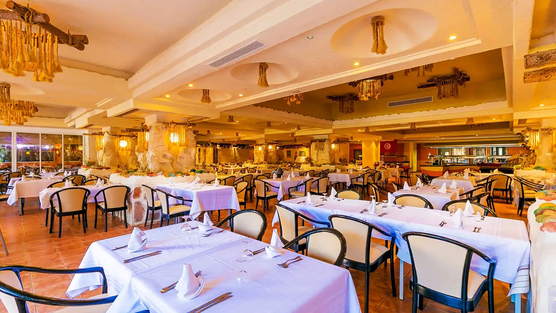 Основен ресторант, 2 а-ла-карт ресторанта (тунизийски и марокански – срещу заплащане/с предварителна резервация, съгласно концепцията на хотела/1 безплатно посещение на 1 от ресторантите при минимум 7 нощувки), 3 бара, мавританско кафене (срещу заплащане), открит басейн, 3 водни пързалки, закрит басейн (от 01.11 до 31.03), закрит басейн с морска вода в Таласо центъра (срещу заплащане), 2 конферентни зали и заседателна зала, магазин, обмяна на валута, денонощна рецепция, Таласо център.