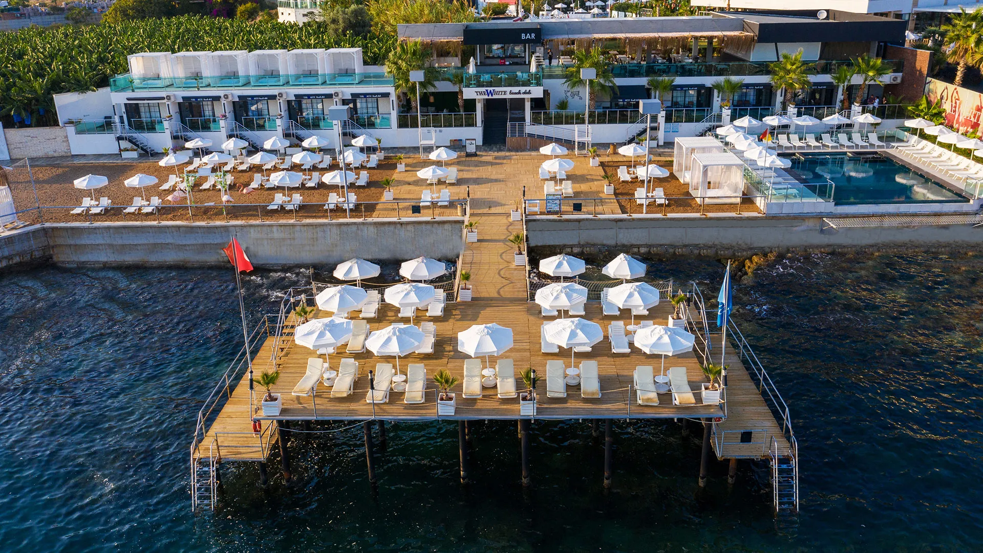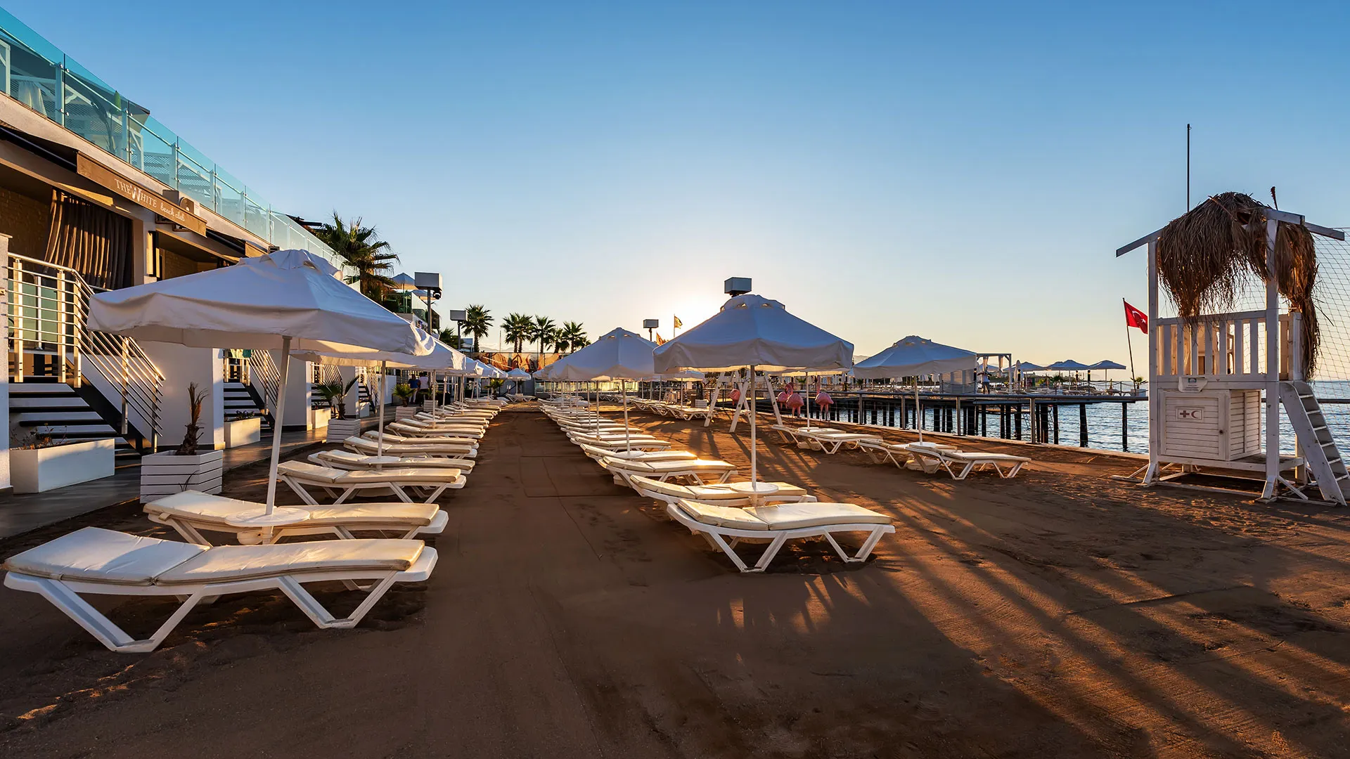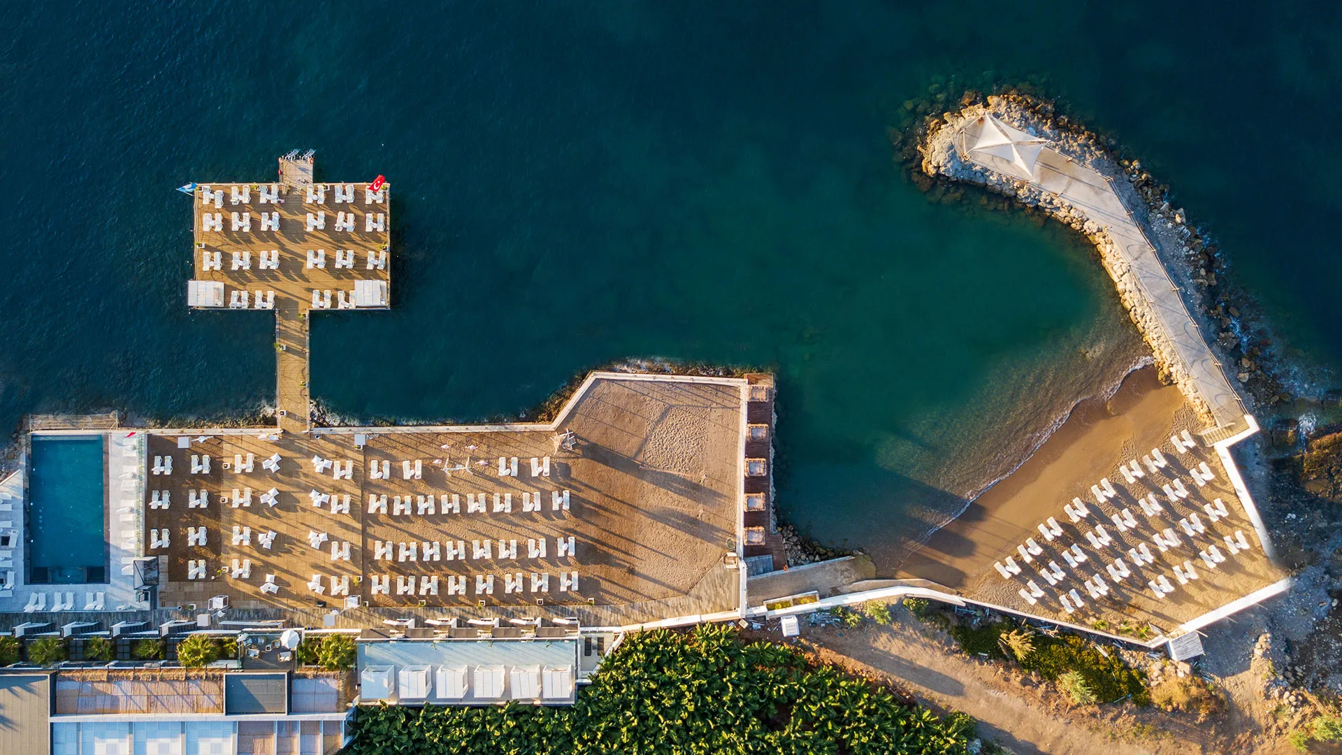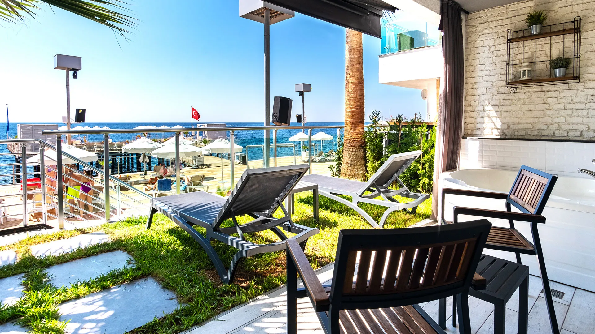 Собственият пясъчно-чакълест плаж с кей предлага удобство и релаксация, а безплатното ползване на чадъри и шезлонги осигурява комфорт през целия ден.