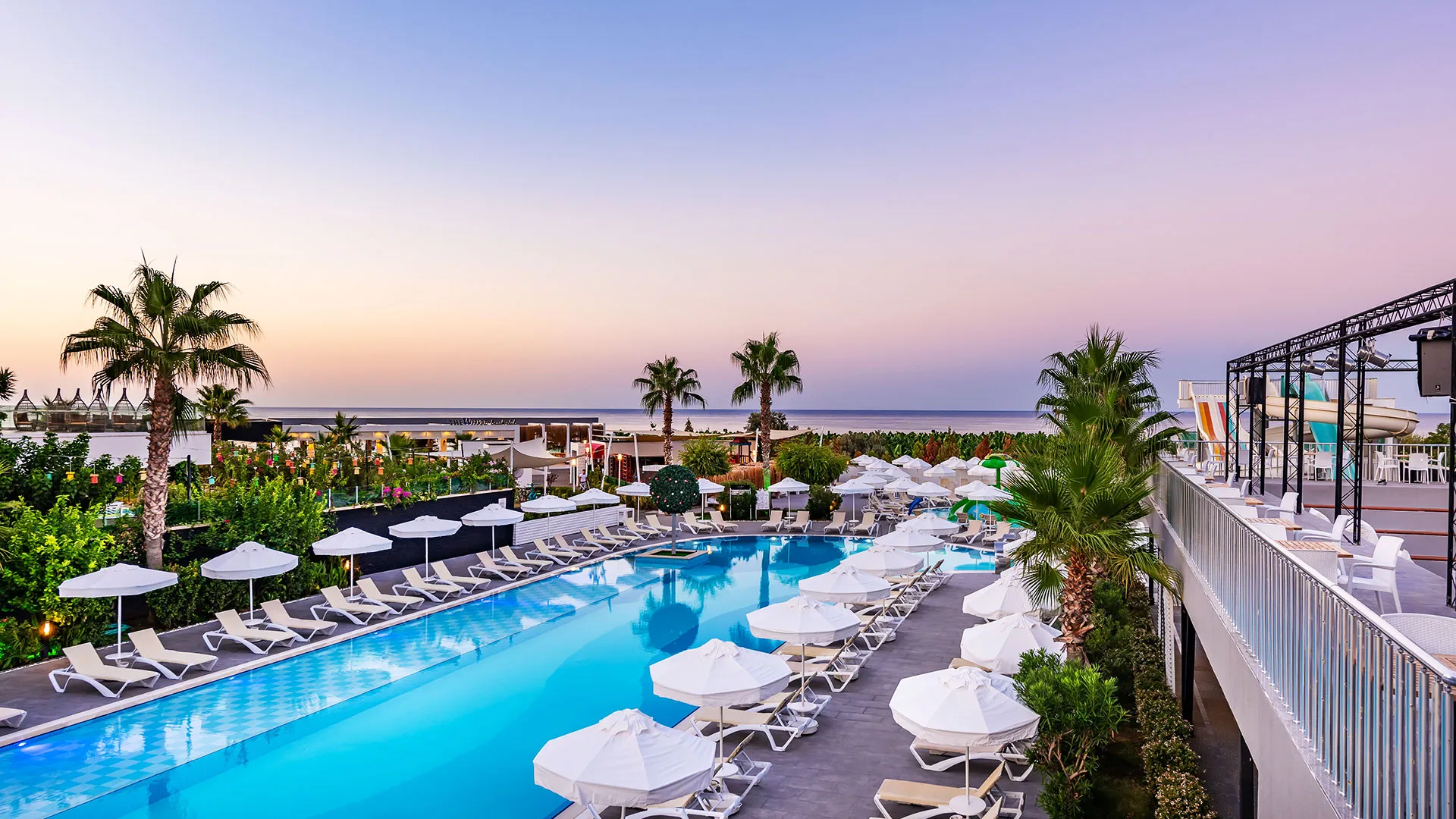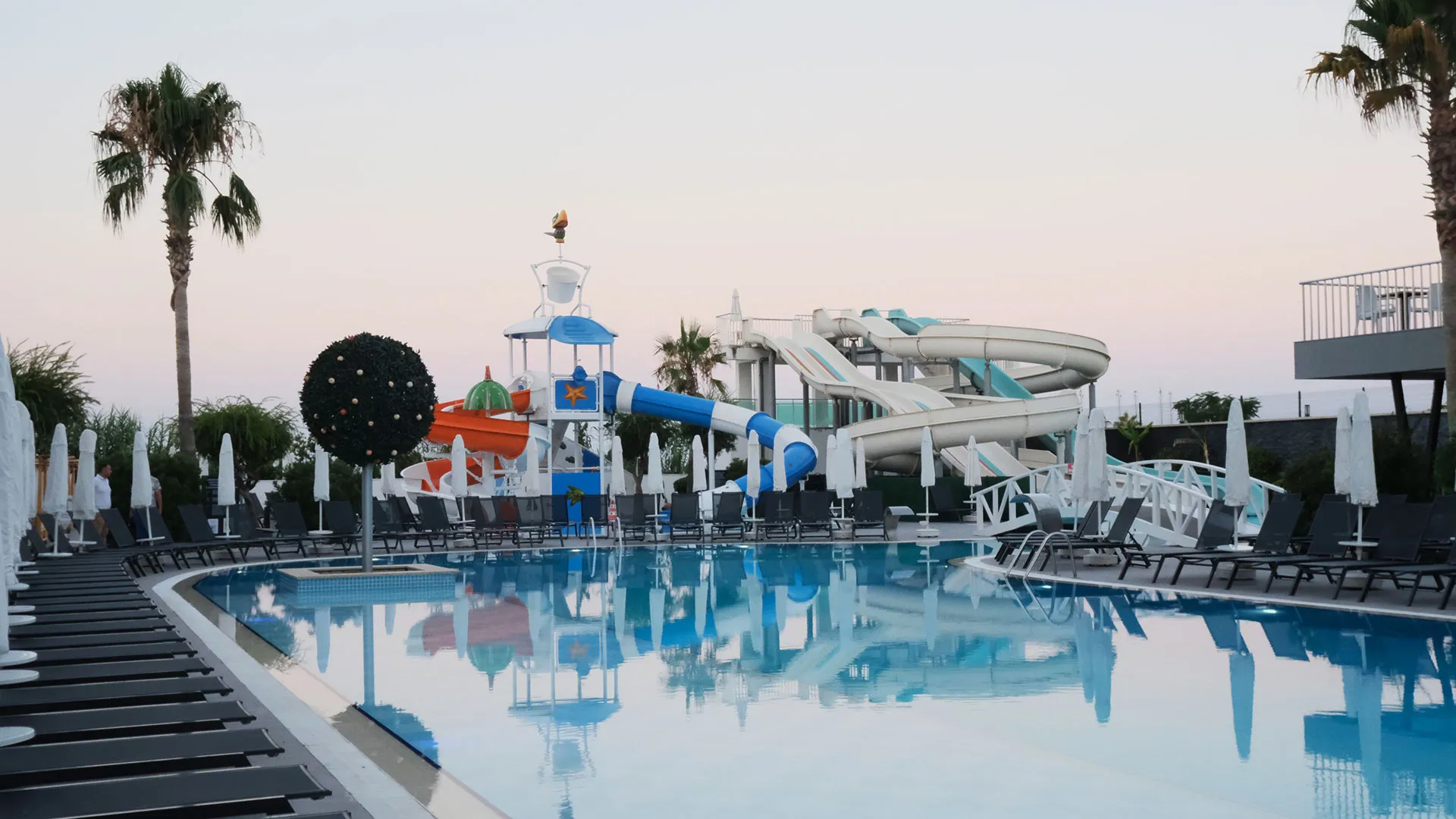 В комплекса се предлагат разнообразни забавления и релаксиращи възможности, включително основен ресторант, барове, басейни и водни пързалки, SPA център с турска баня и сауна, както и анимационни програми.
