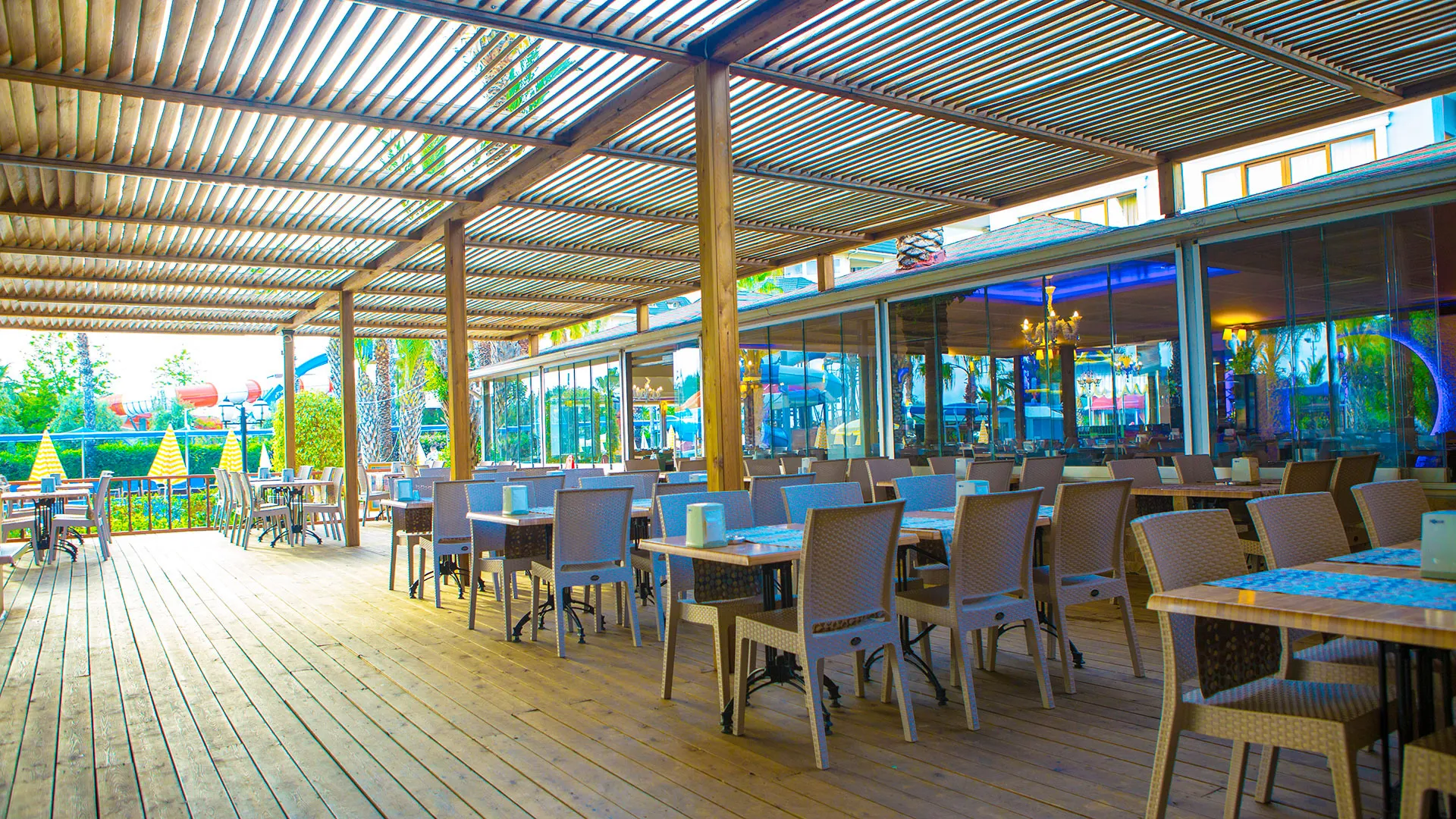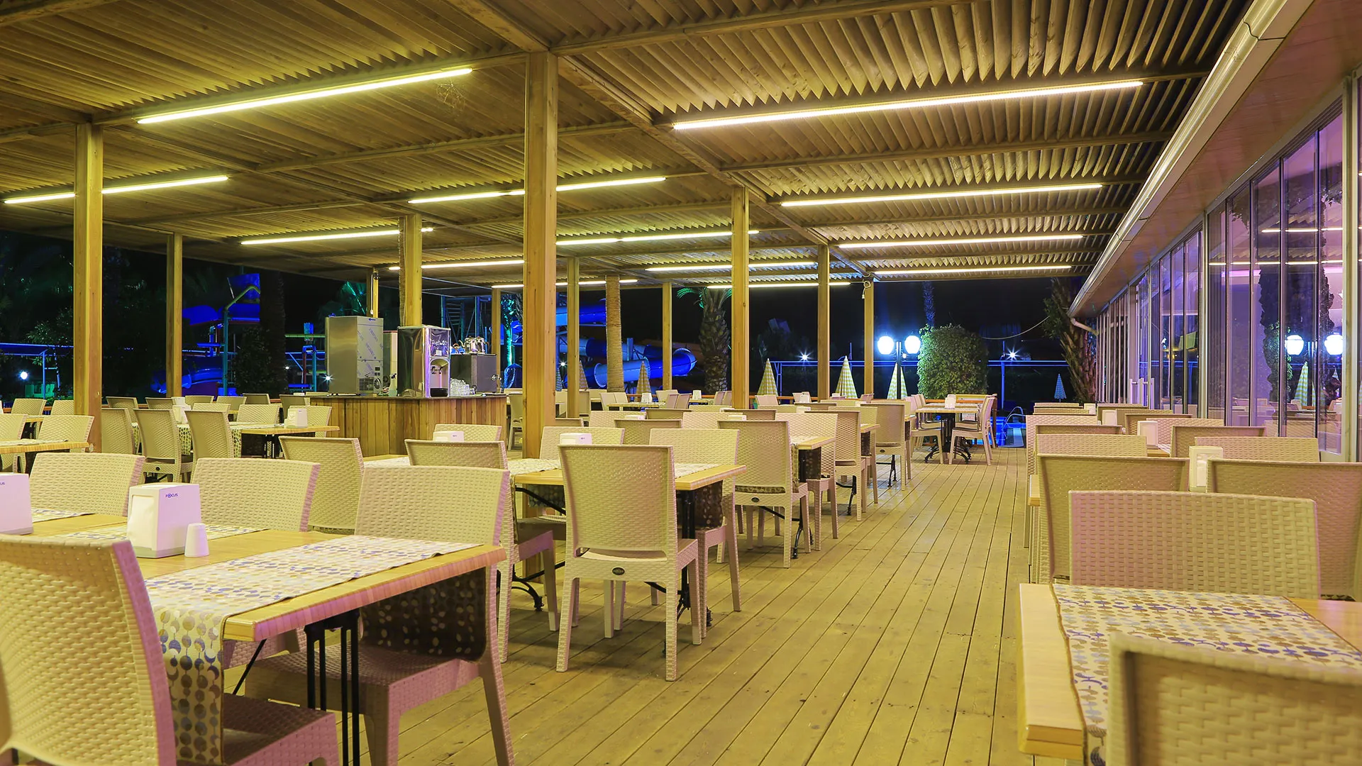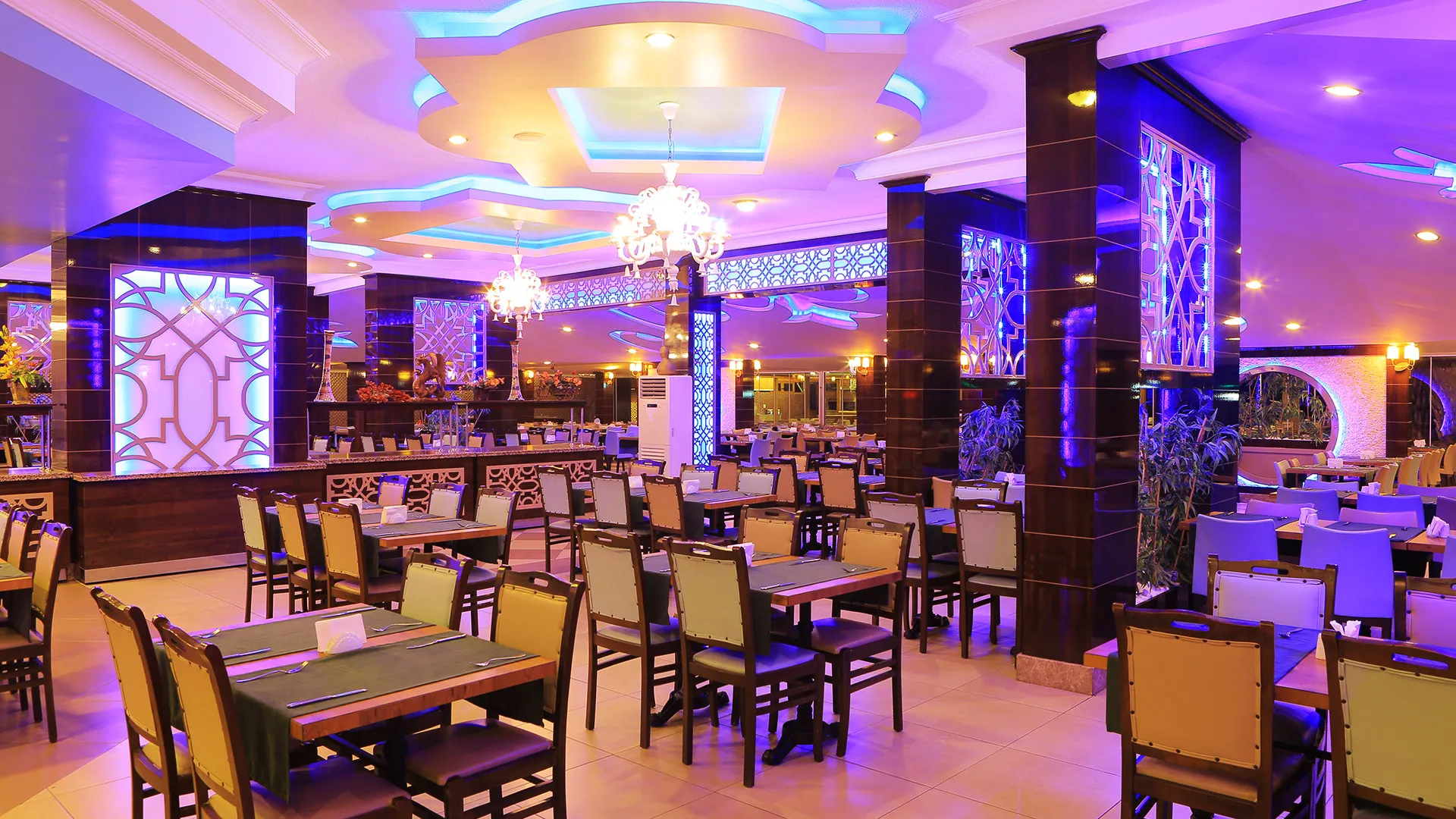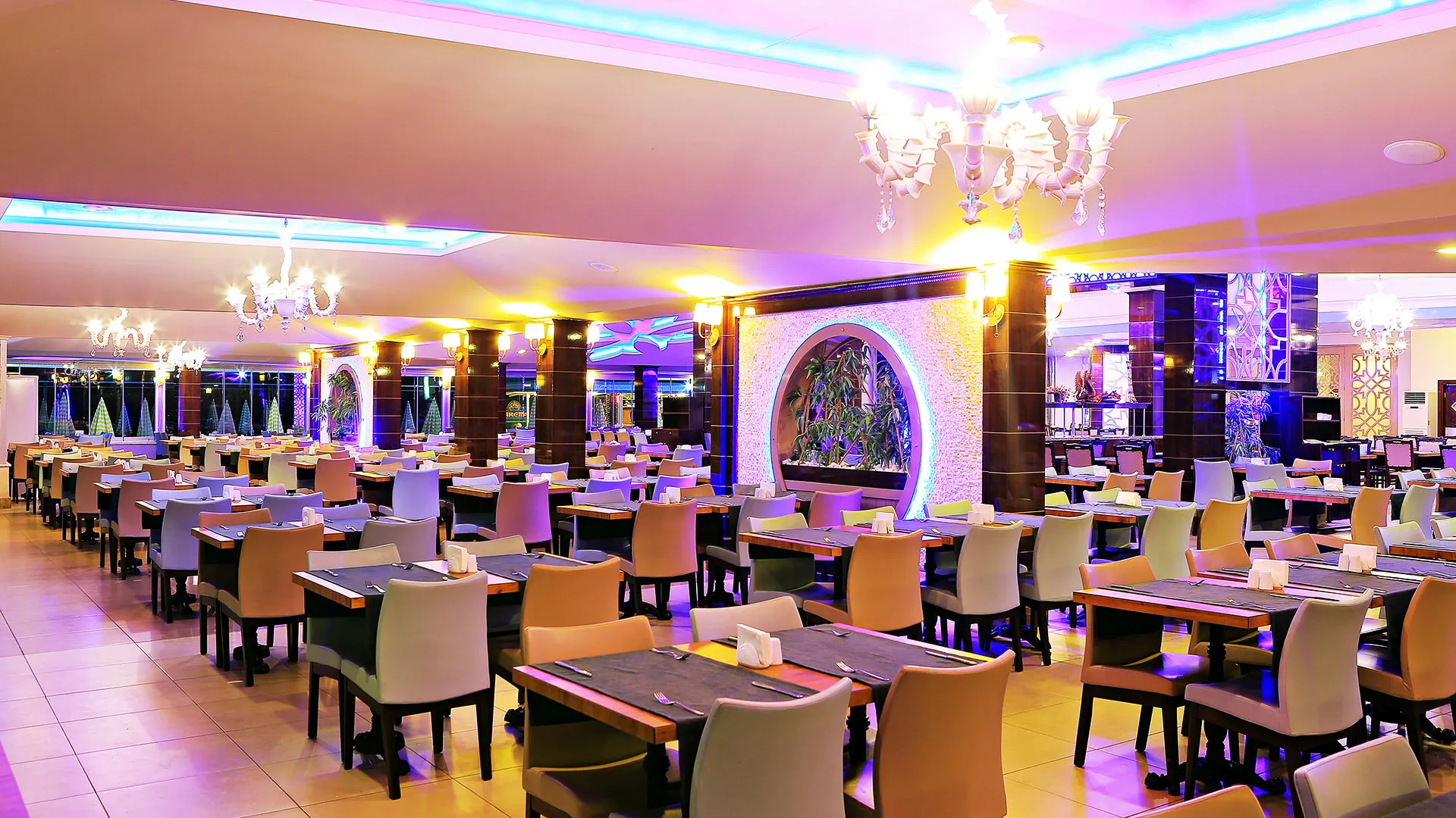 За хранене и развлечения хотелът предлага ресторанти с разнообразна кухня, барове и кафенета, където гостите могат да се насладят на вкусни ястия и освежаващи напитки. Вечерите са оживени с шоу програми, жива музика и тематични вечери, които създават уникална атмосфера за забавление.