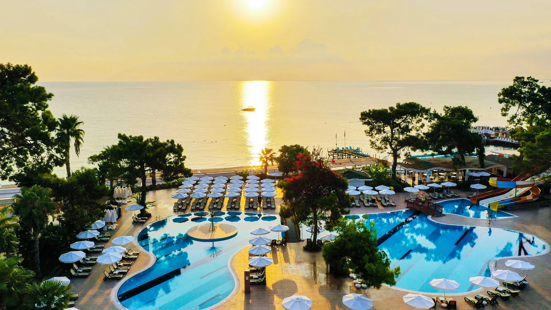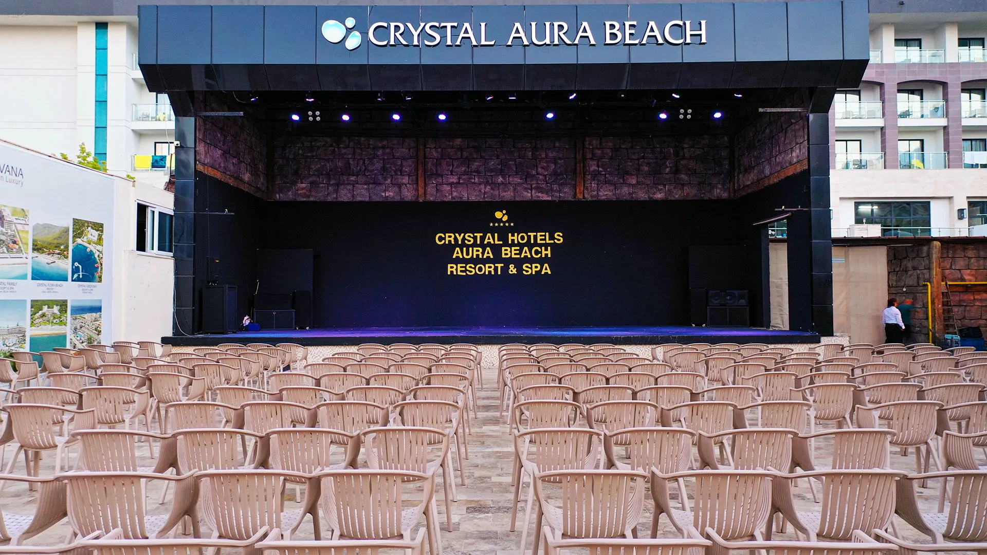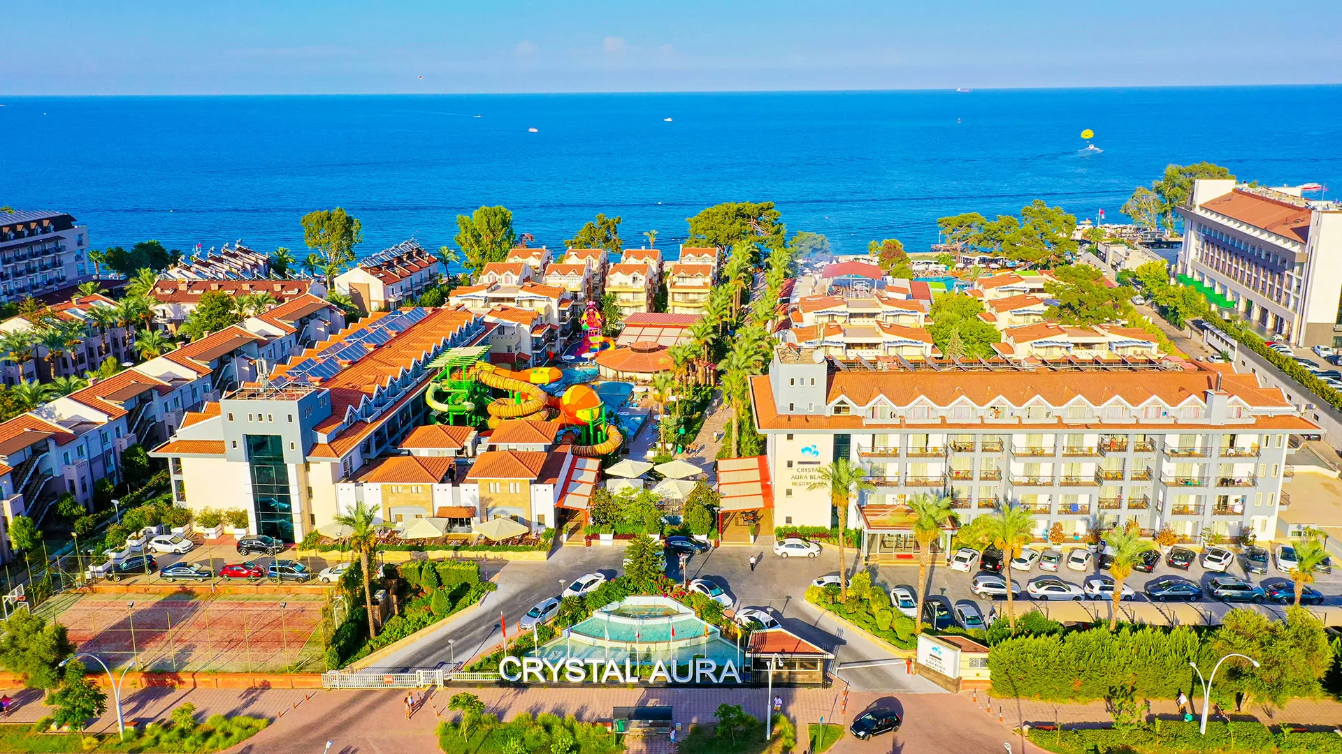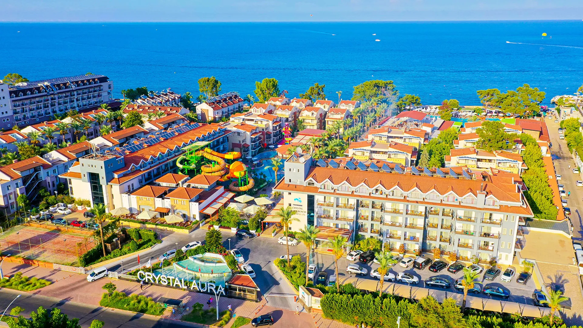 Crystal Aura разполага с уникално местоположение само на кратко разстояние от пясъчния бряг на морето, като предлага на своите гости частен плаж, изкусителен СПА център и изобилие от басейни, както на открито, така и на закрито. Всички стаи, обградени с климатизация, ви карат да се почувствате като у дома, предлагайки сателитна телевизия и уютен балкон, от който може да се насладите на красивите гледки.