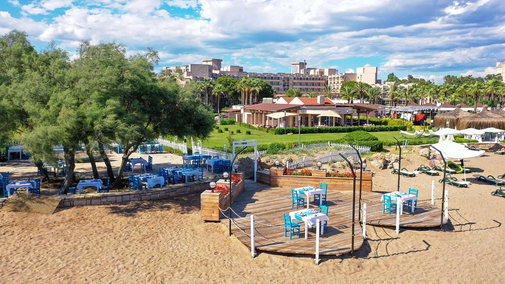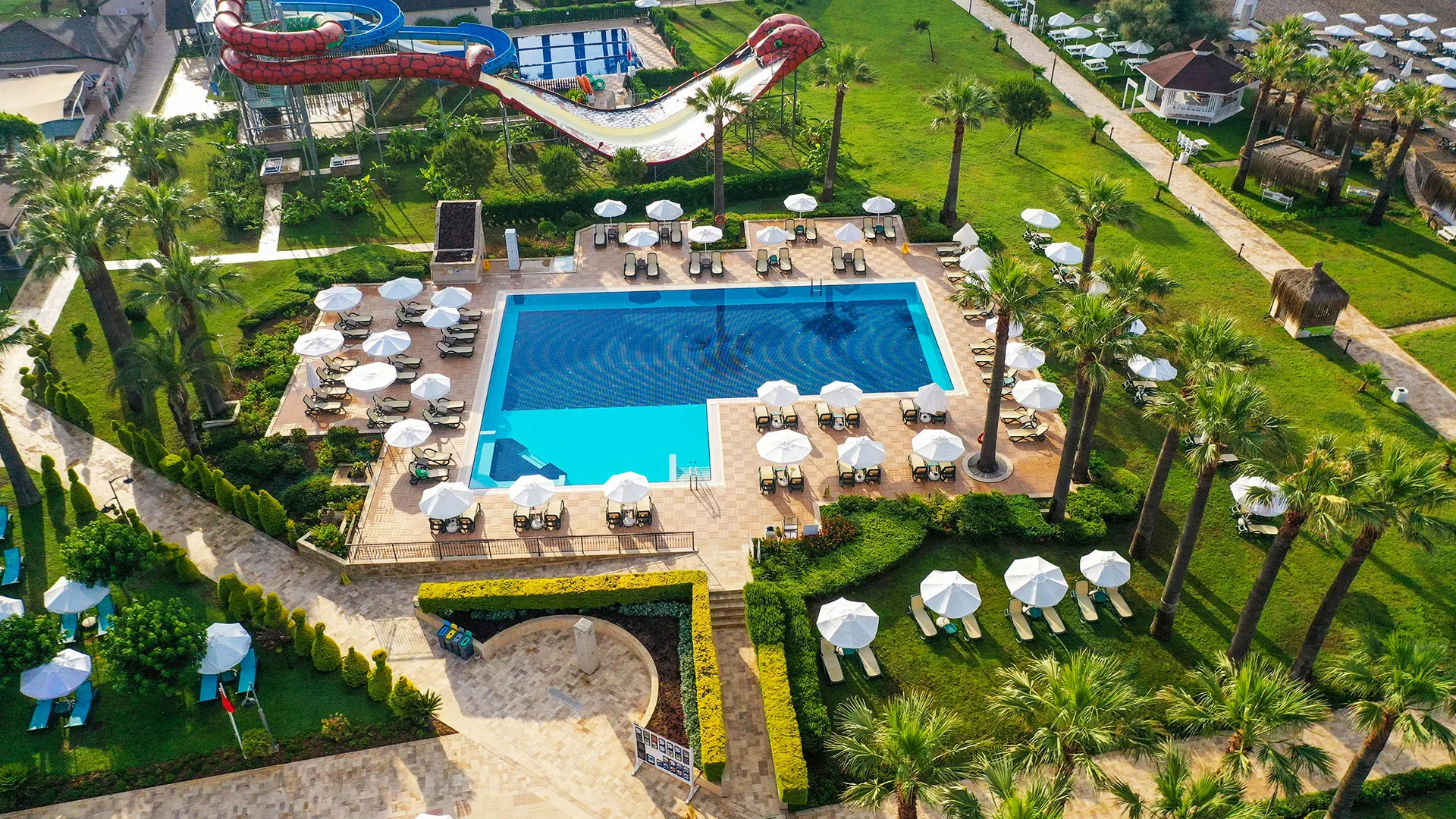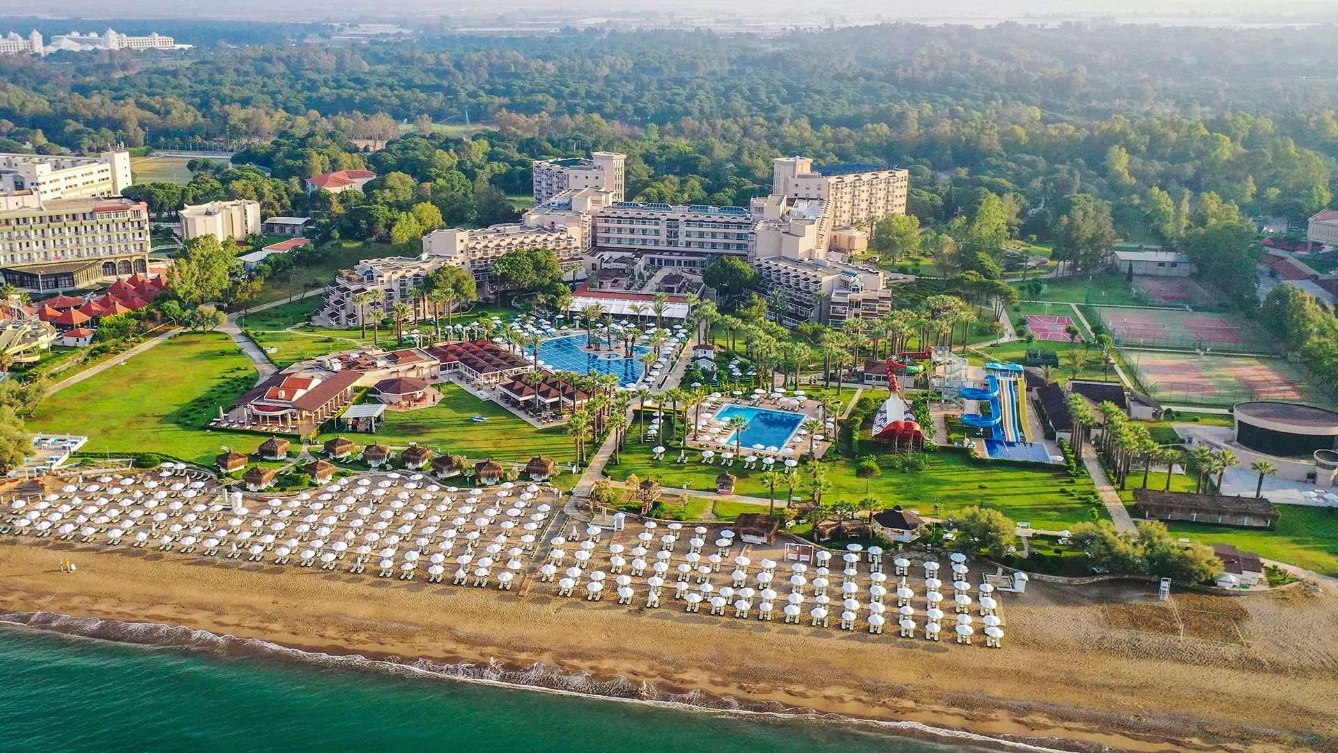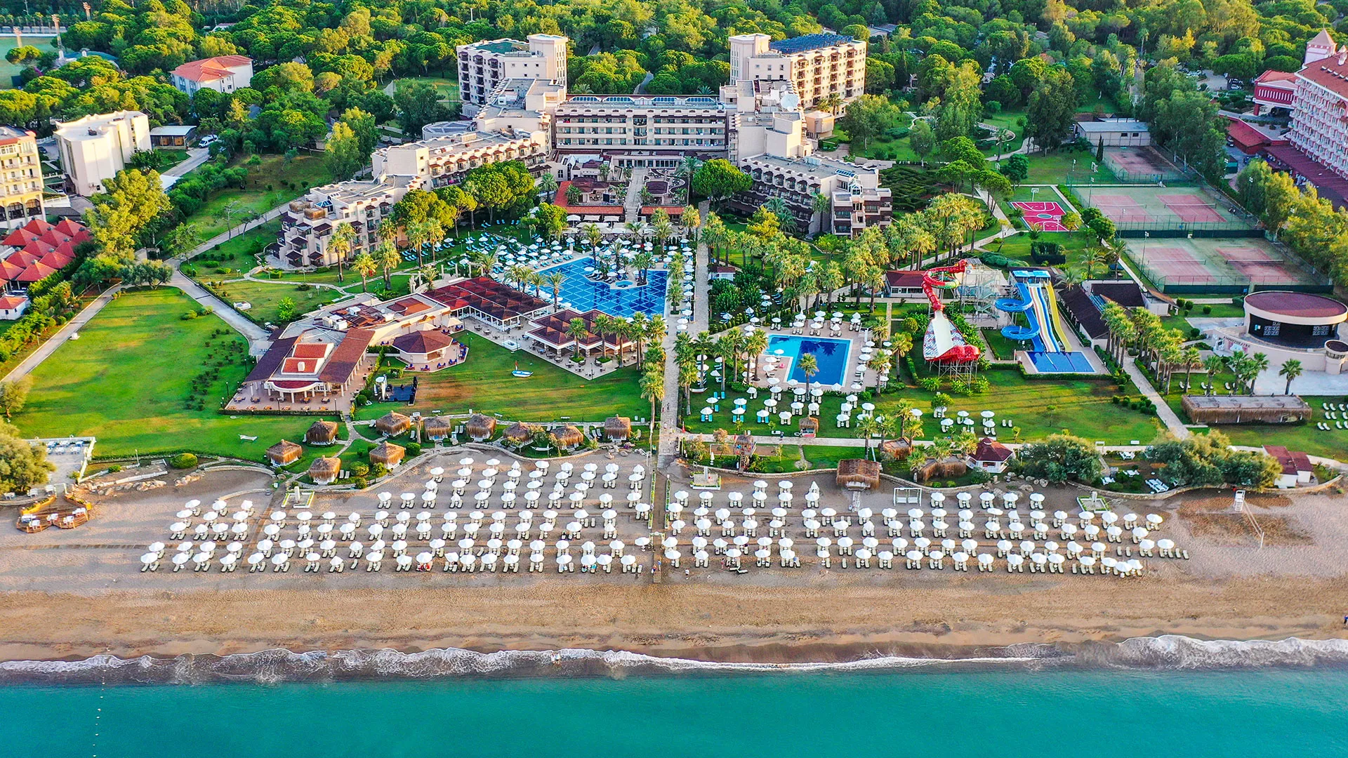 Сред удобствата за активен отдих на място са петте тенис корта, аквапаркът с водни пързалки и изцяло оборудваният здравен и фитнес център. За желаещите да открият околните забележителности, древният амфитеатър Аспендос е на кратко разстояние с кола, предлагайки на посетителите уникално историческо преживяване.