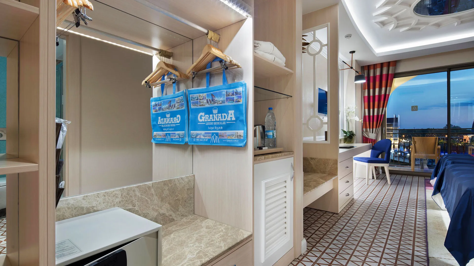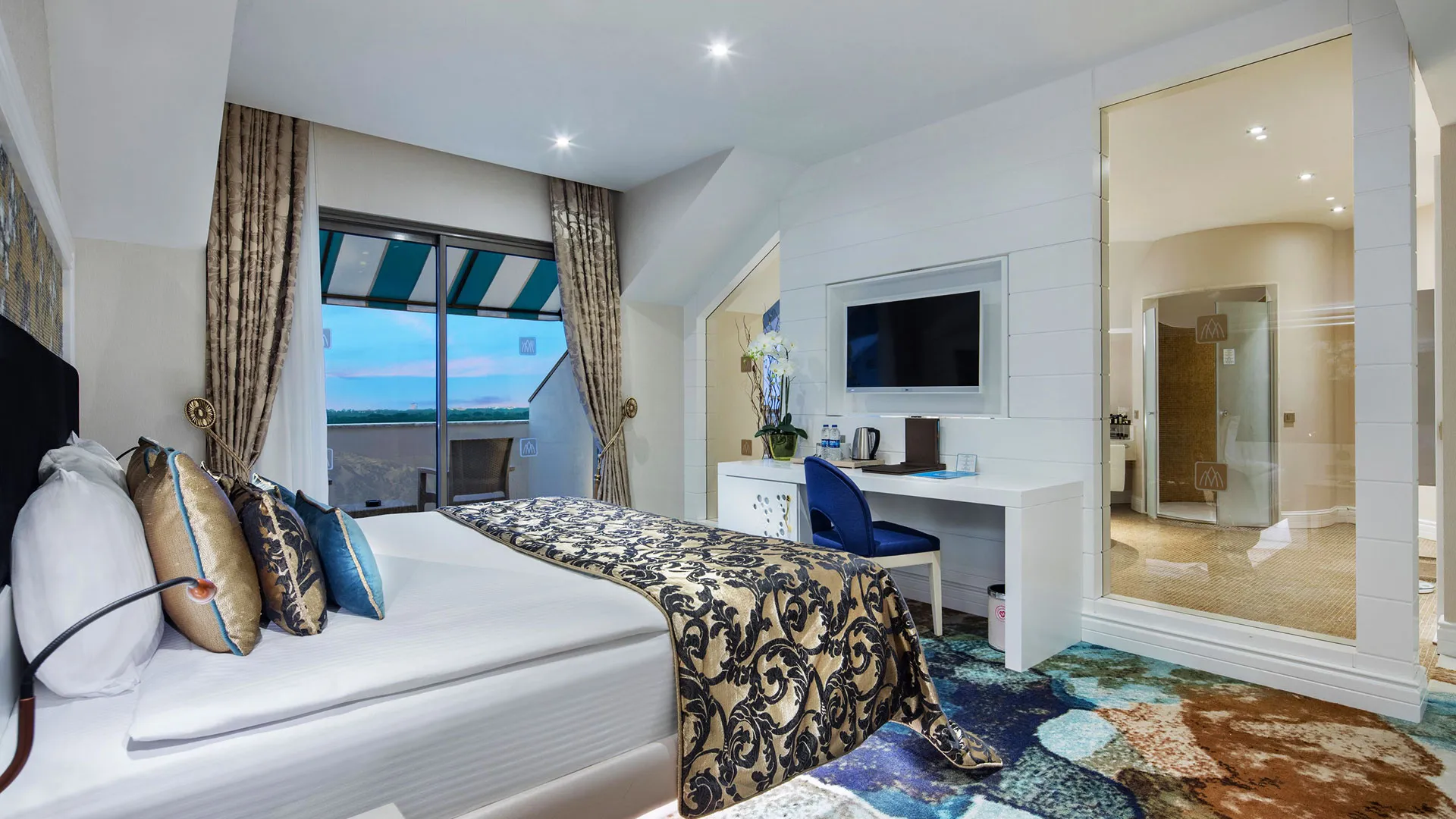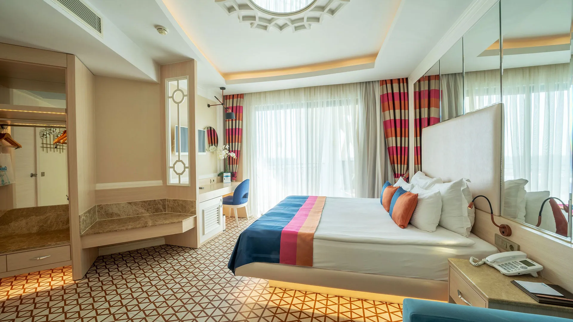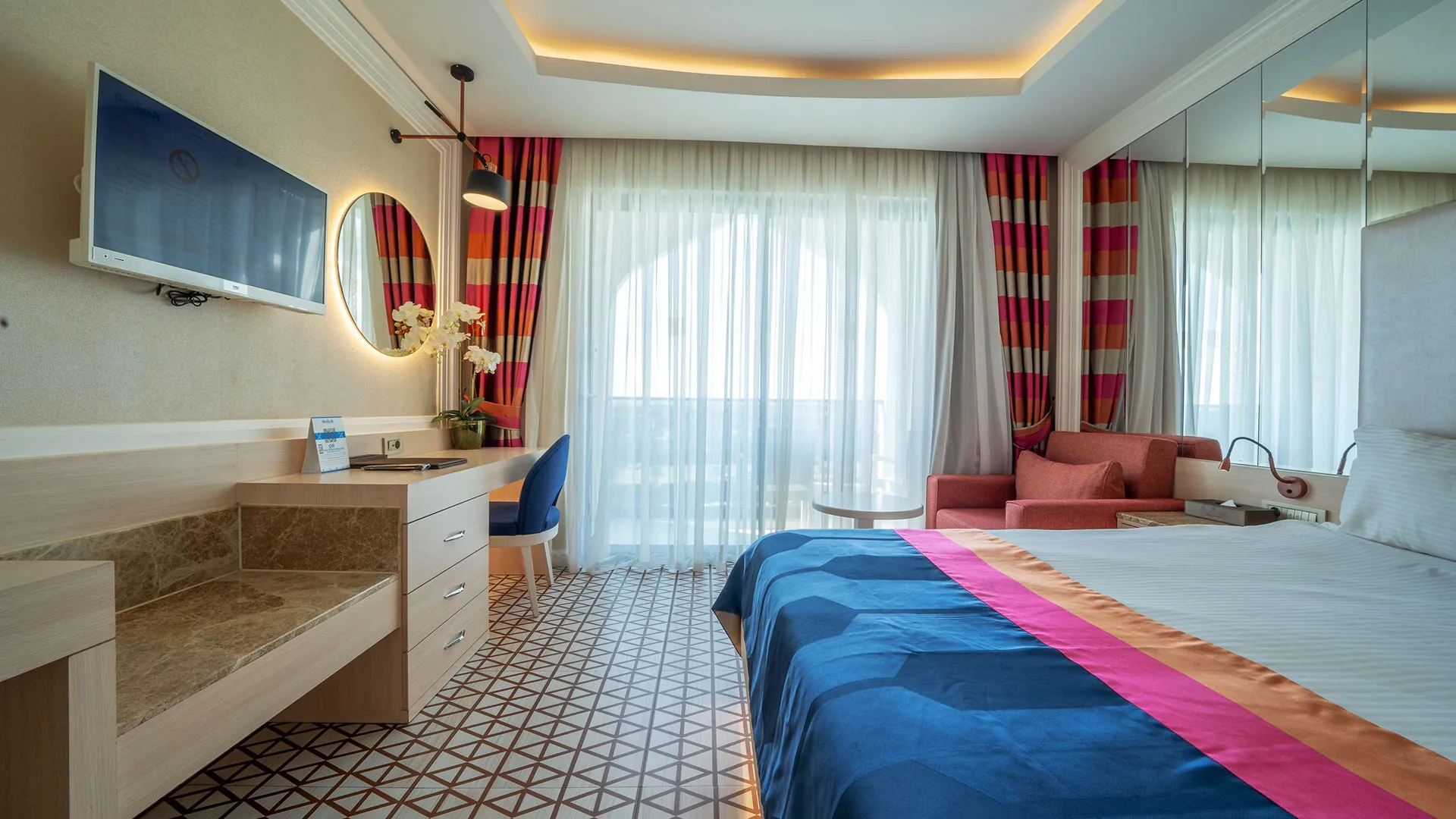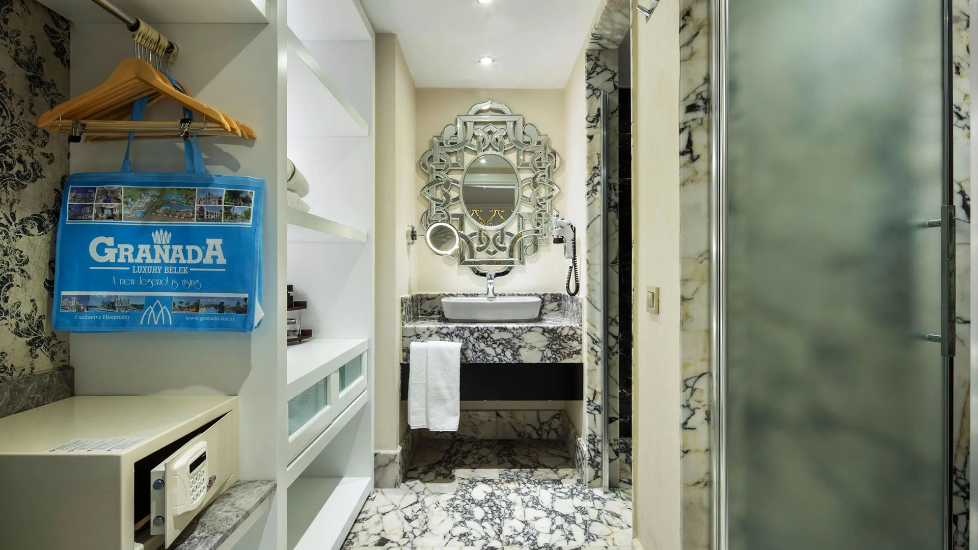Всяка стая в Granada Luxury Belek разполага с климатик, телевизор, сейф и минибар. Гостите могат да се насладят на свежия средиземноморски въздух от балкона на стаята. Всички стаи имат собствена баня с душ.