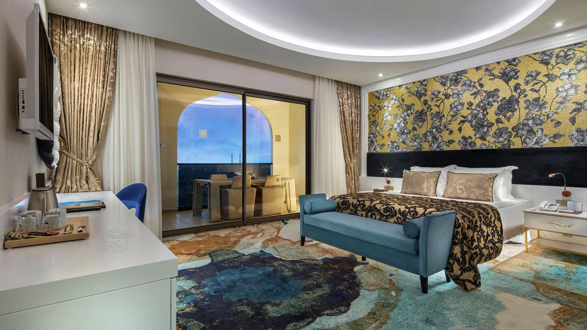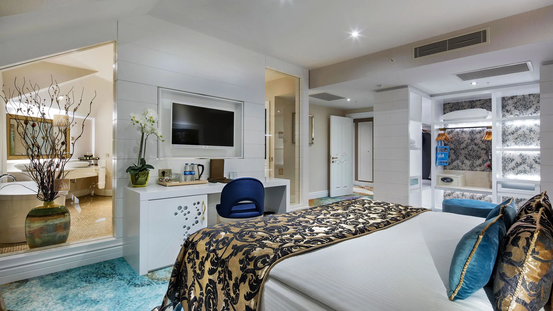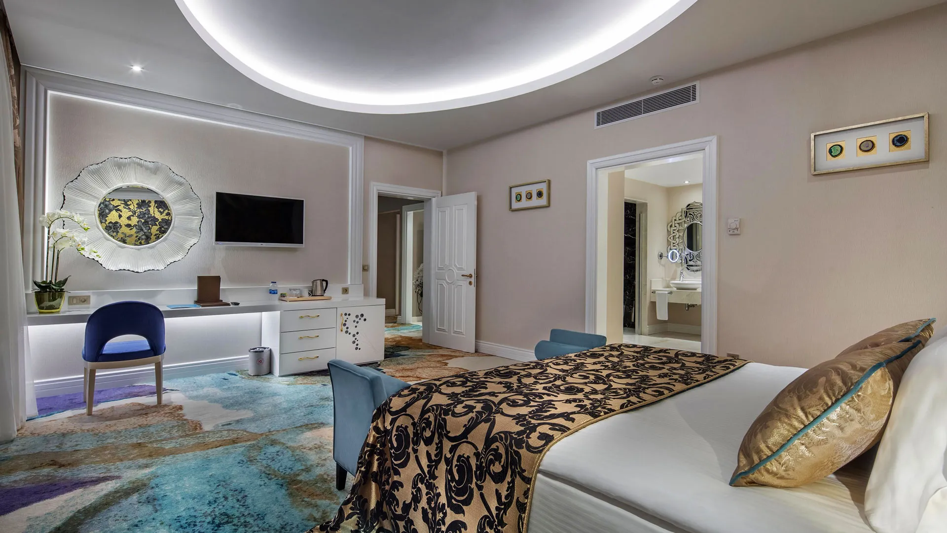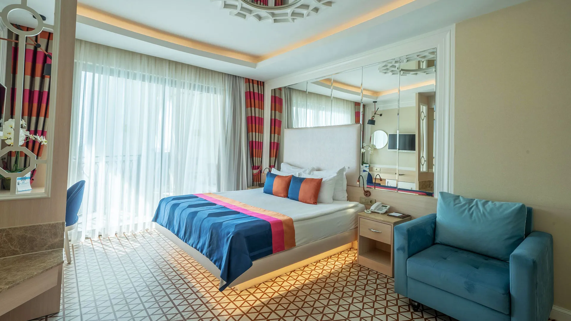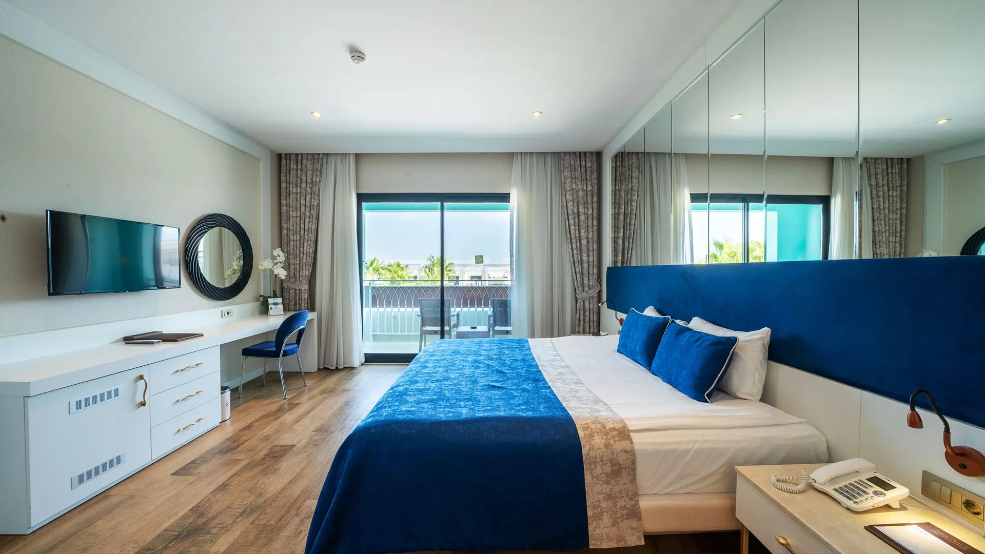 Всяка стая в Granada Luxury Belek разполага с климатик, телевизор, сейф и минибар. Гостите могат да се насладят на свежия средиземноморски въздух от балкона на стаята. Всички стаи имат собствена баня с душ.