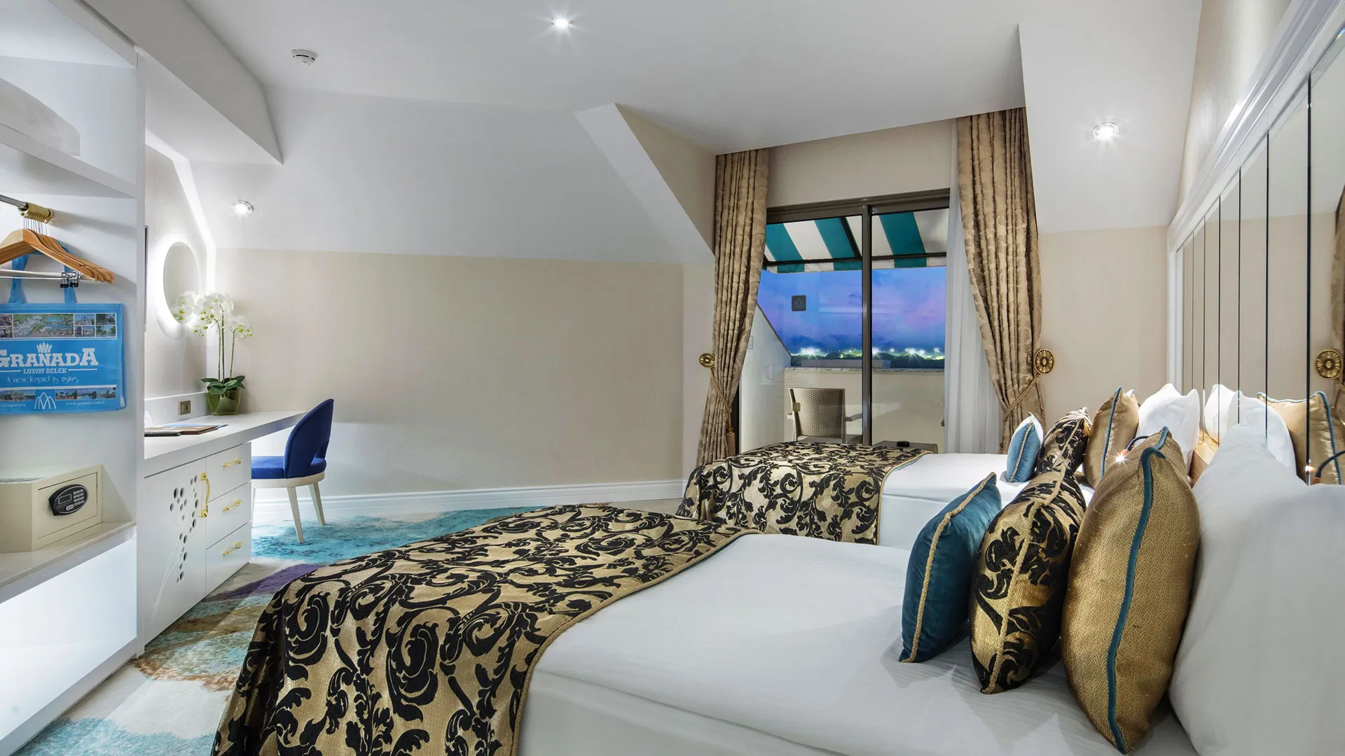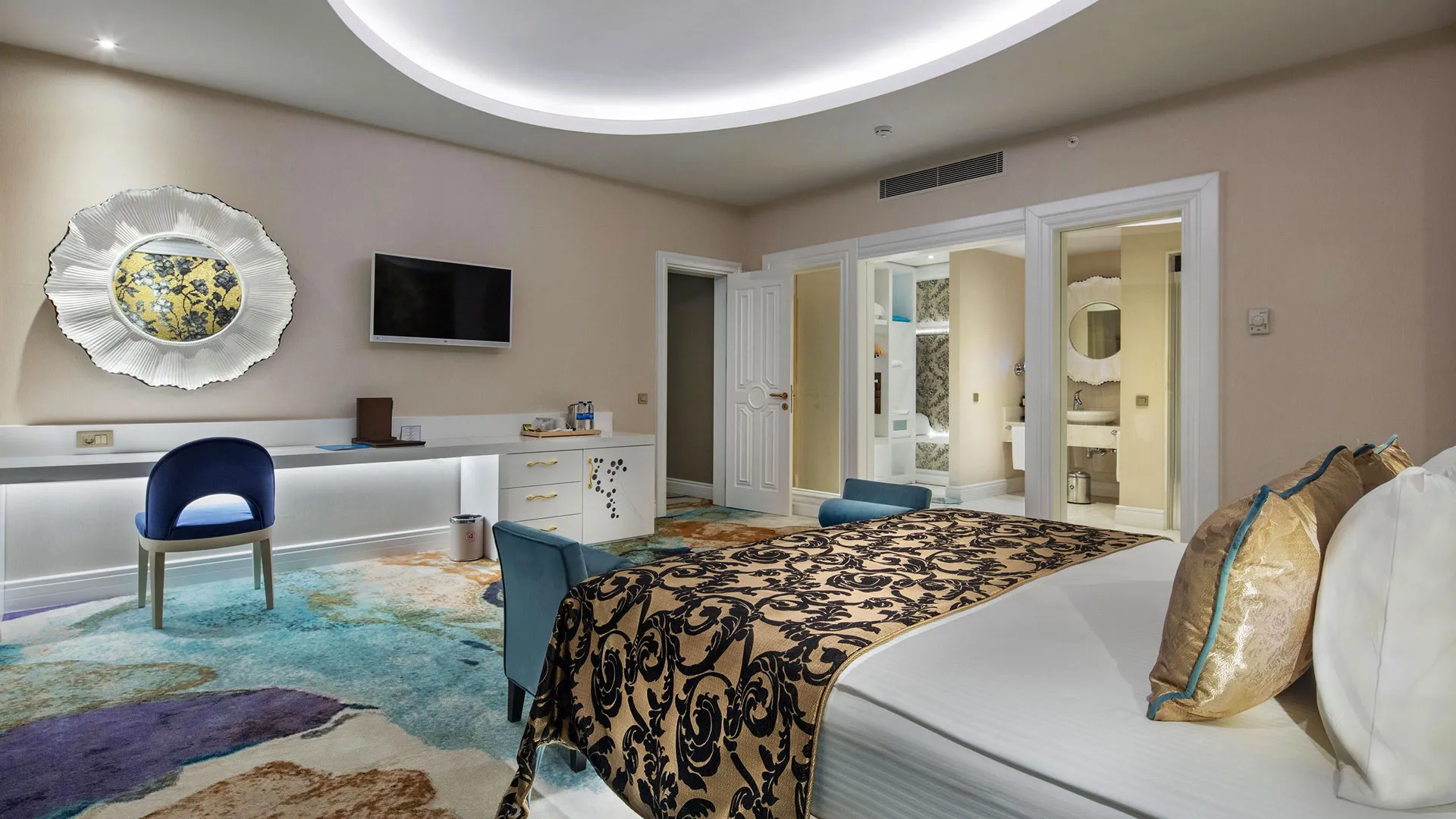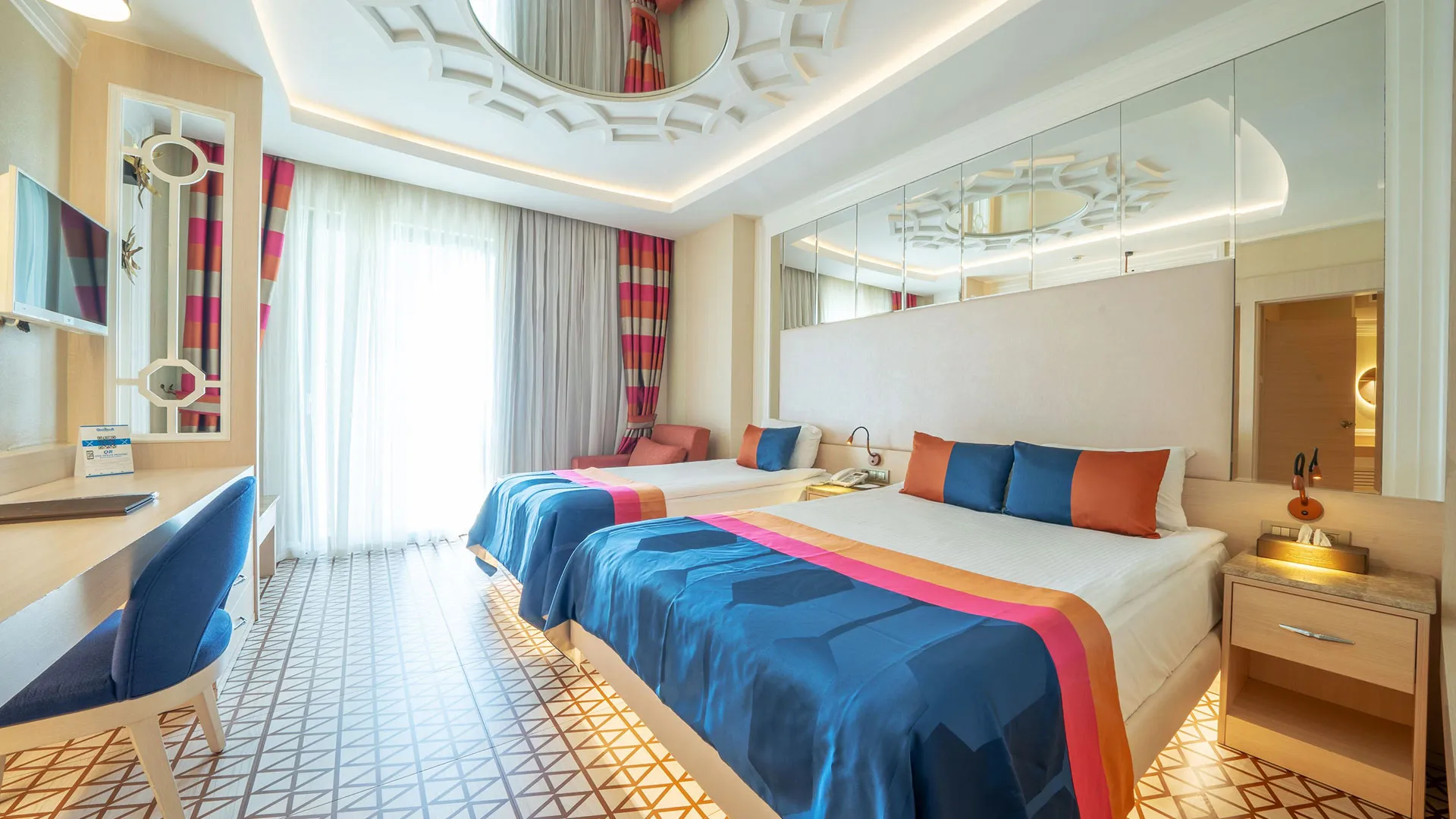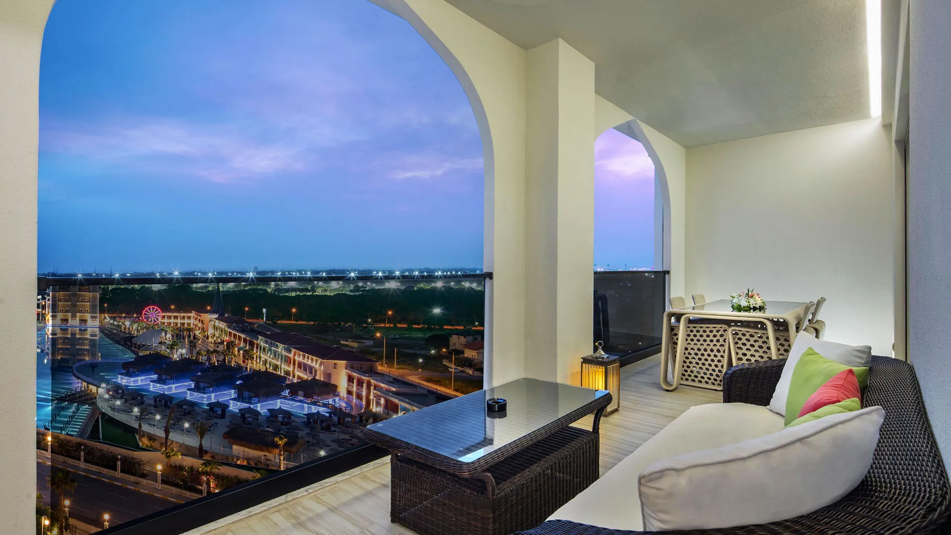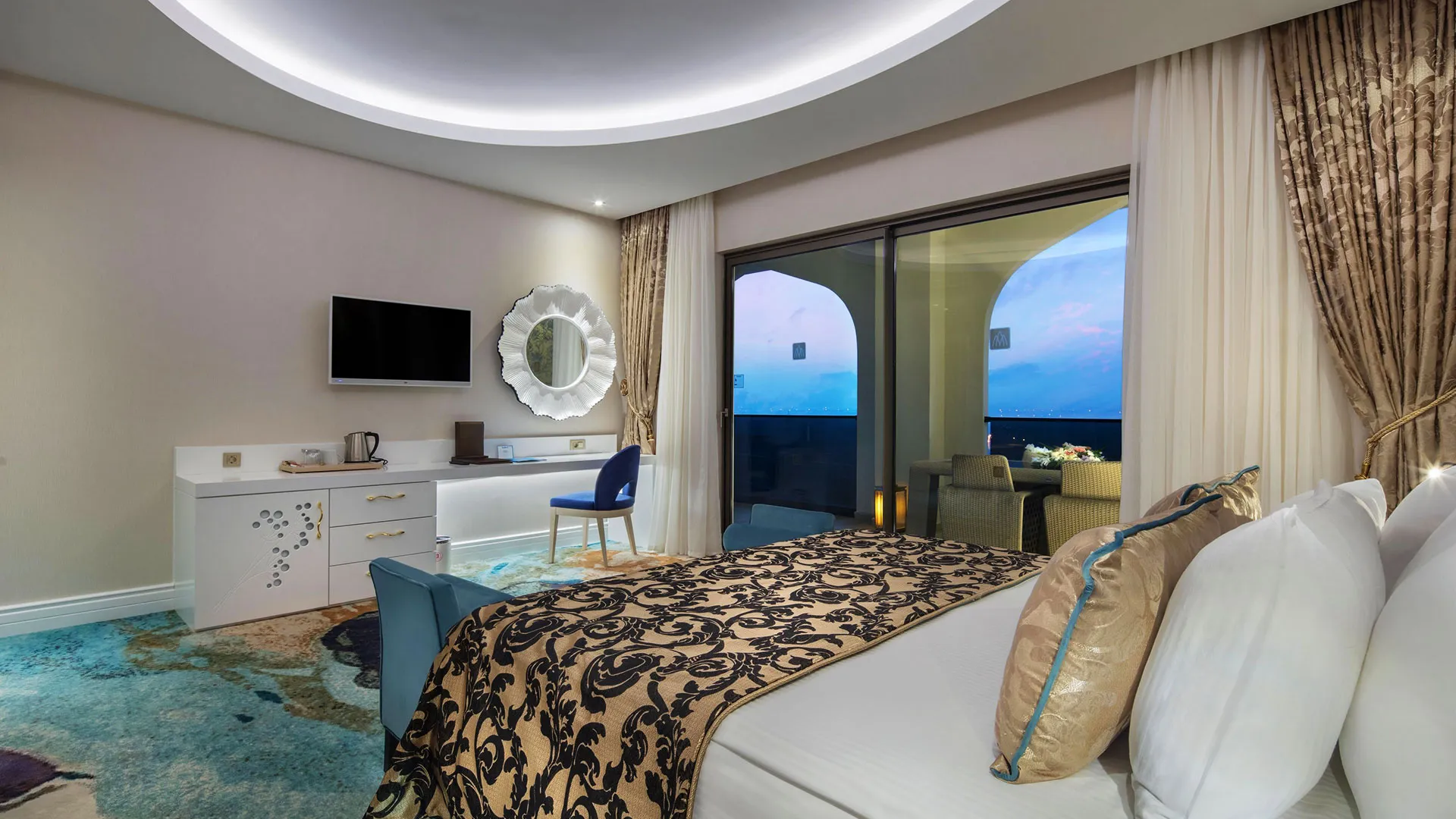 Всяка стая в Granada Luxury Belek разполага с климатик, телевизор, сейф и минибар. Гостите могат да се насладят на свежия средиземноморски въздух от балкона на стаята. Всички стаи имат собствена баня с душ.