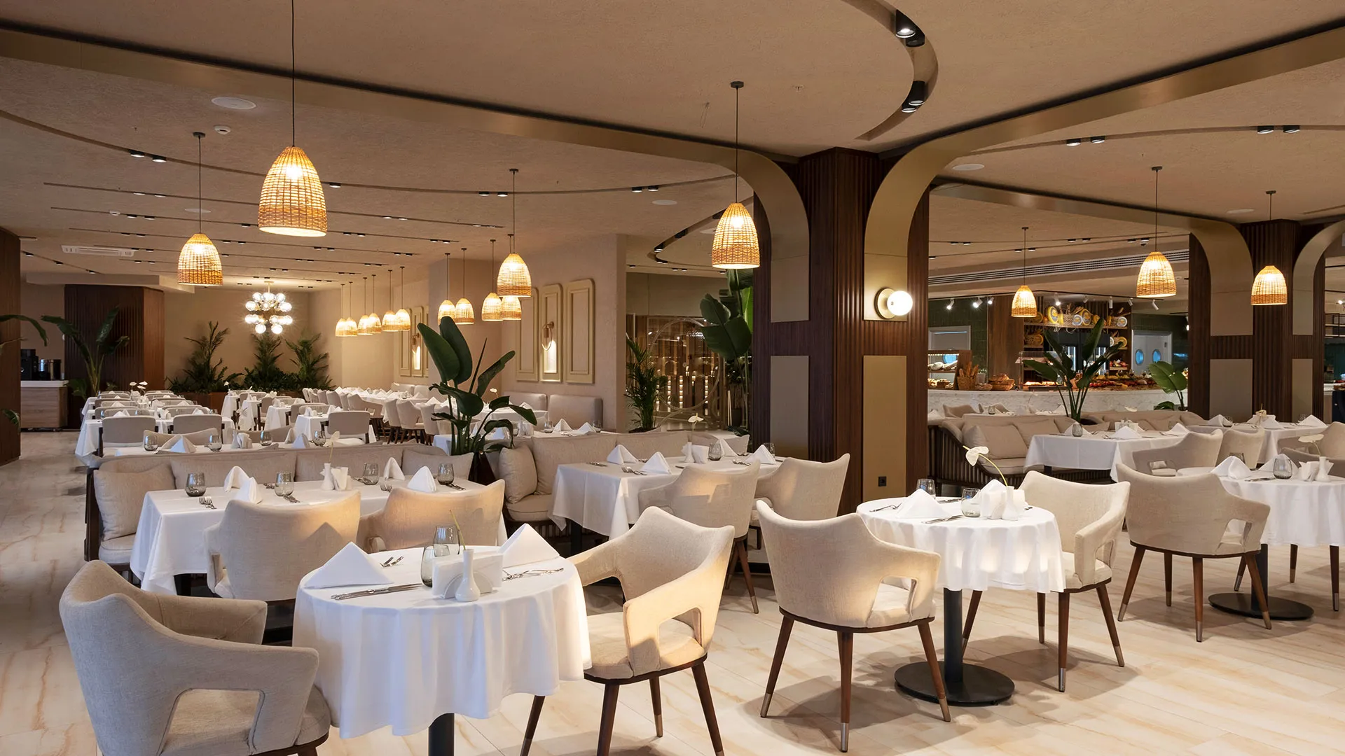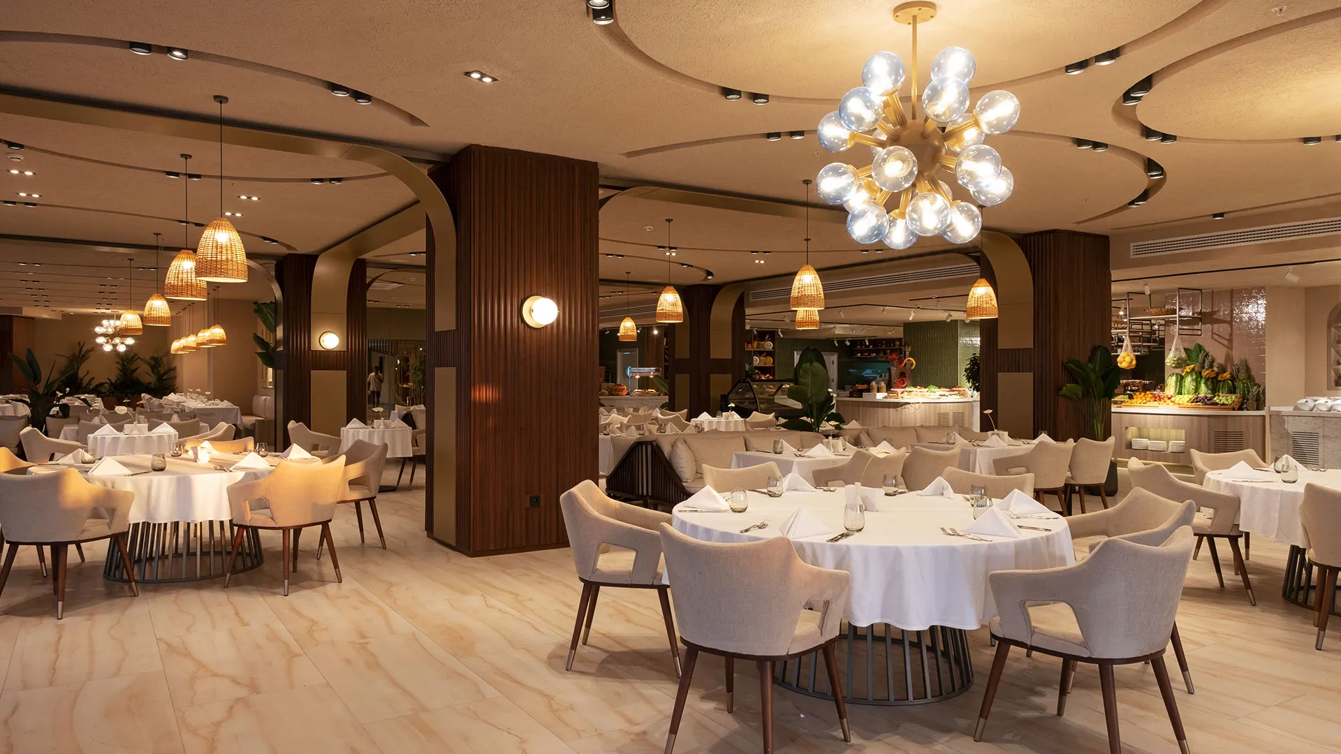 Ресторантът на място предлага разнообразие от кулинарни изкушения, включително пица, морски дарове и суши, като в същото време се грижи за специалните диетични предпочитания на гостите, предлагайки вегетариански, халал и вегетариански ястия.