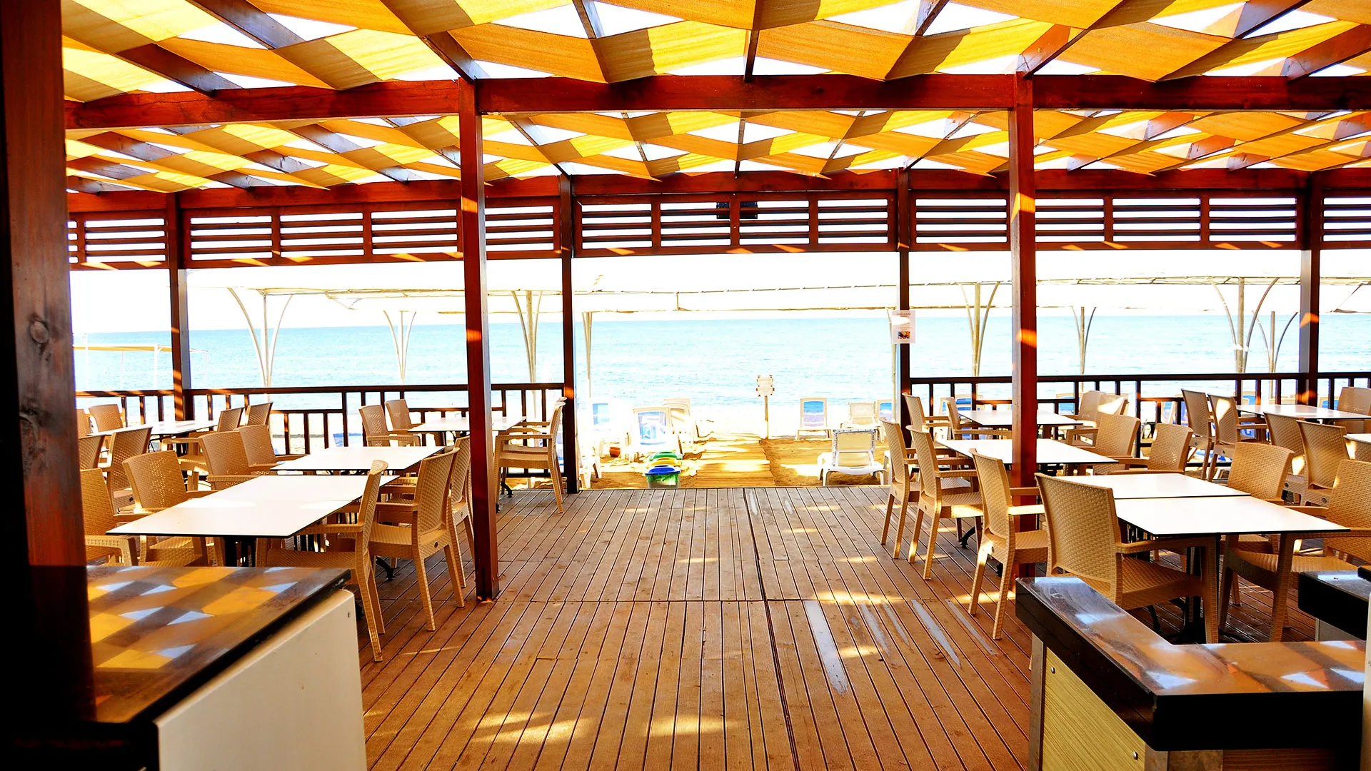 Плажът на хотела е със смес от пясък и камъчета и се намира на кратко разстояние от хотела. Шезлонги, матраци, чадъри и плажни кърпи са на разположение на гостите безплатно. На плажа има също павилион, който е срещу заплащане, и плажен бар.