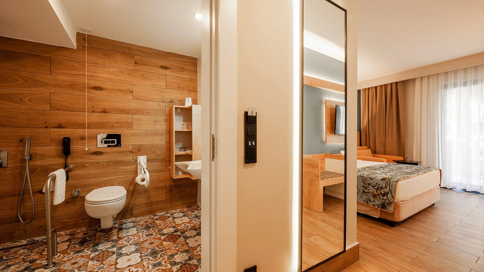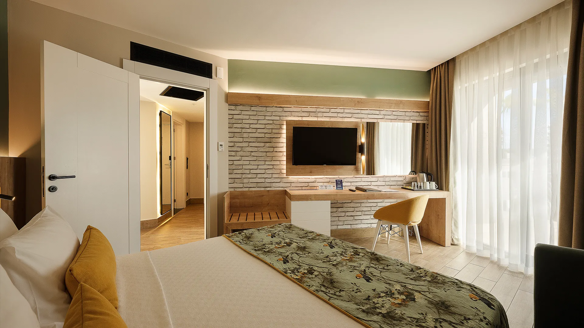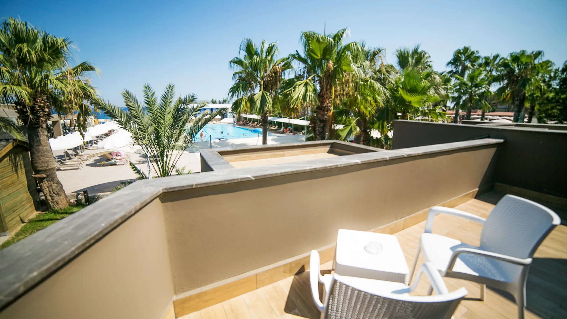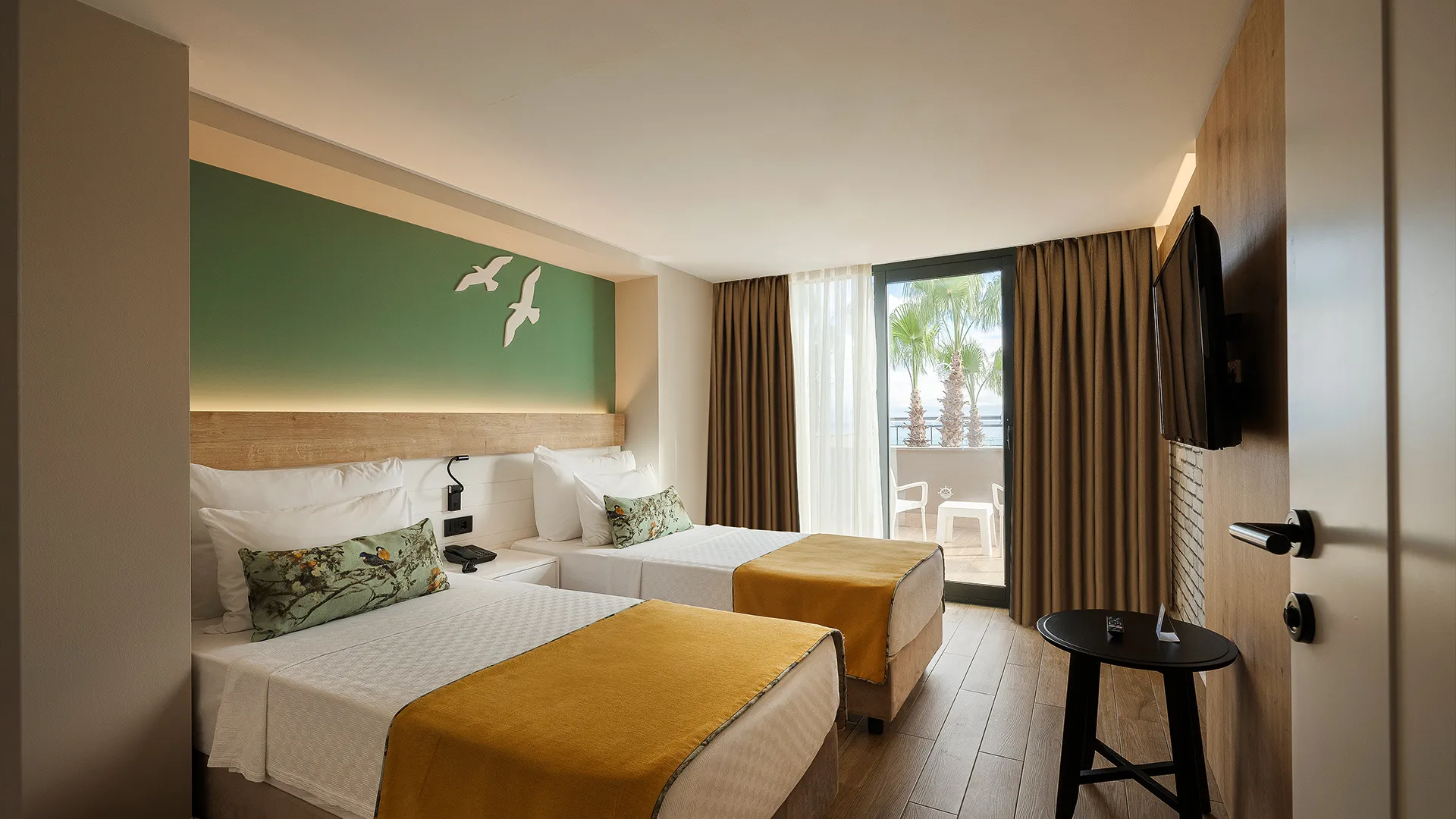 Всички стаи са климатизирани и оборудвани със сателитна телевизия и минибар. Балконът, обзаведен с два стола, предоставя удобно място за отдих и наслаждаване на изгледа. В банята има душ, сешоар и предоставени безплатни тоалетни принадлежности. Гостите могат да избират между стаи с изглед към градината или морето, в зависимост от предпочитанията си.