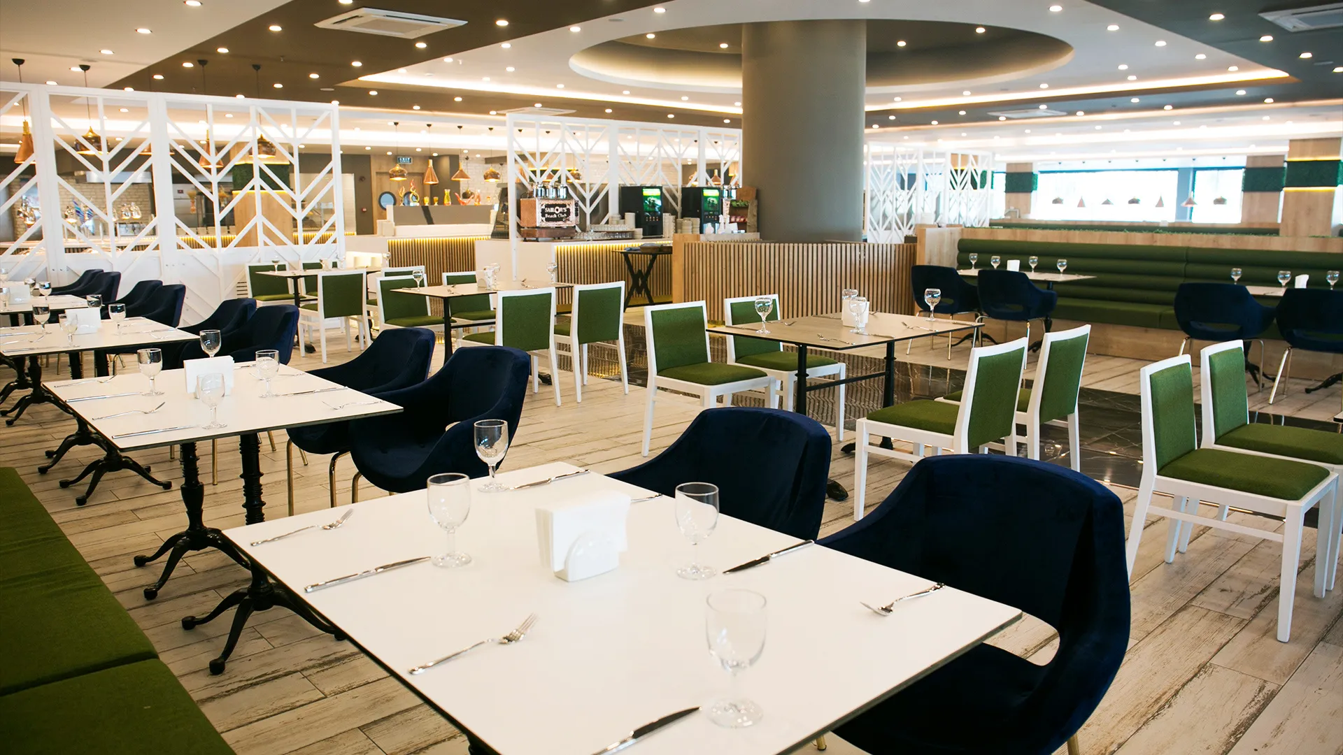 Ресторантът Savarona предлага закуска, обяд и вечеря на шведска маса, като гостите могат да се насладят на ястията както вътре, така и на открито. Хотелът разполага и с а-ла-карт ресторант, където се предлагат изискани италиански специалитети през вечерта. В двата бара на хотела гостите могат да си поръчат освежаващи напитки, а снек-барът предлага леки закуски през следобедните часове.