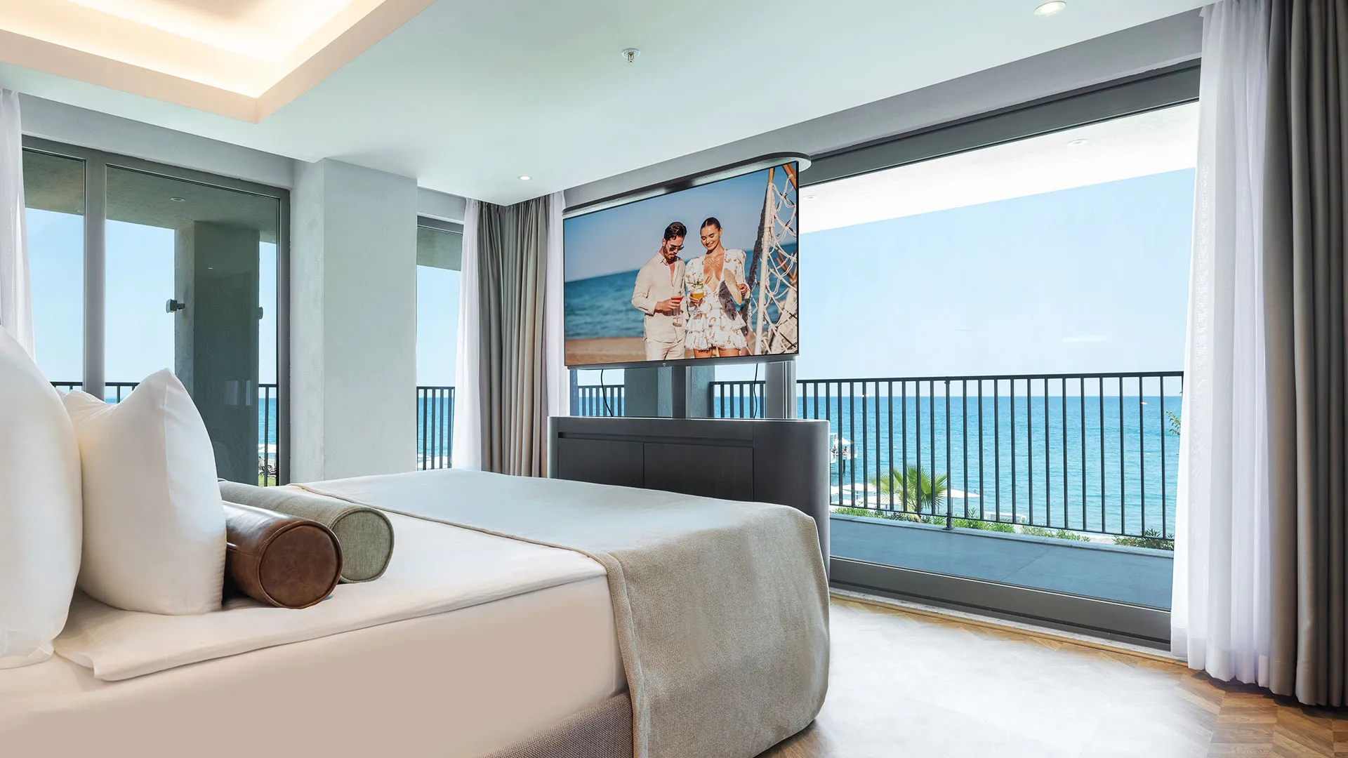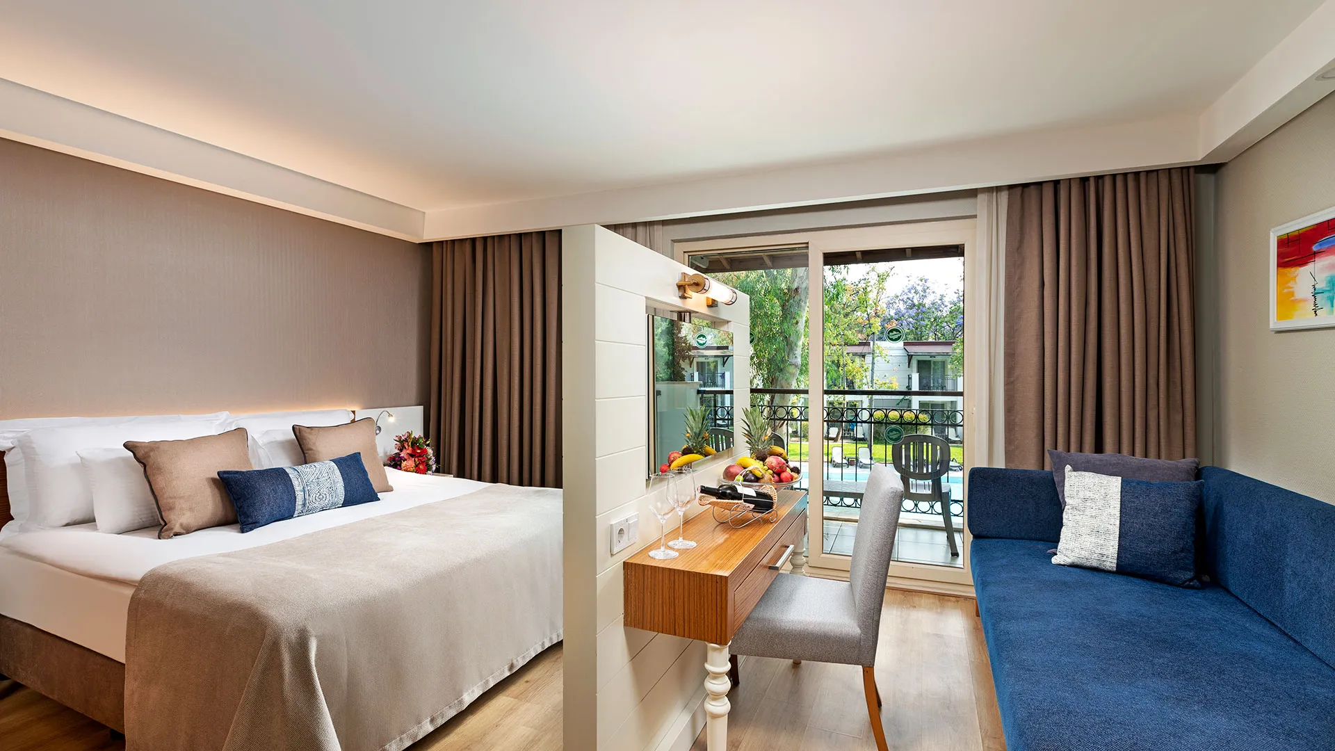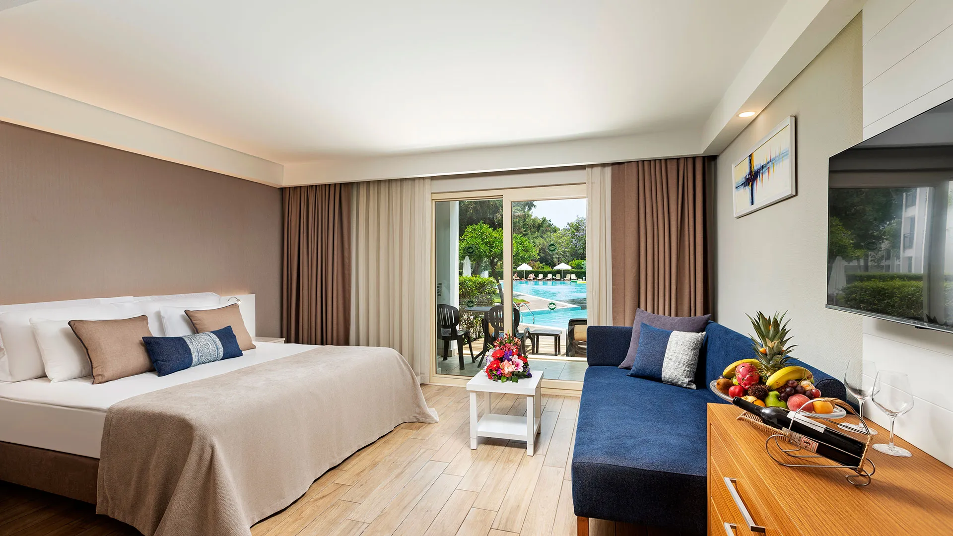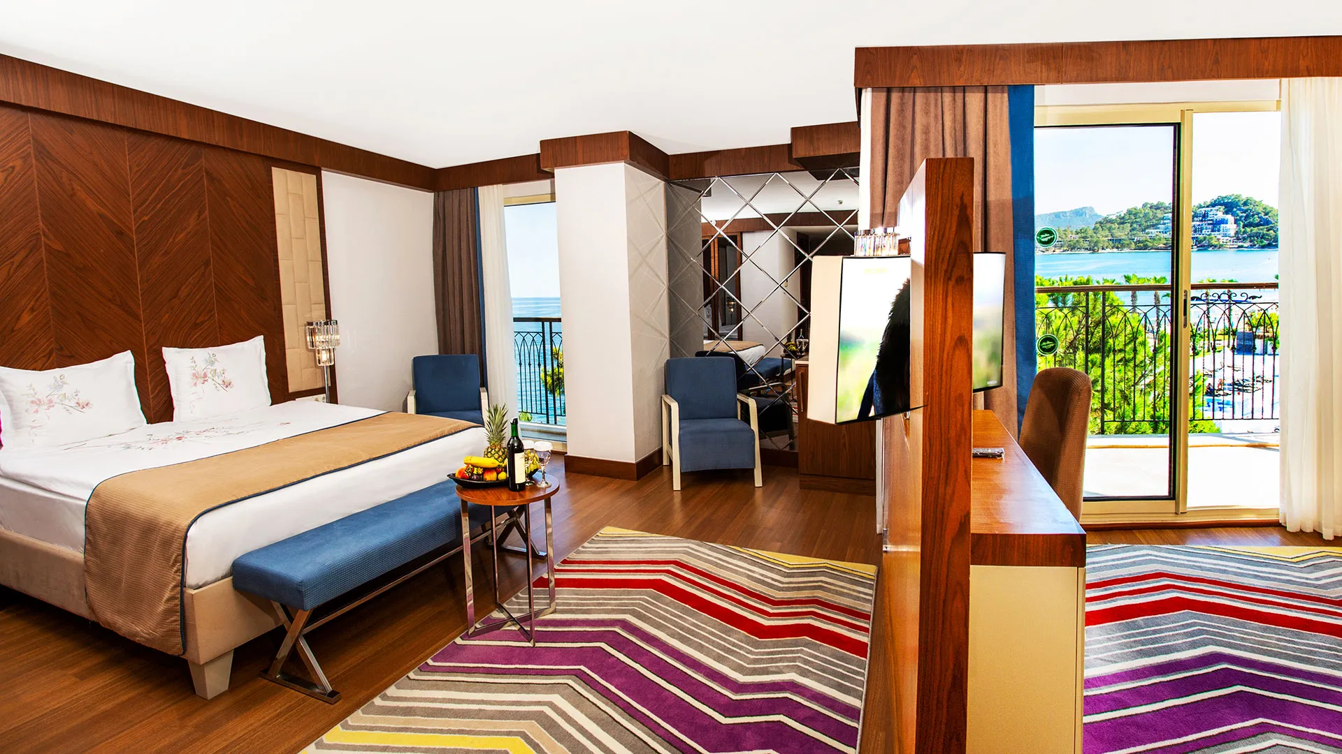 Хотелът разполага с изискани стаи и суити, обзаведени с висок клас на комфорт и елегантност. Всяка стая предлага уютна обстановка, модерни удобства и невероятна гледка към морето или градините на хотела.