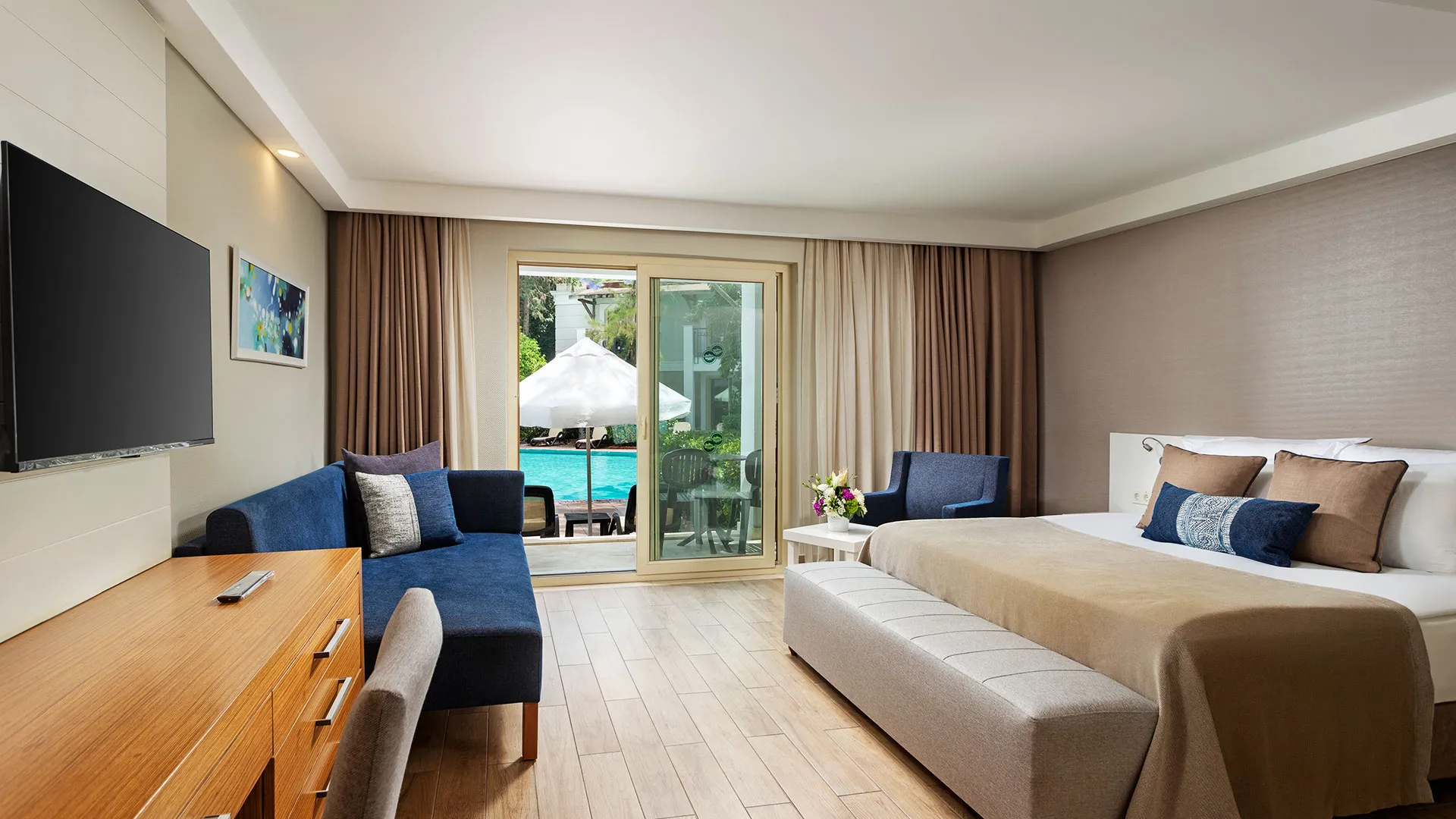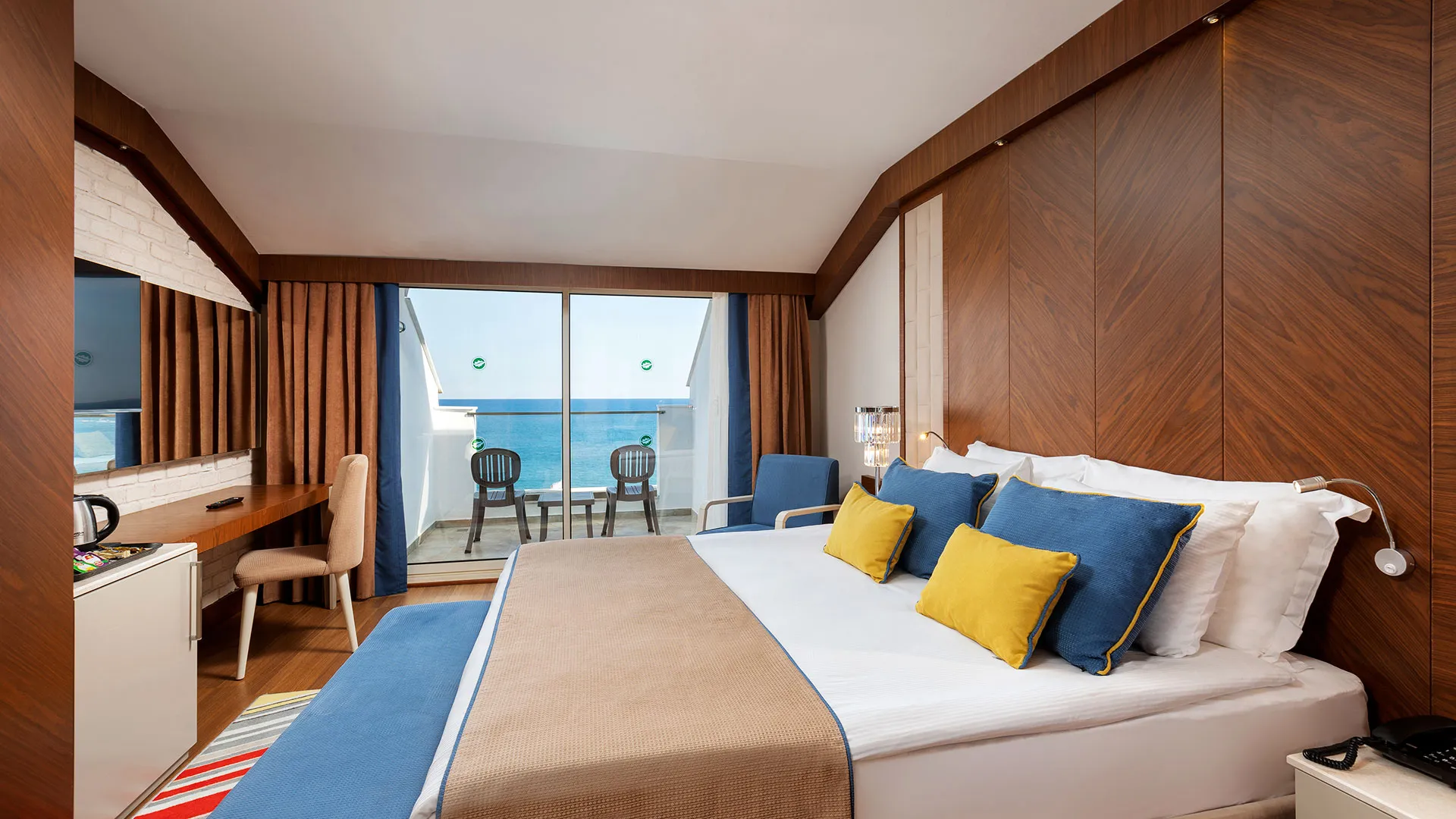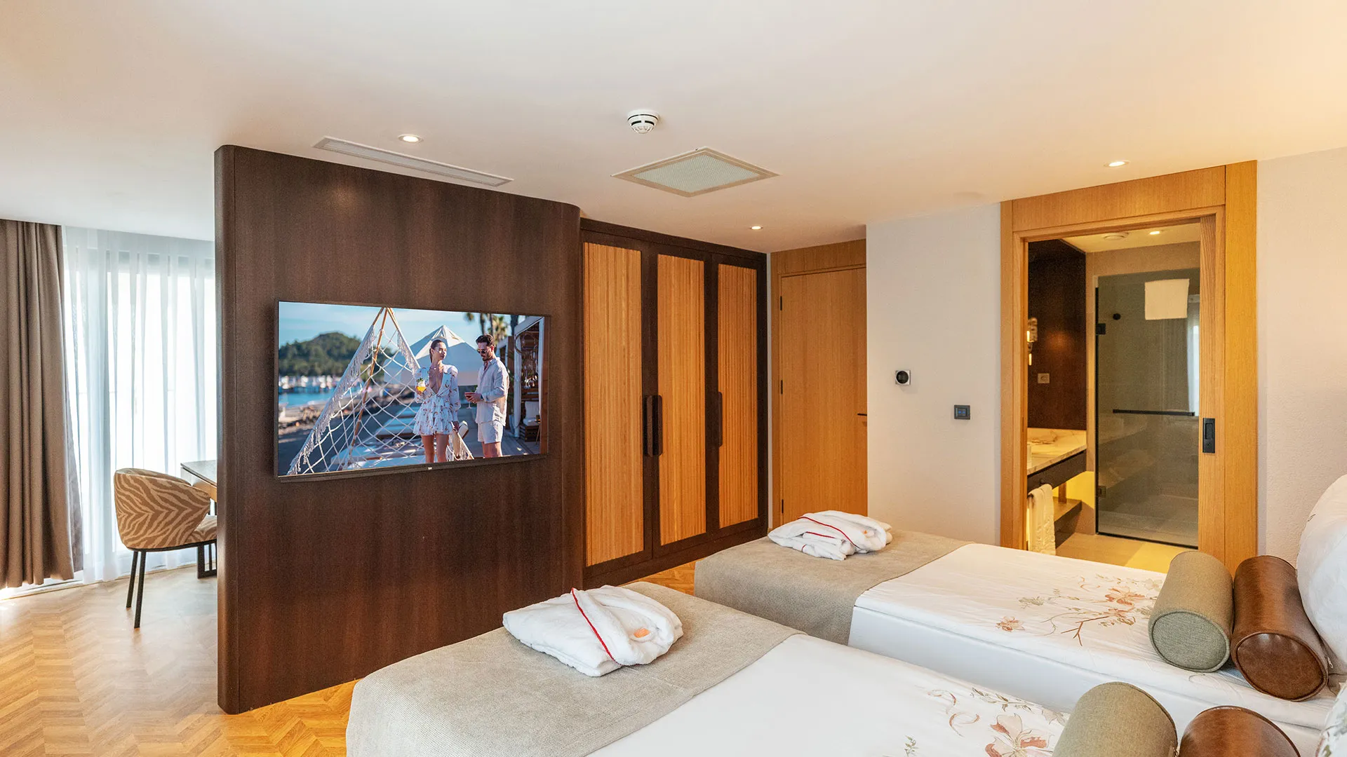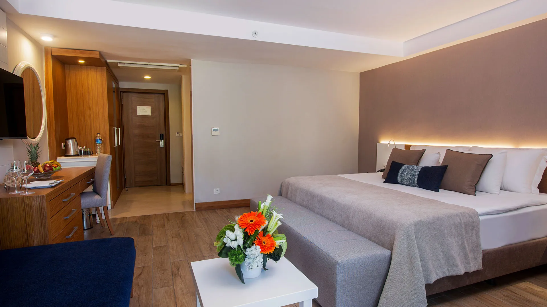 Хотелът разполага с изискани стаи и суити, обзаведени с висок клас на комфорт и елегантност. Всяка стая предлага уютна обстановка, модерни удобства и невероятна гледка към морето или градините на хотела.
