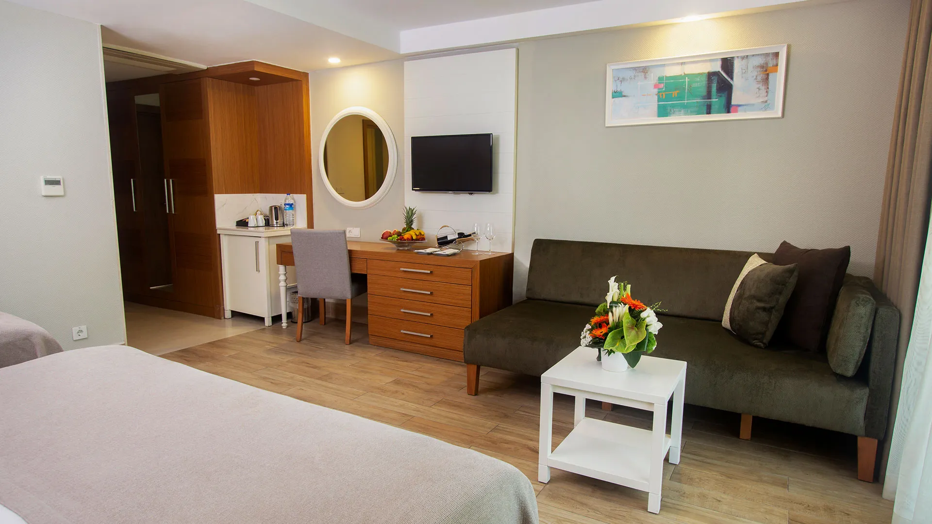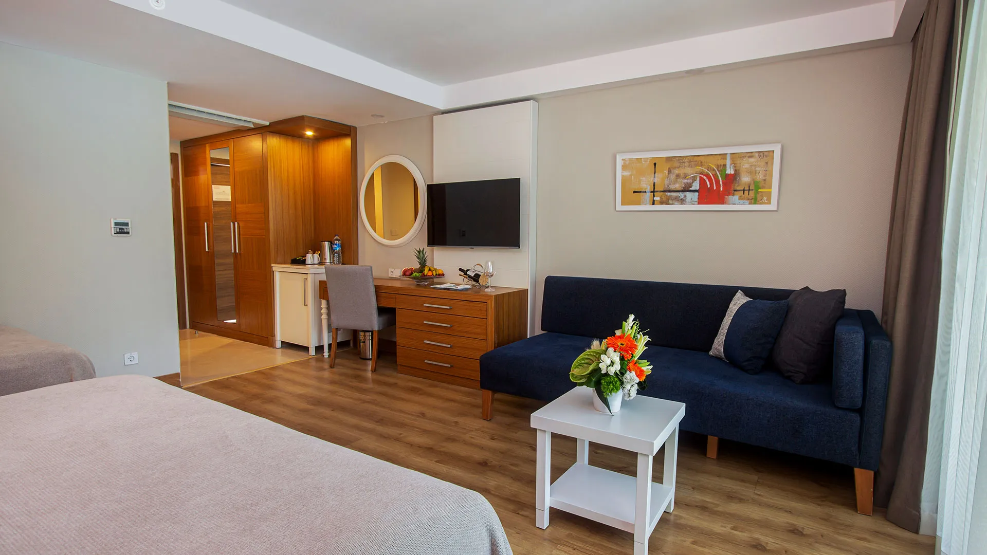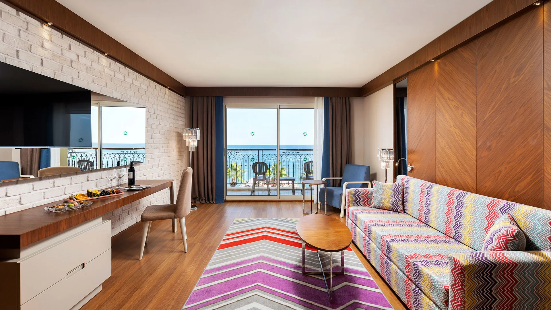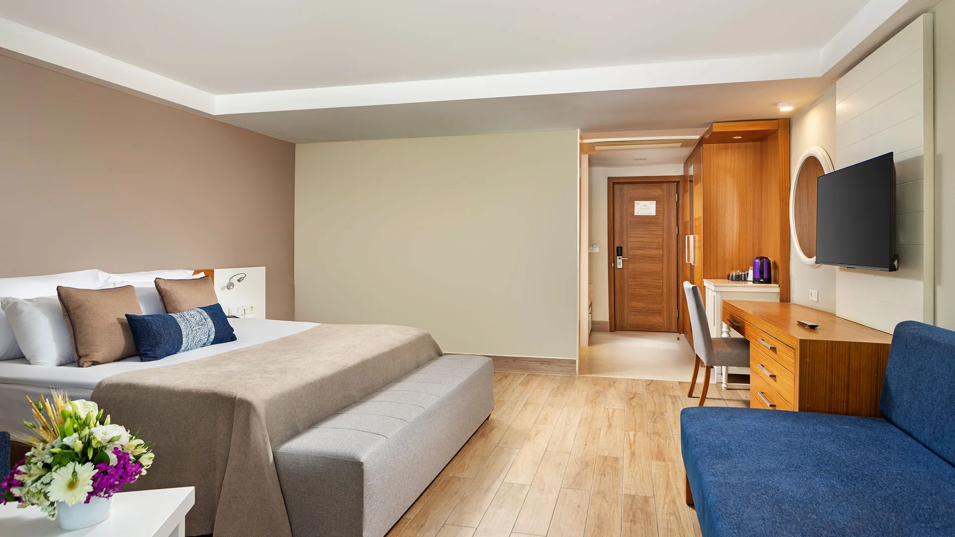 Хотелът разполага с изискани стаи и суити, обзаведени с висок клас на комфорт и елегантност. Всяка стая предлага уютна обстановка, модерни удобства и невероятна гледка към морето или градините на хотела.